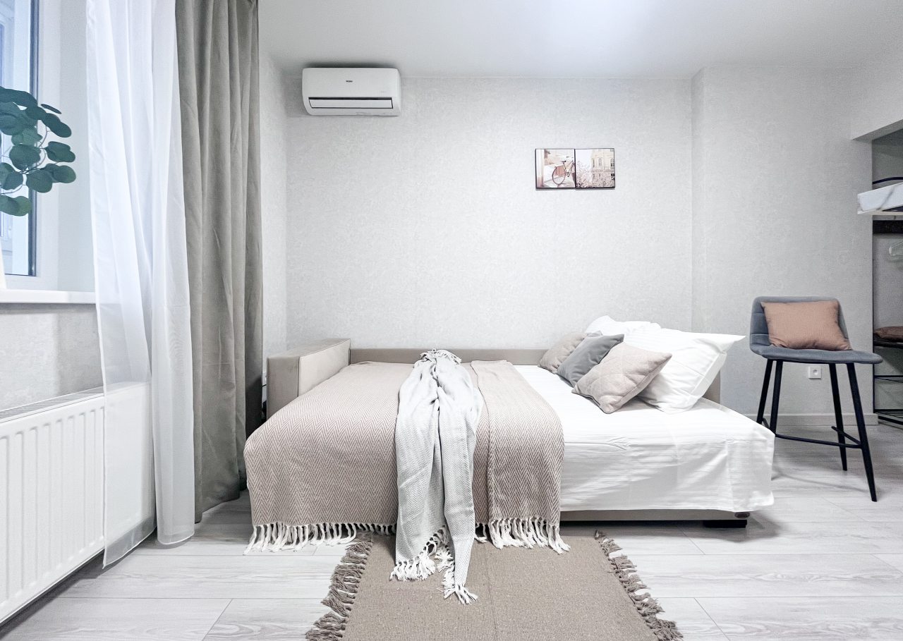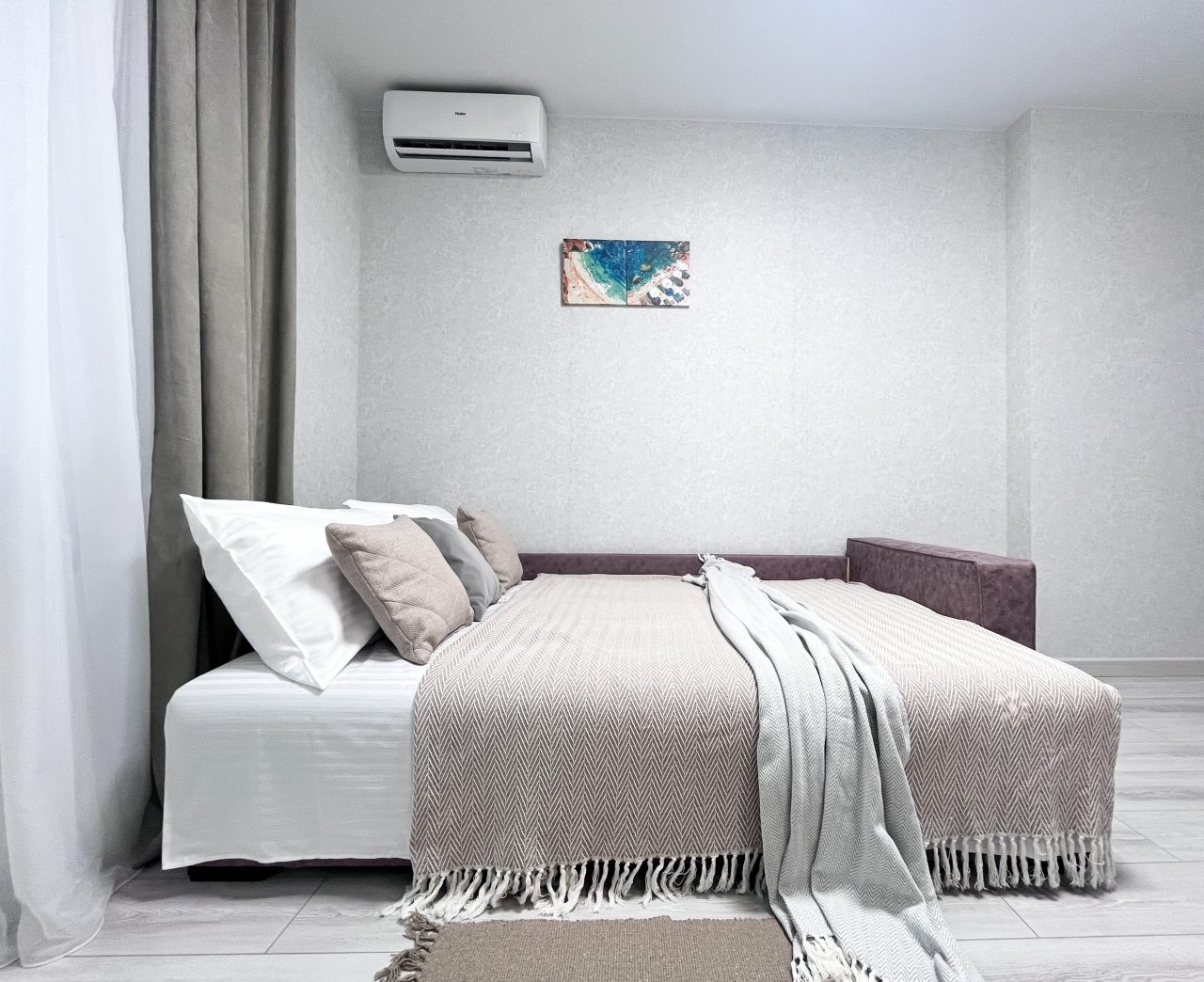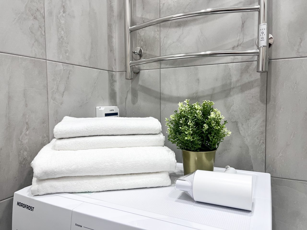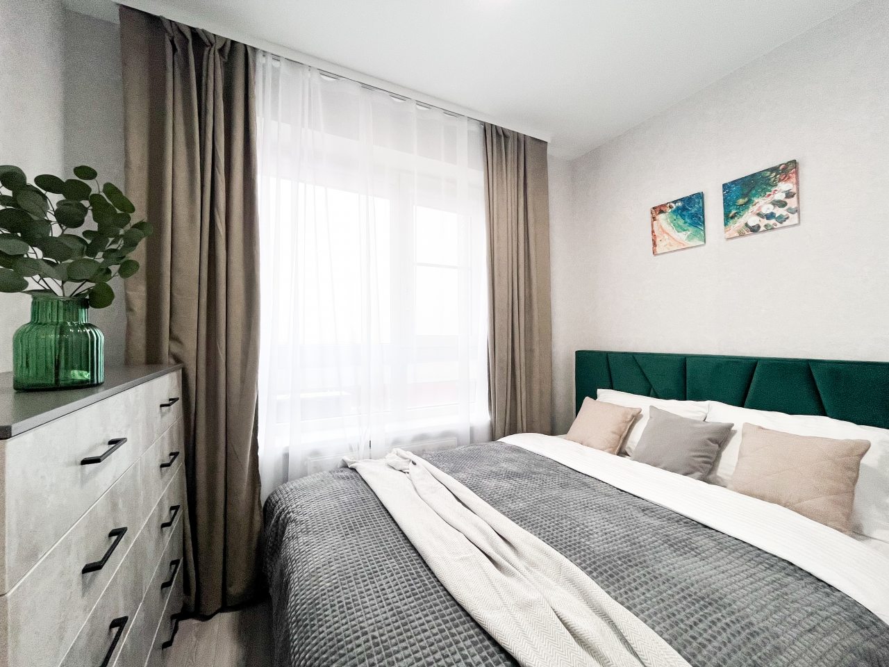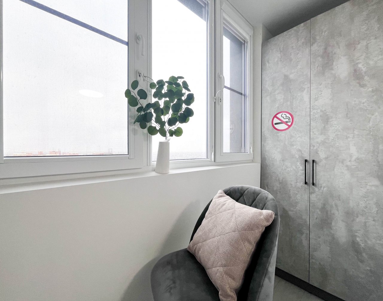 Для размещения предоставляется современная квартира, оснащенная качественной мебелью, техникой и текстилем. Из удобств установлены: телевизор, стиральная машина, кондиционер. Ванная комната оснащена косметическими средствами и набором полотенец. Имеется зона отдыха на балконе, откуда открывается вид на город.