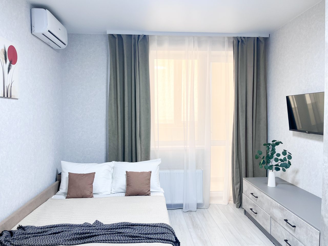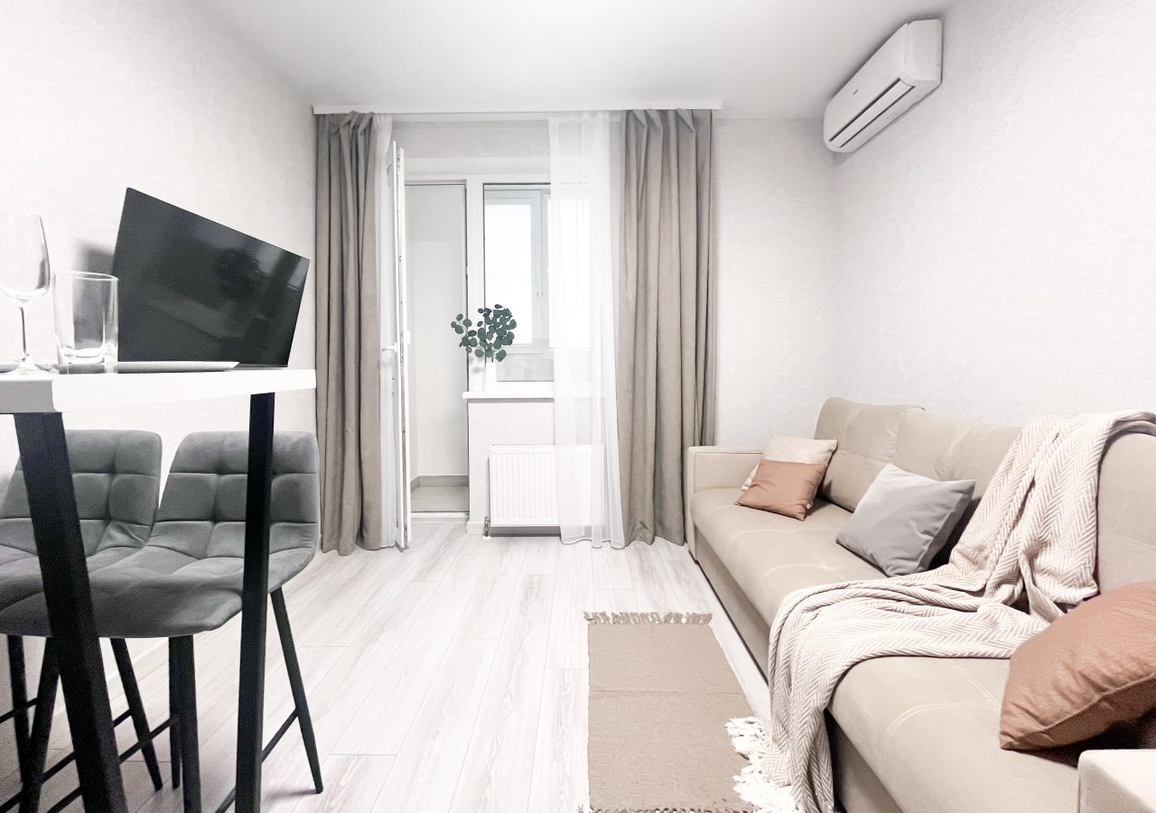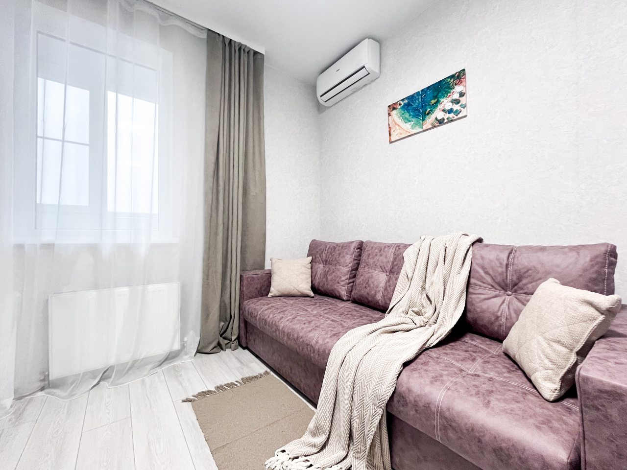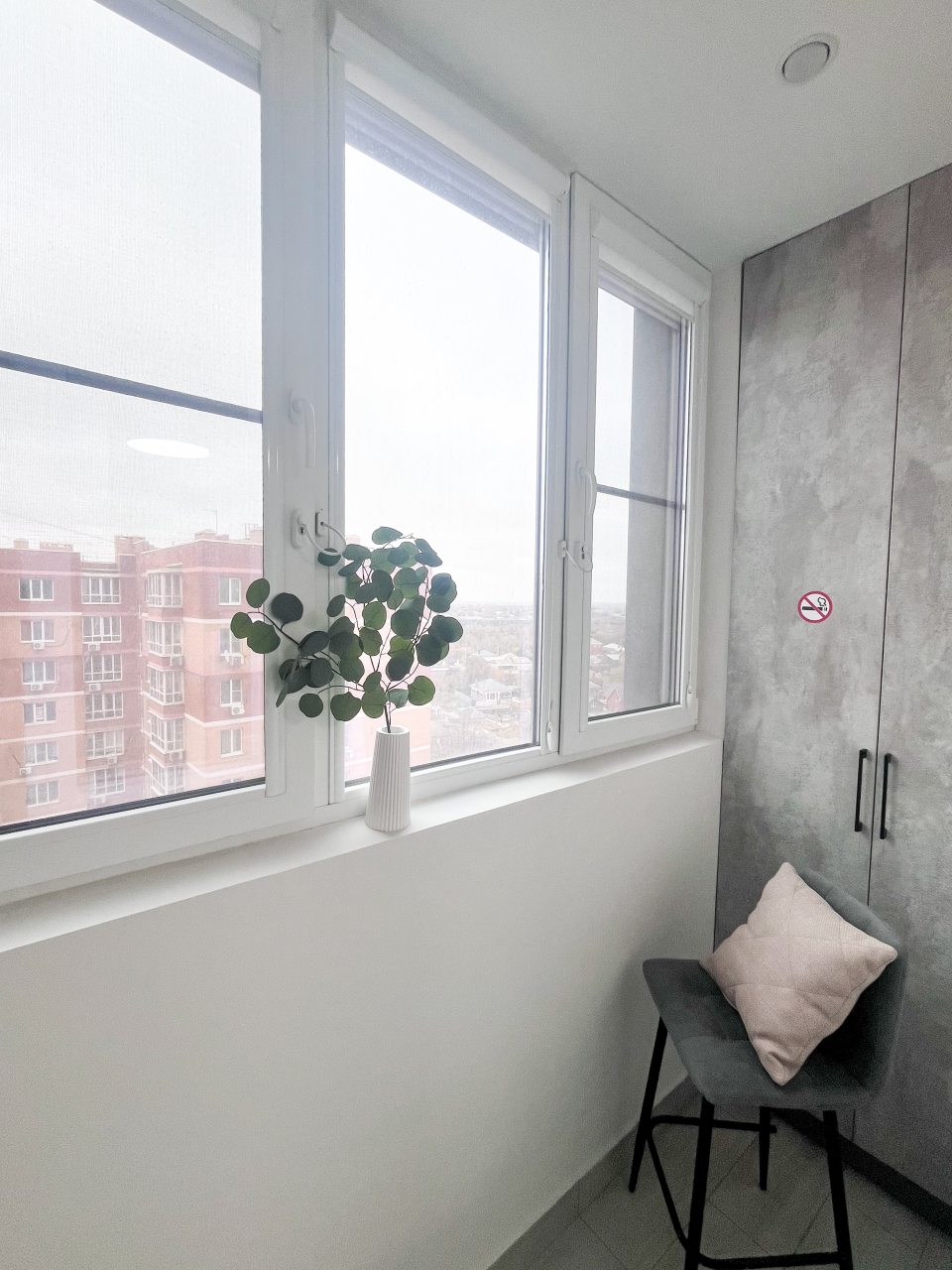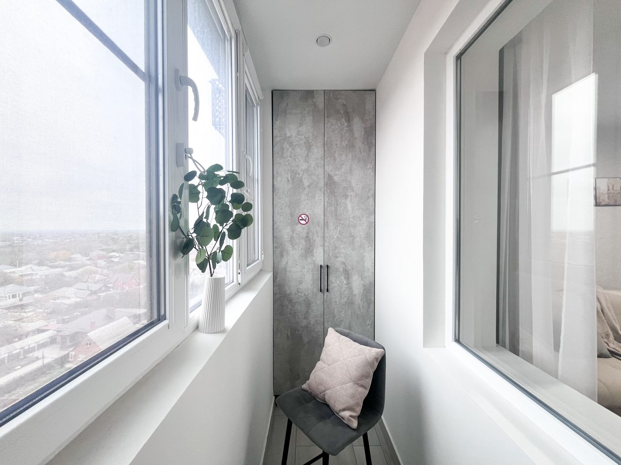 Для размещения предоставляется современная квартира, оснащенная качественной мебелью, техникой и текстилем. Из удобств установлены: телевизор, стиральная машина, кондиционер. Ванная комната оснащена косметическими средствами и набором полотенец. Имеется зона отдыха на балконе, откуда открывается вид на город.