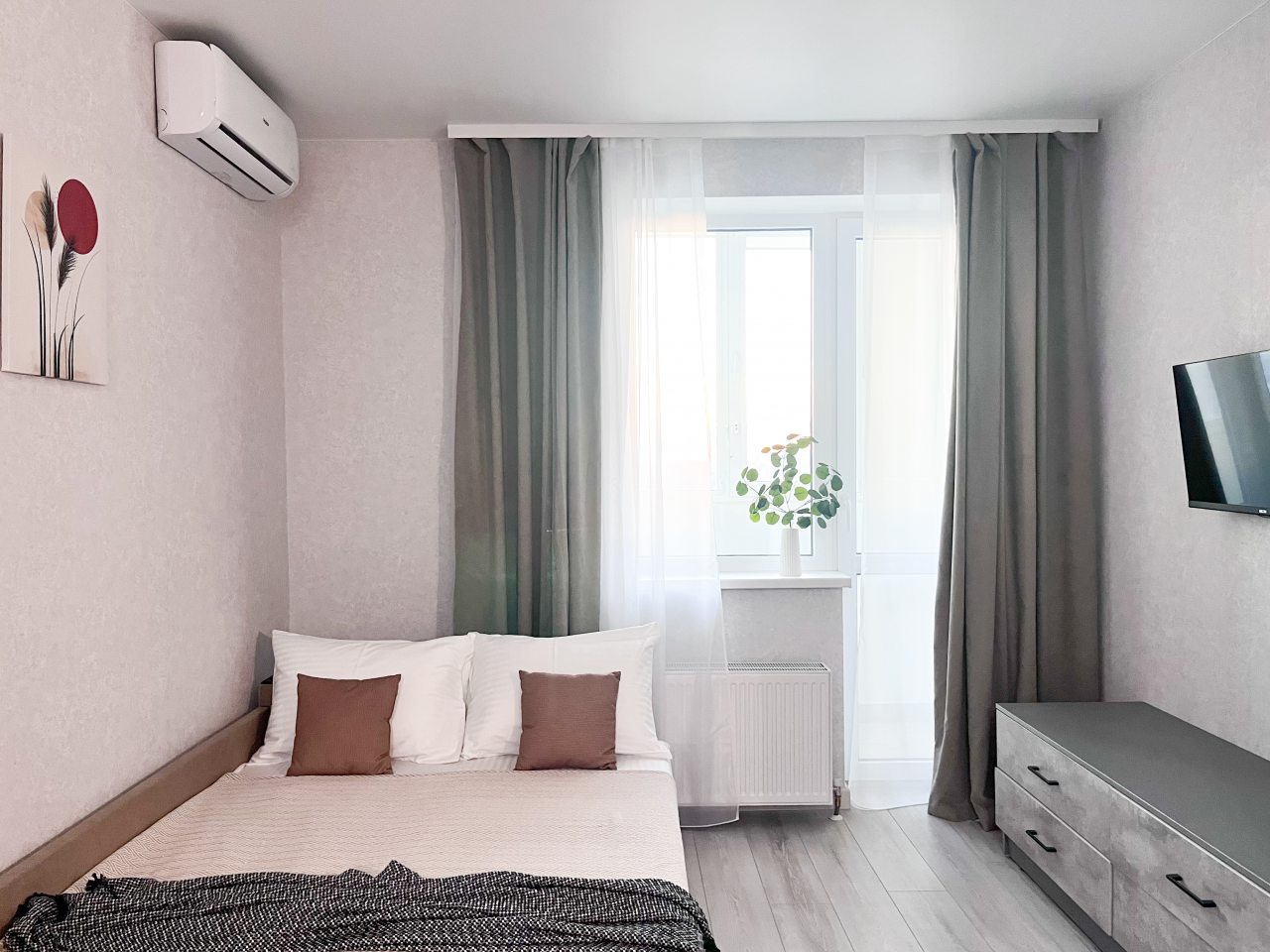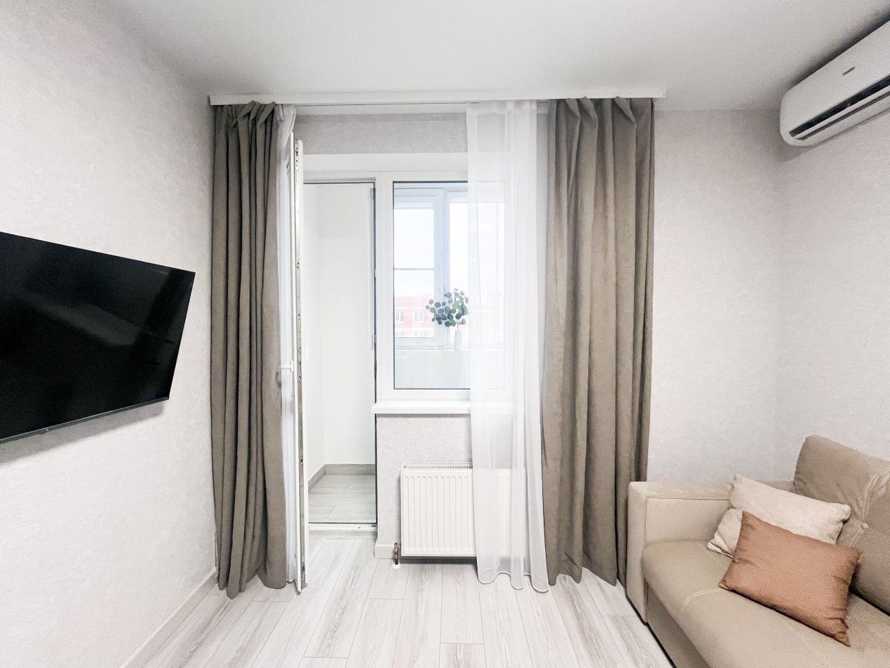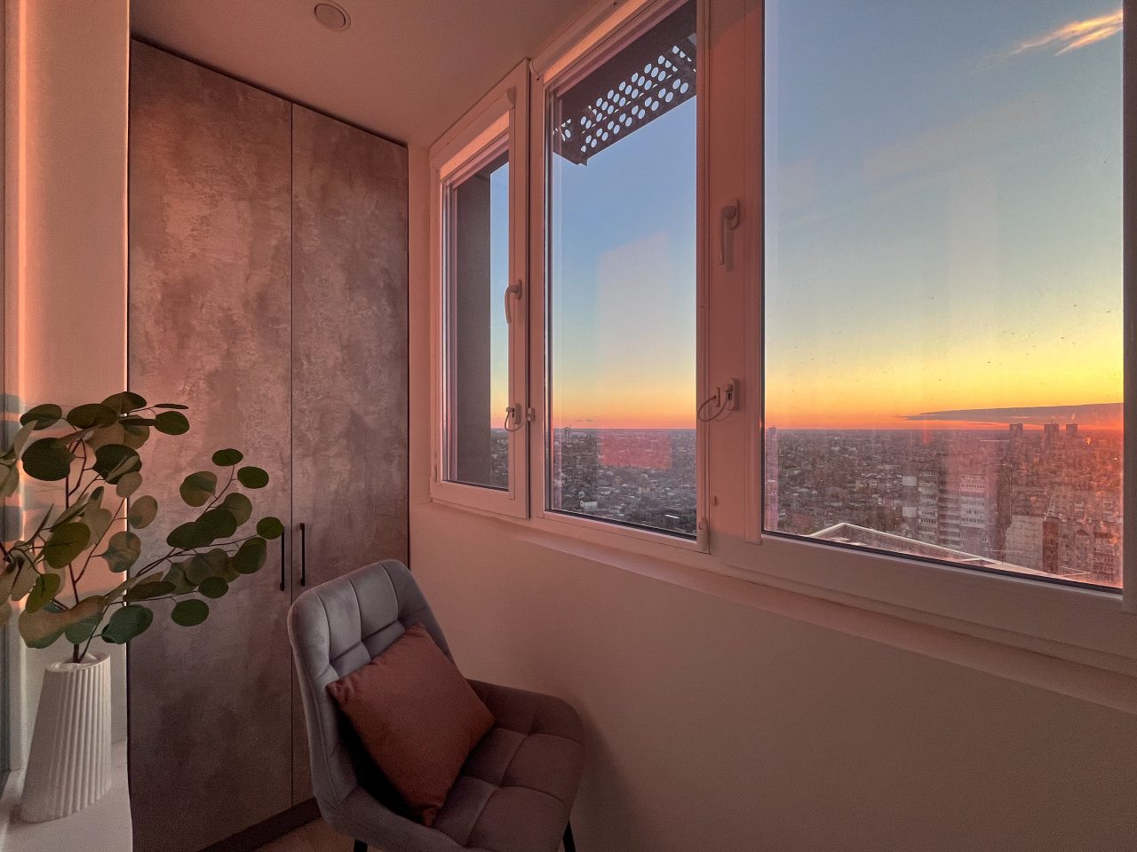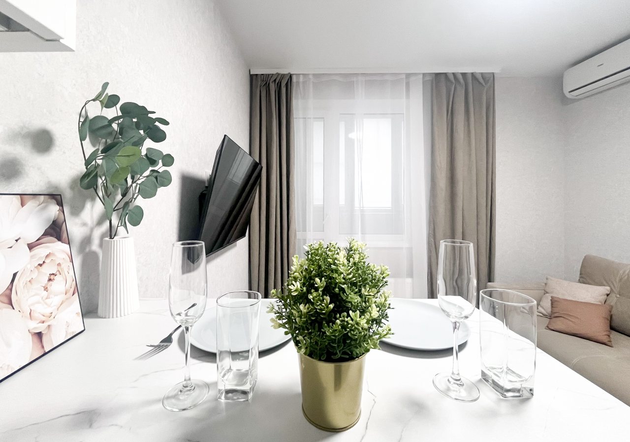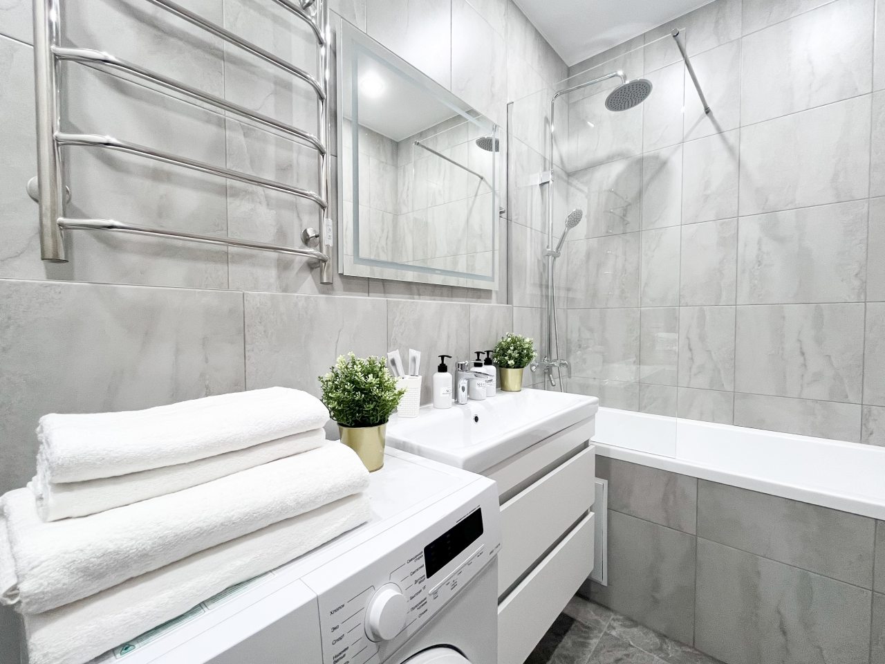 Для размещения предоставляется современная квартира, оснащенная качественной мебелью, техникой и текстилем. Из удобств установлены: телевизор, стиральная машина, кондиционер. Ванная комната оснащена косметическими средствами и набором полотенец. Имеется зона отдыха на балконе, откуда открывается вид на город.