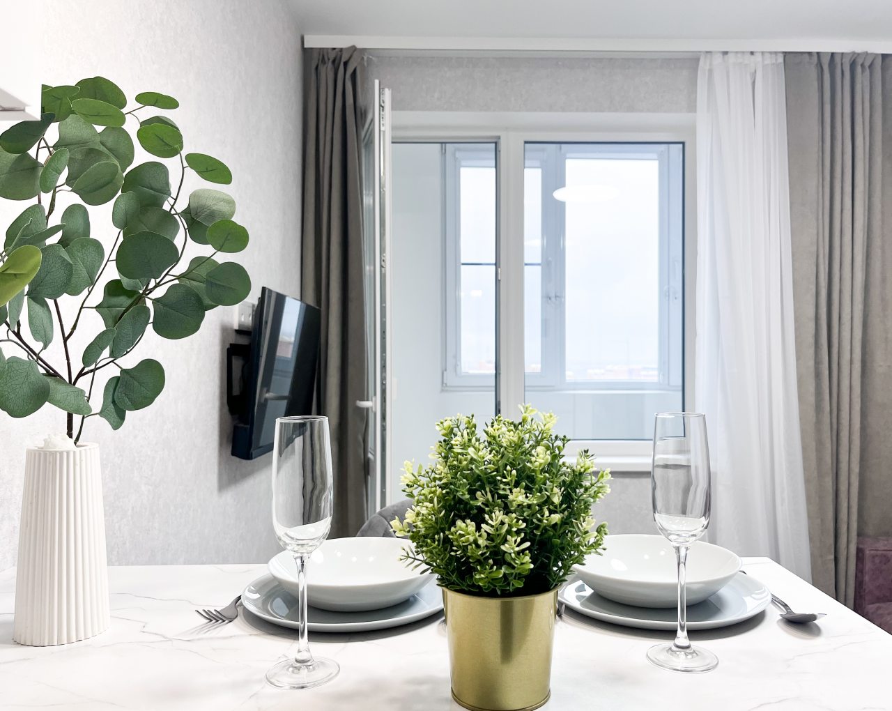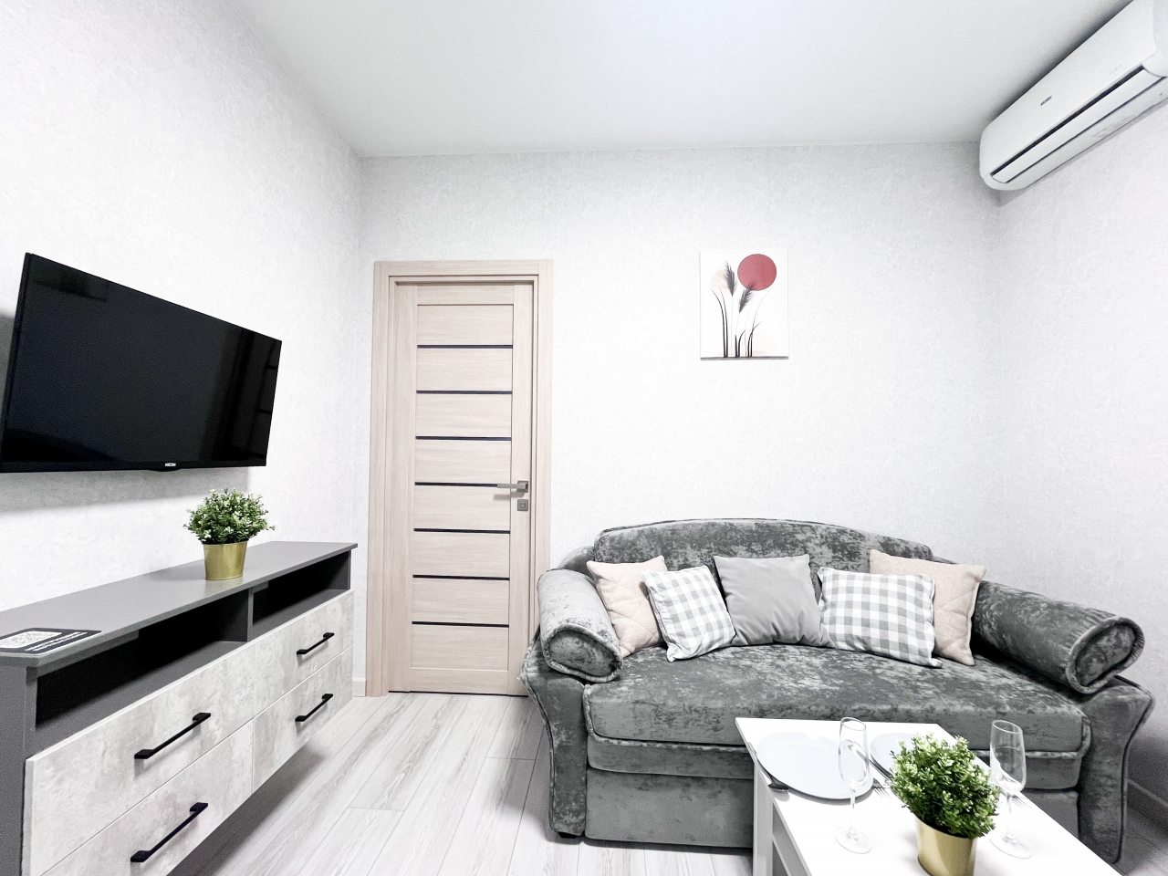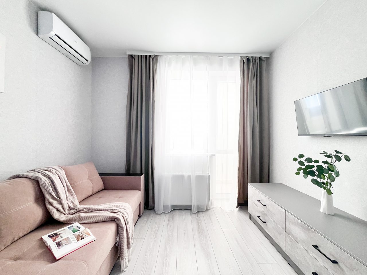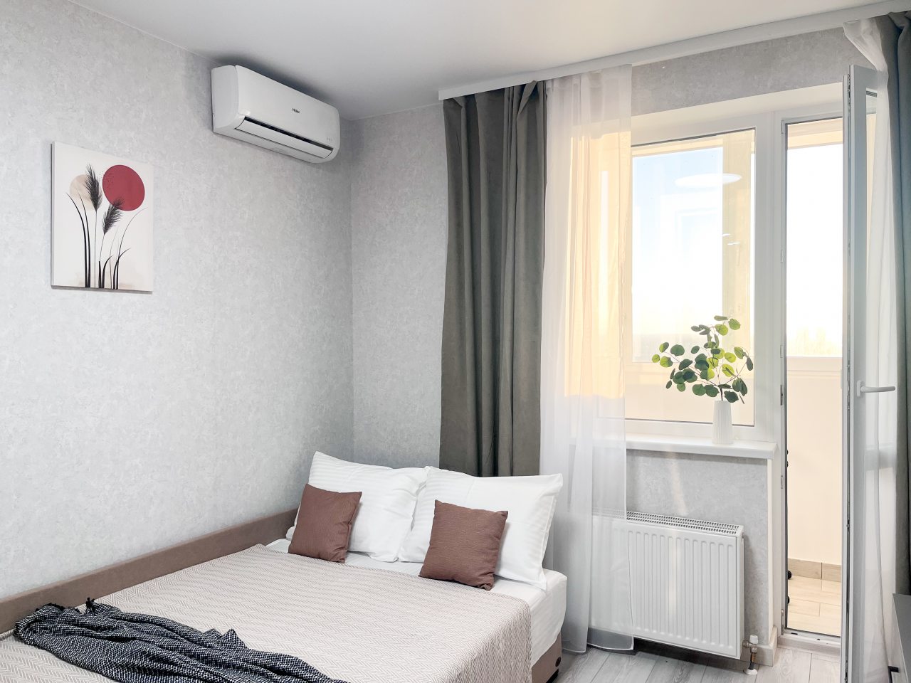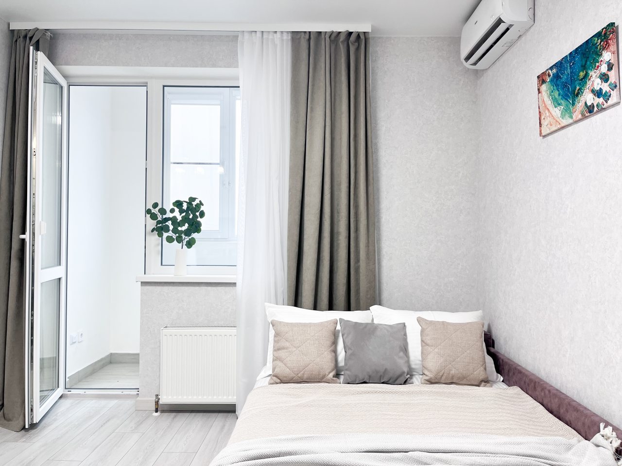 Для размещения предоставляется современная квартира, оснащенная качественной мебелью, техникой и текстилем. Из удобств установлены: телевизор, стиральная машина, кондиционер. Ванная комната оснащена косметическими средствами и набором полотенец. Имеется зона отдыха на балконе, откуда открывается вид на город.