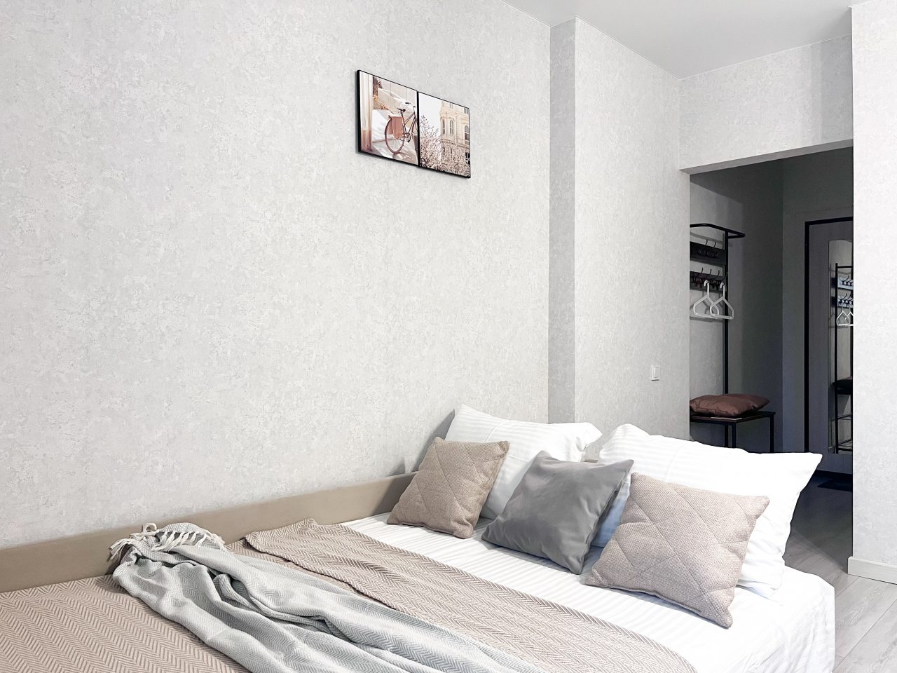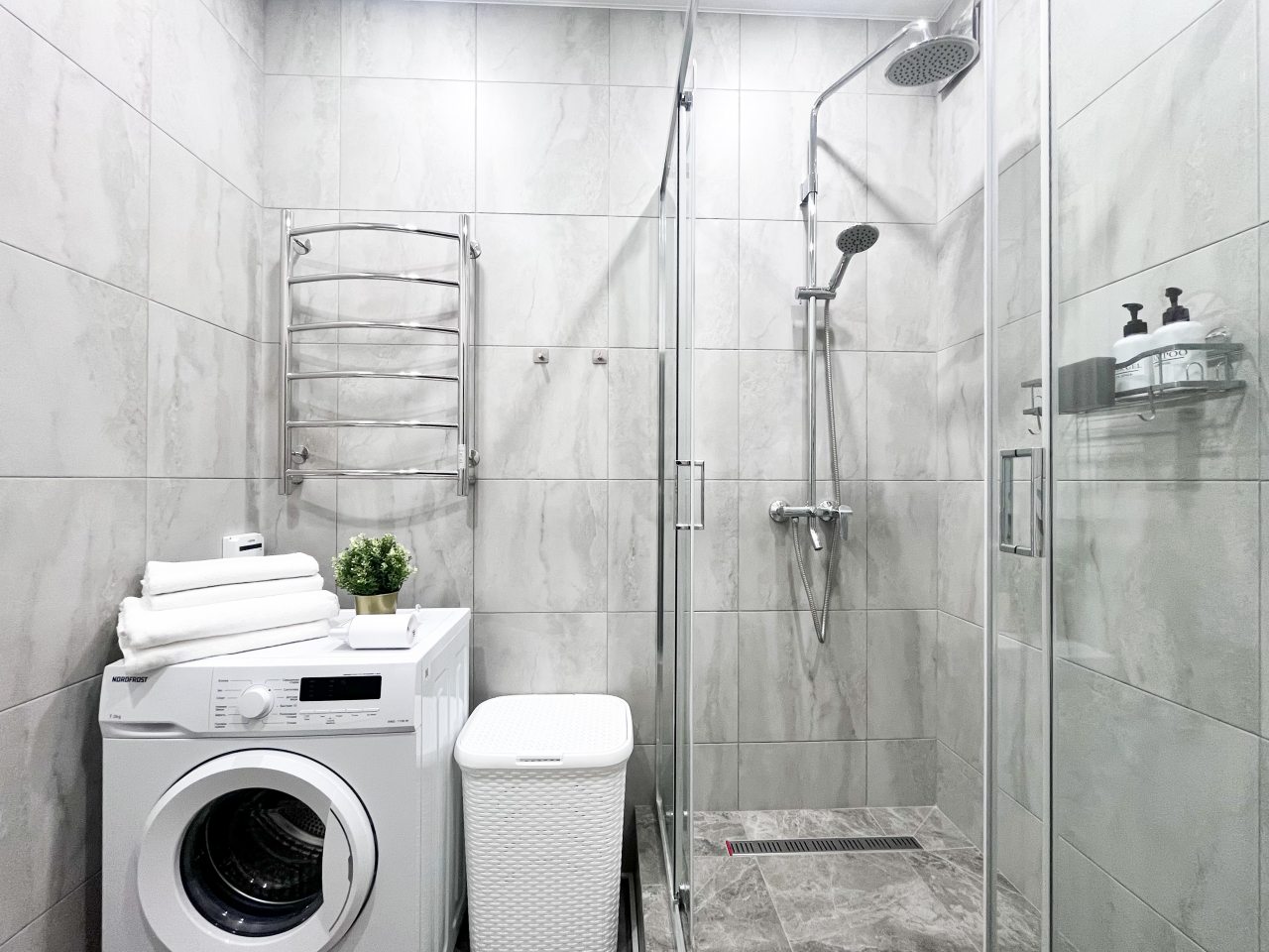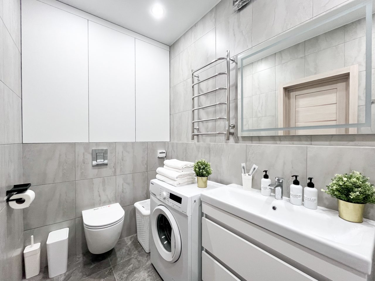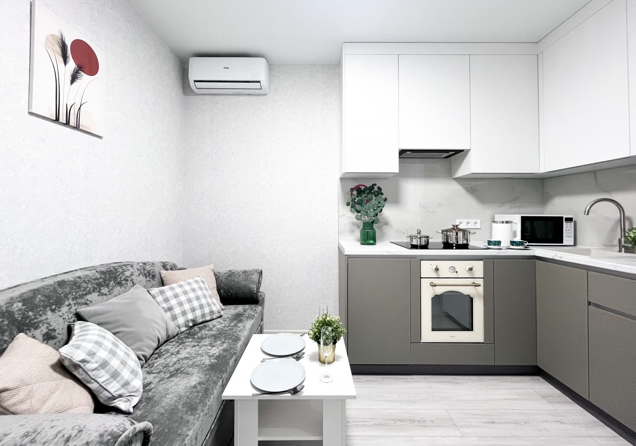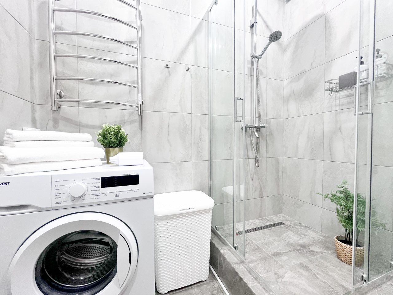 Для размещения предоставляется современная квартира, оснащенная качественной мебелью, техникой и текстилем. Из удобств установлены: телевизор, стиральная машина, кондиционер. Ванная комната оснащена косметическими средствами и набором полотенец. Имеется зона отдыха на балконе, откуда открывается вид на город.