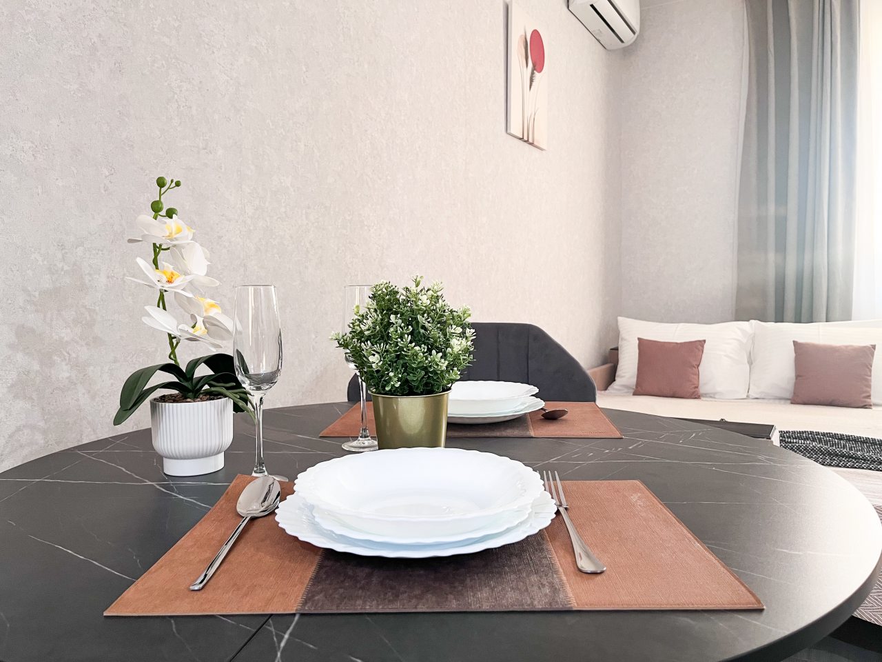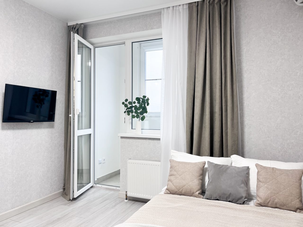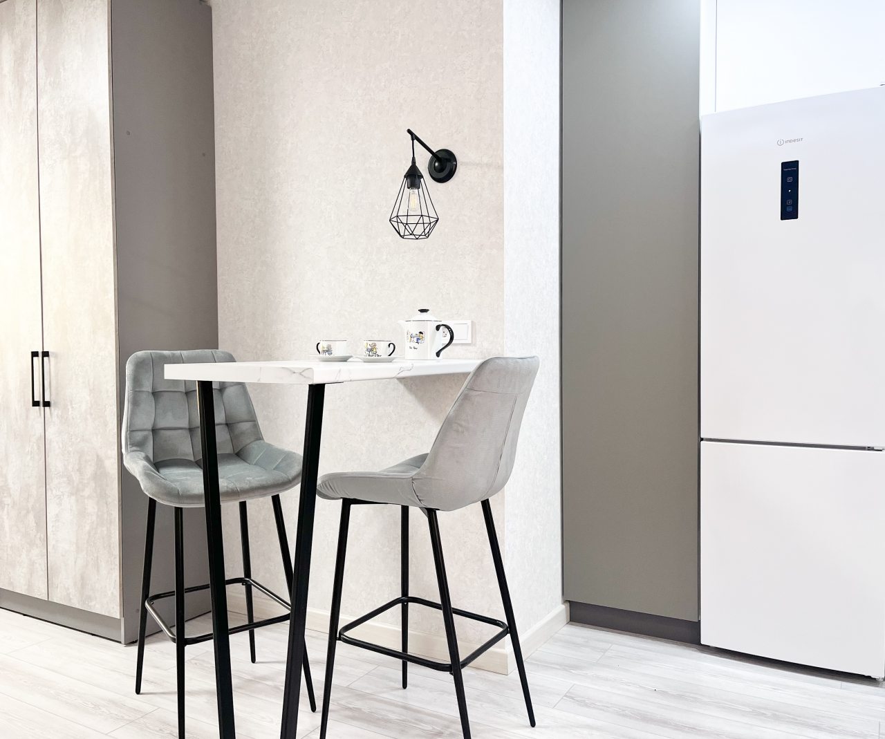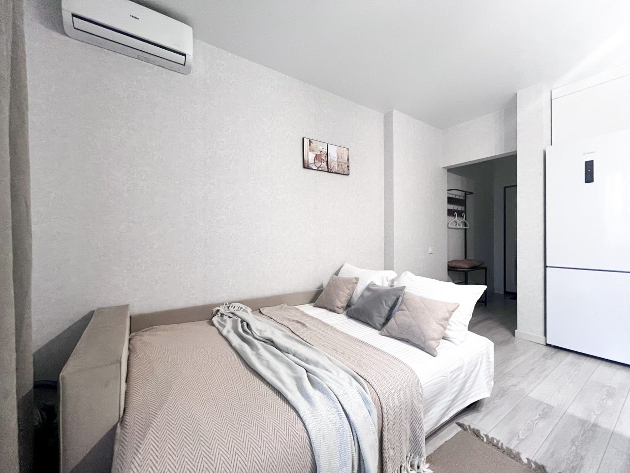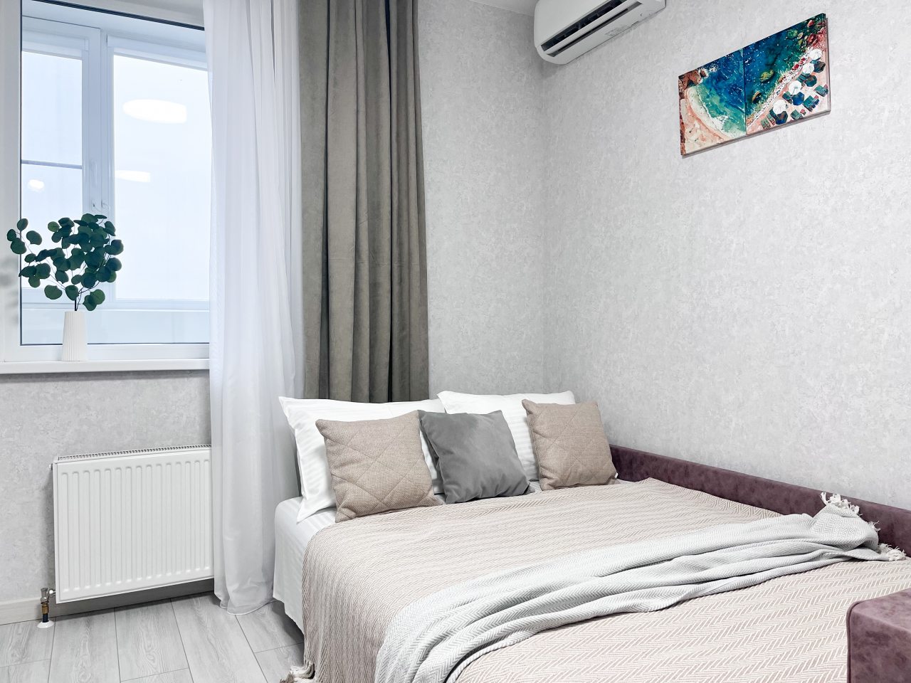 Для размещения предоставляется современная квартира, оснащенная качественной мебелью, техникой и текстилем. Из удобств установлены: телевизор, стиральная машина, кондиционер. Ванная комната оснащена косметическими средствами и набором полотенец. Имеется зона отдыха на балконе, откуда открывается вид на город.