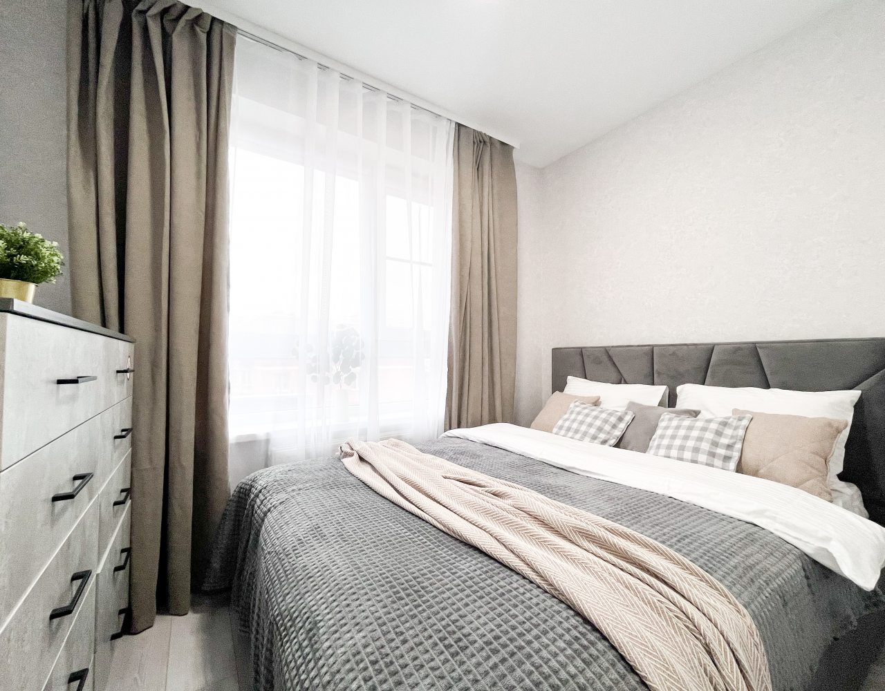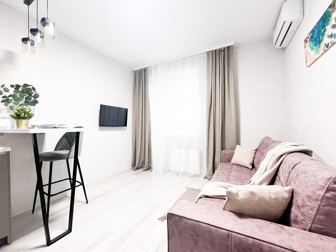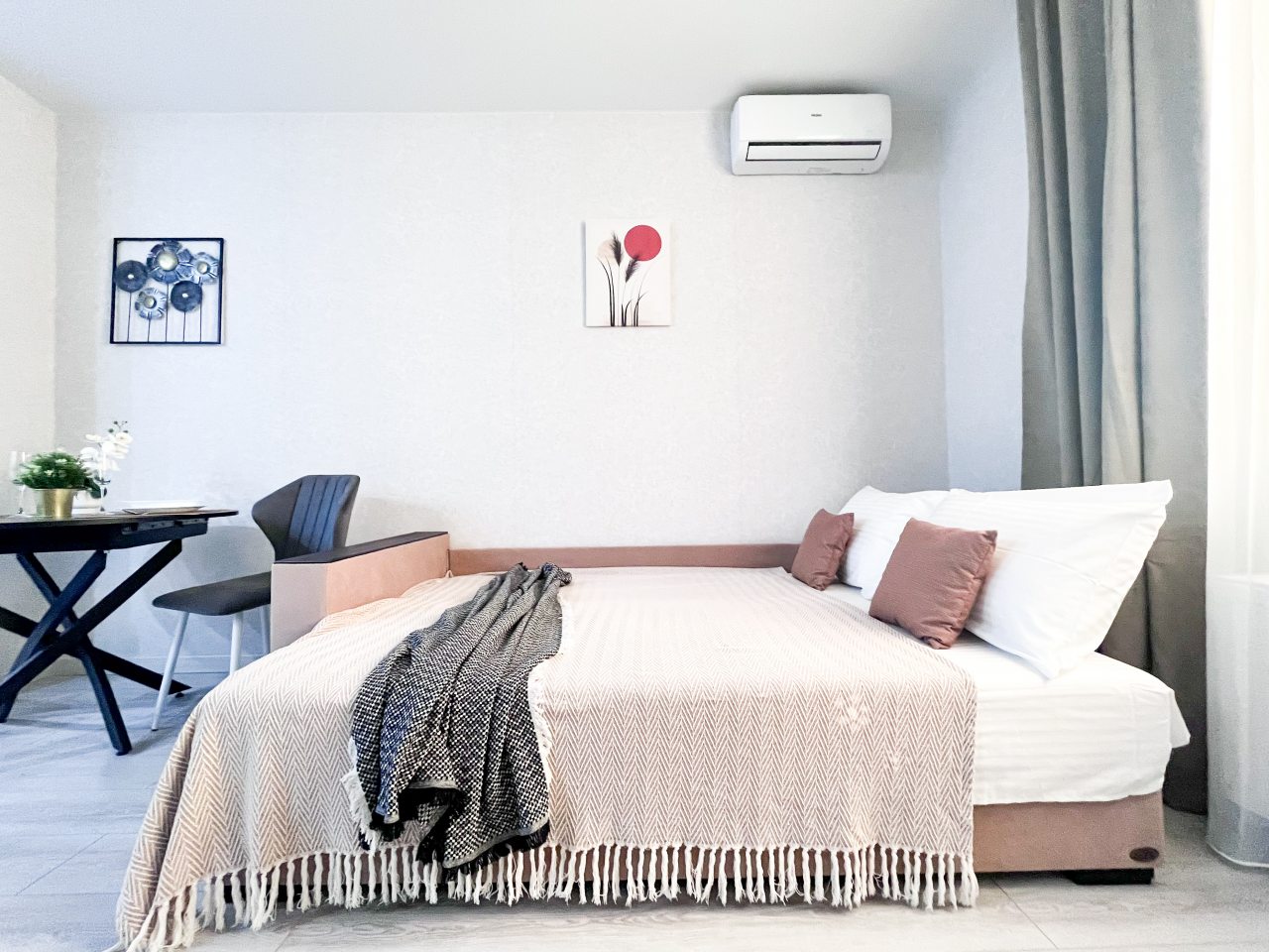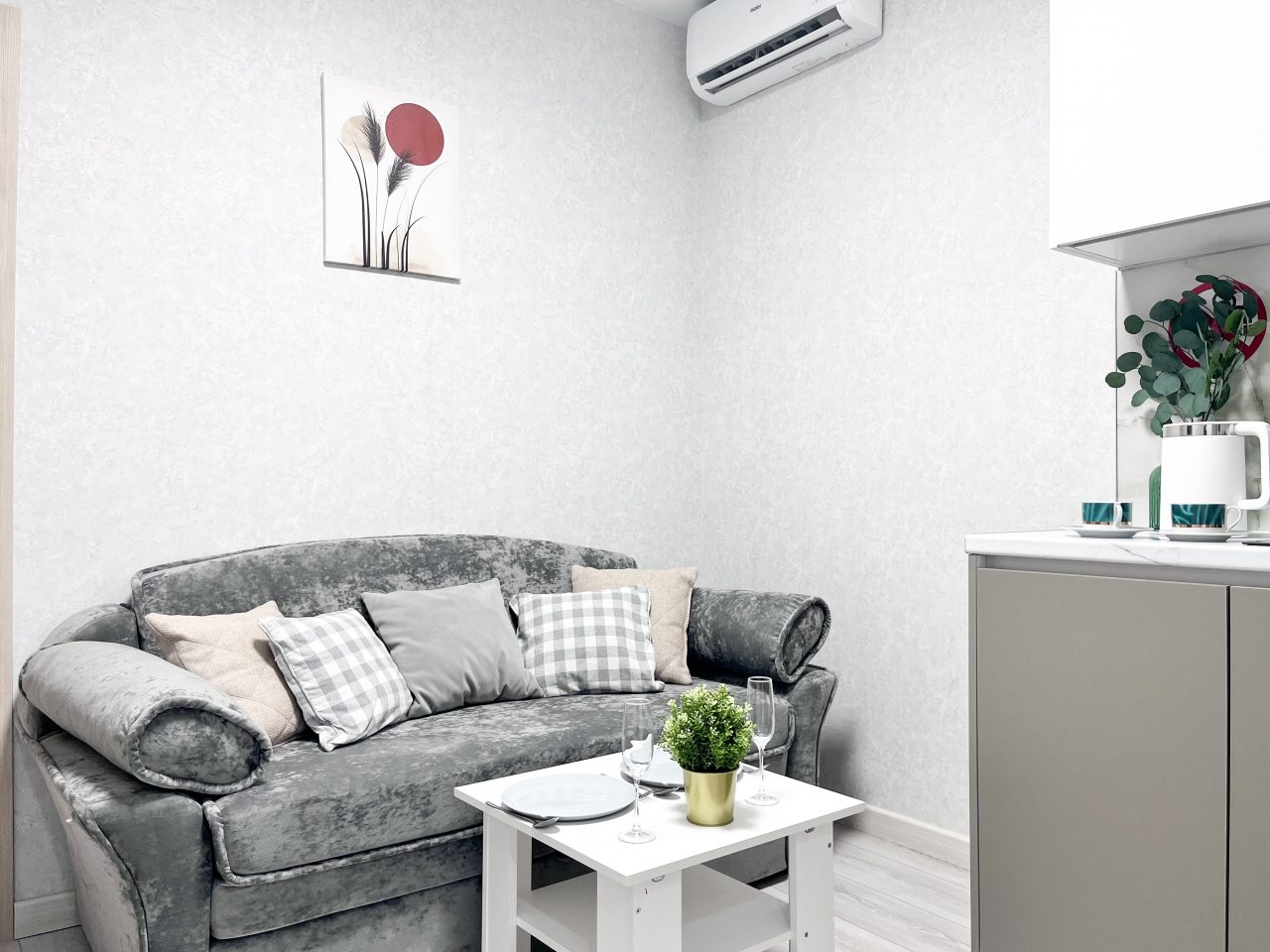 Для размещения предоставляется современная квартира, оснащенная качественной мебелью, техникой и текстилем. Из удобств установлены: телевизор, стиральная машина, кондиционер. Ванная комната оснащена косметическими средствами и набором полотенец. Имеется зона отдыха на балконе, откуда открывается вид на город.