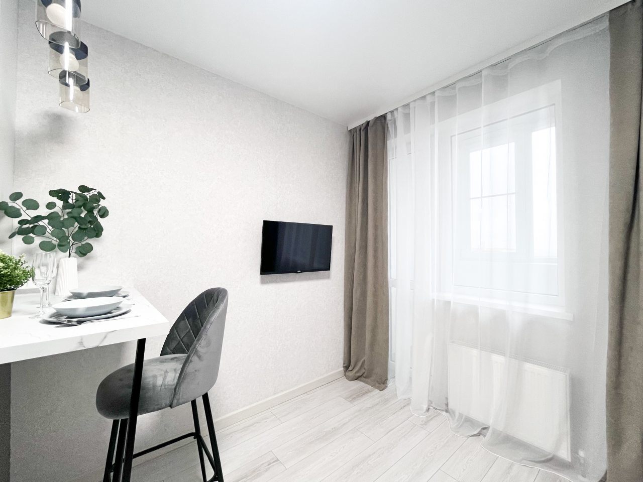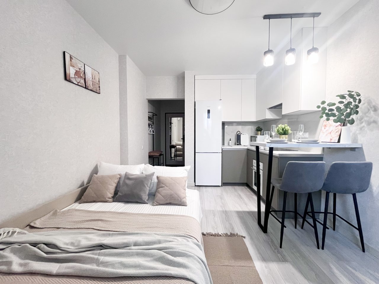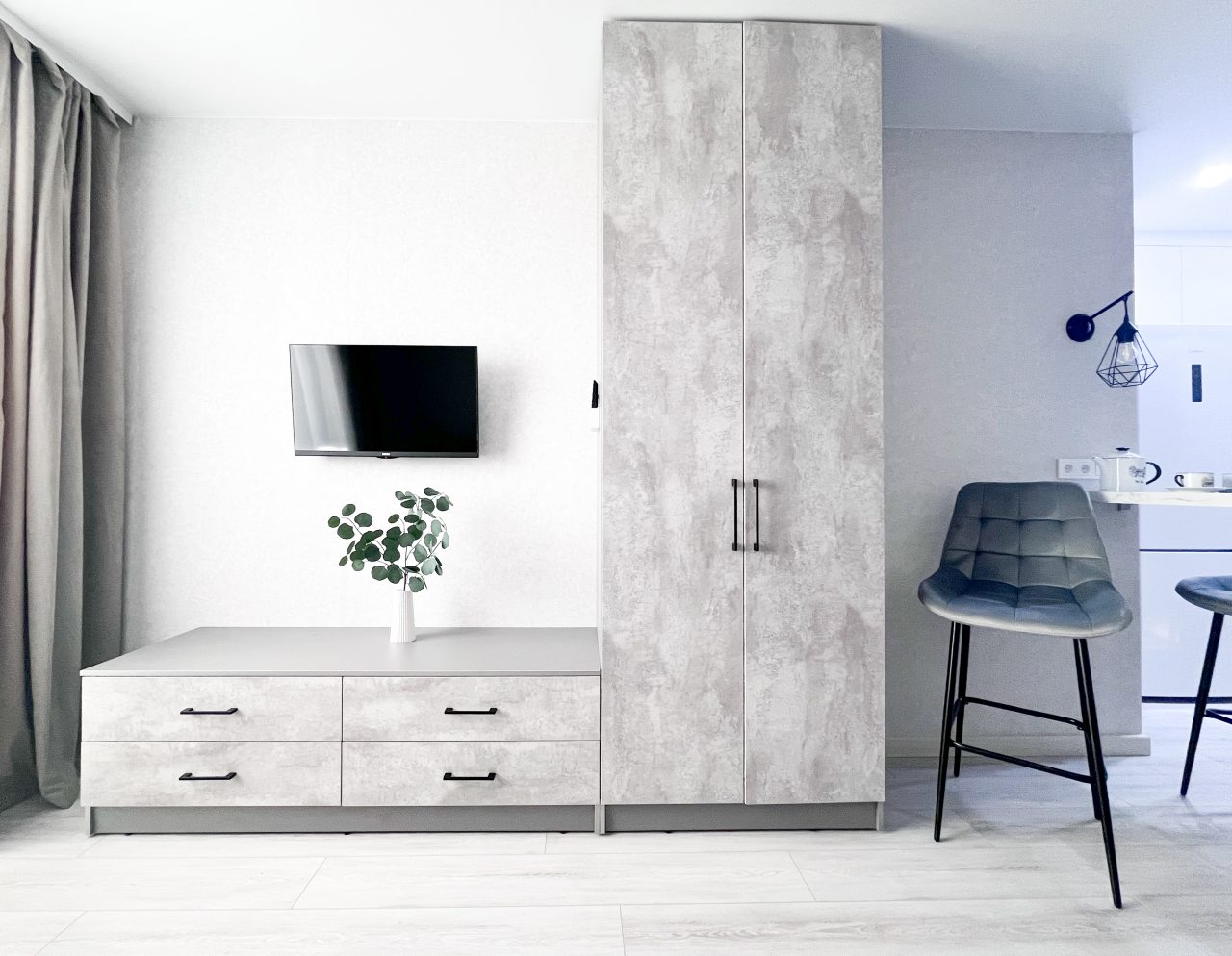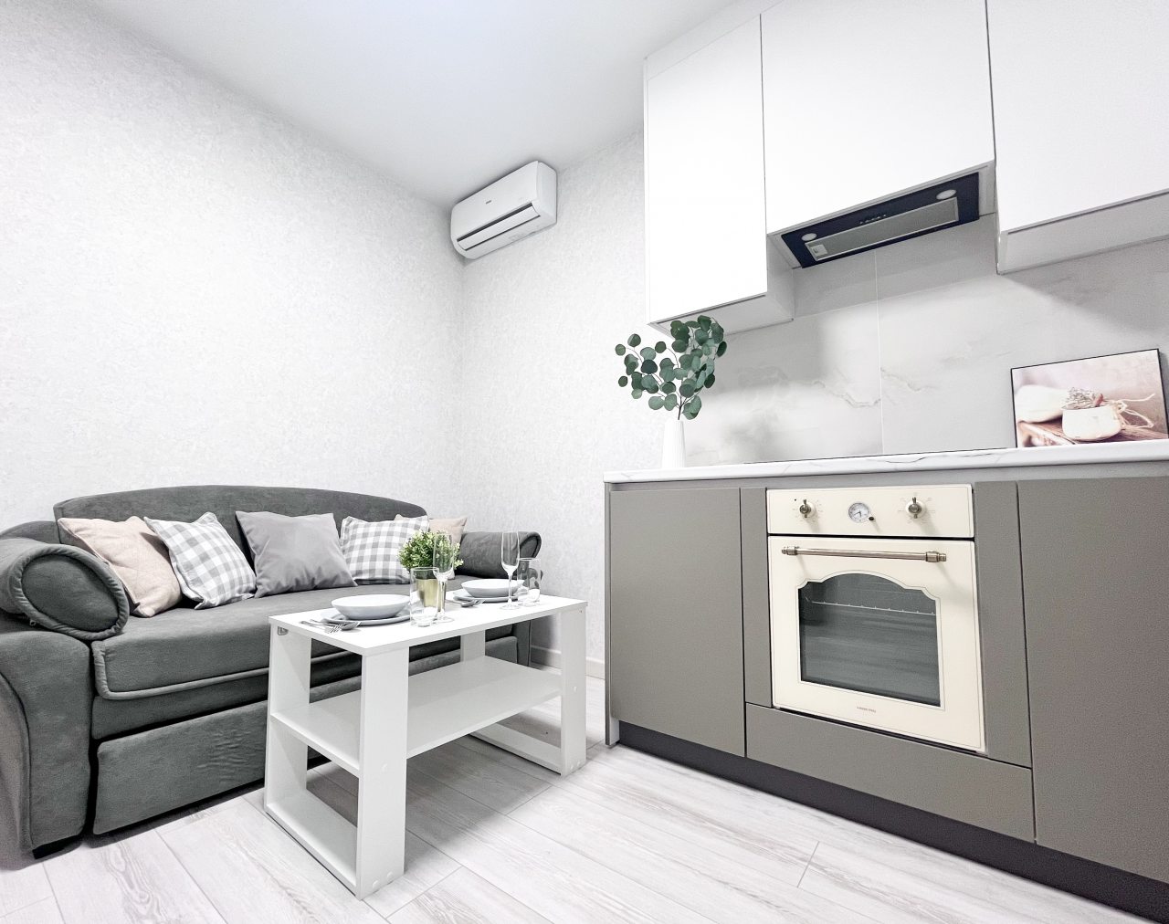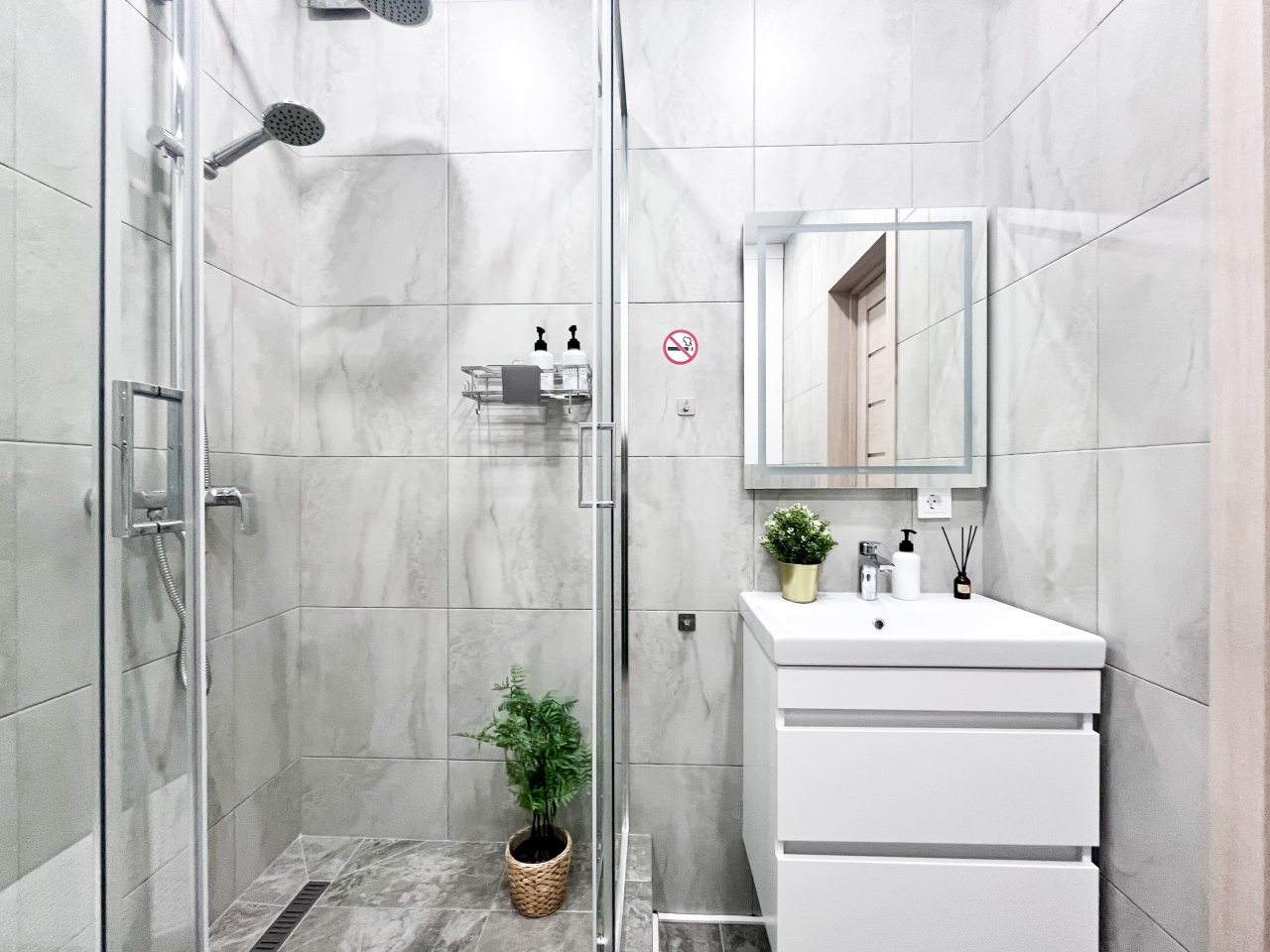 Для размещения предоставляется современная квартира, оснащенная качественной мебелью, техникой и текстилем. Из удобств установлены: телевизор, стиральная машина, кондиционер. Ванная комната оснащена косметическими средствами и набором полотенец. Имеется зона отдыха на балконе, откуда открывается вид на город.