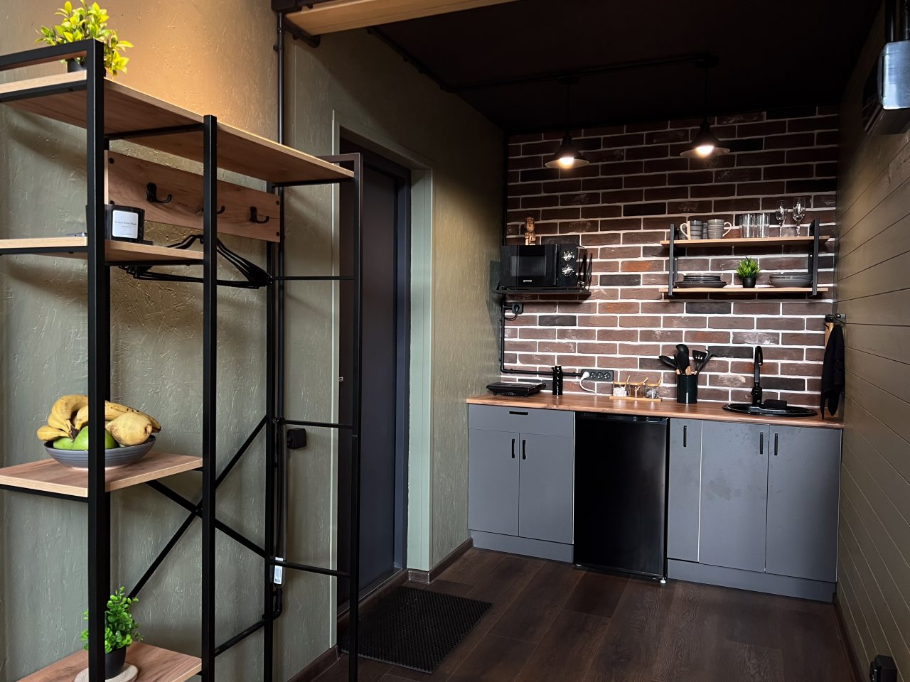 Кухня оснащена гарнитуром, варочной панелью, обеденным столом, микроволновой печью, холодильником, набором посуды и др. Для любителей барбекю предусмотрена бесплатная мангальная зона.