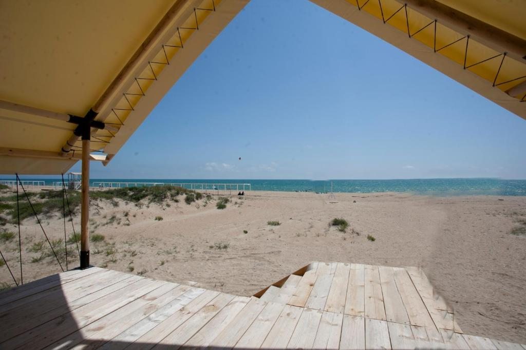 До этого момента опыта отдыха в глэмпинге у нас не было. Неплохие условия, вполне себе комфортно. На территории есть небольшое кафе. С питанием здесь все отлично, заморачиваться с едой не надо. Пляжная зона очень чистая, оборудованная. Лежаки и прочие принадлежности для пляжного отдыха есть.