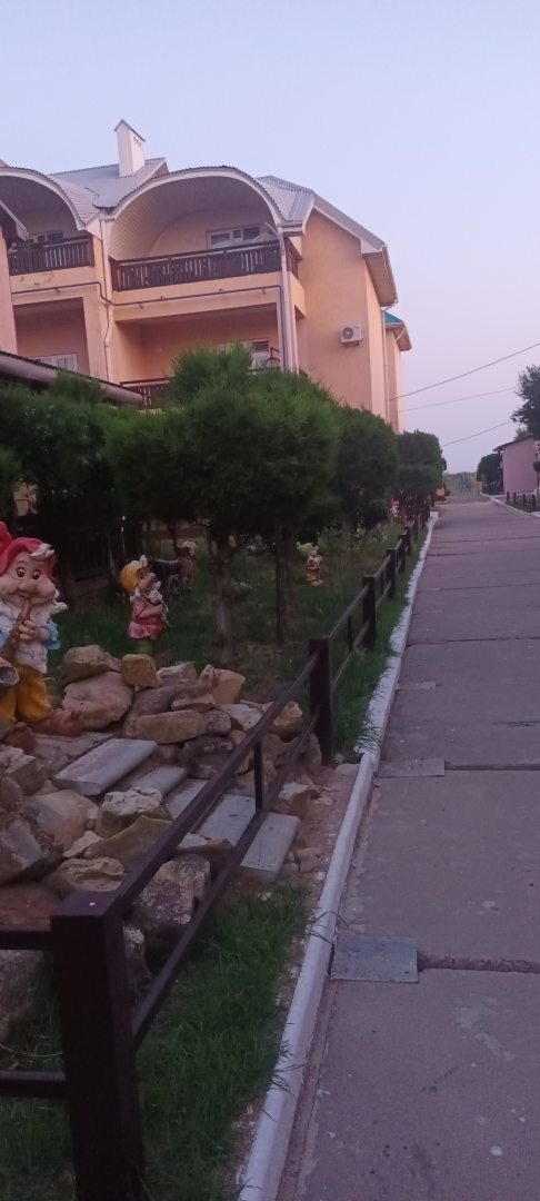 Территория чистая, зеленая, да не очень удобные плиты, особенно с коляской, но я так понимаю это сделано для отвода воды) что б не плавать ввод время дождейменя они не напрягали, хоть я была с двумя детьми ) все кустарники красиво подстрижены, все ухожено,различные милые фигурки по всей территории