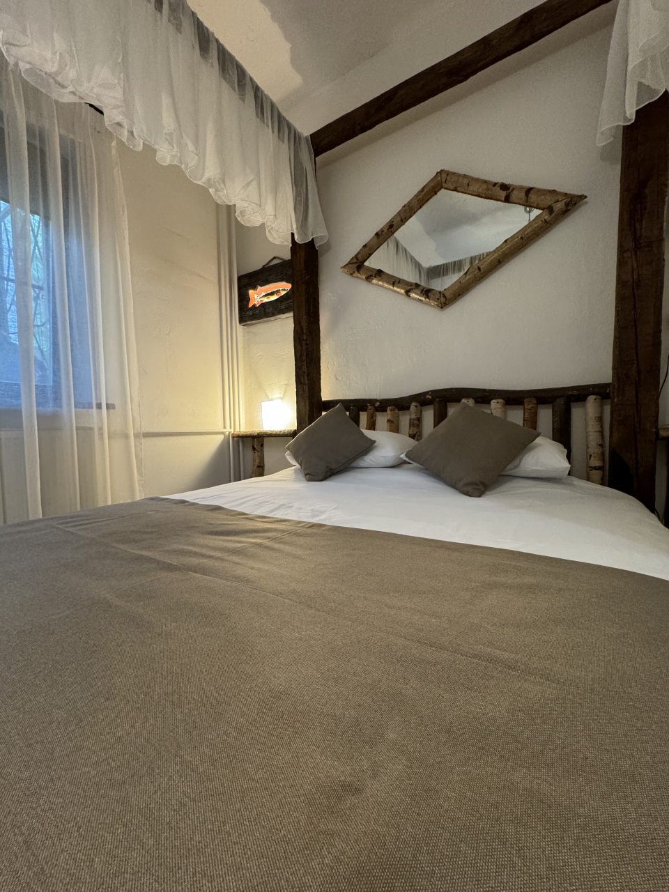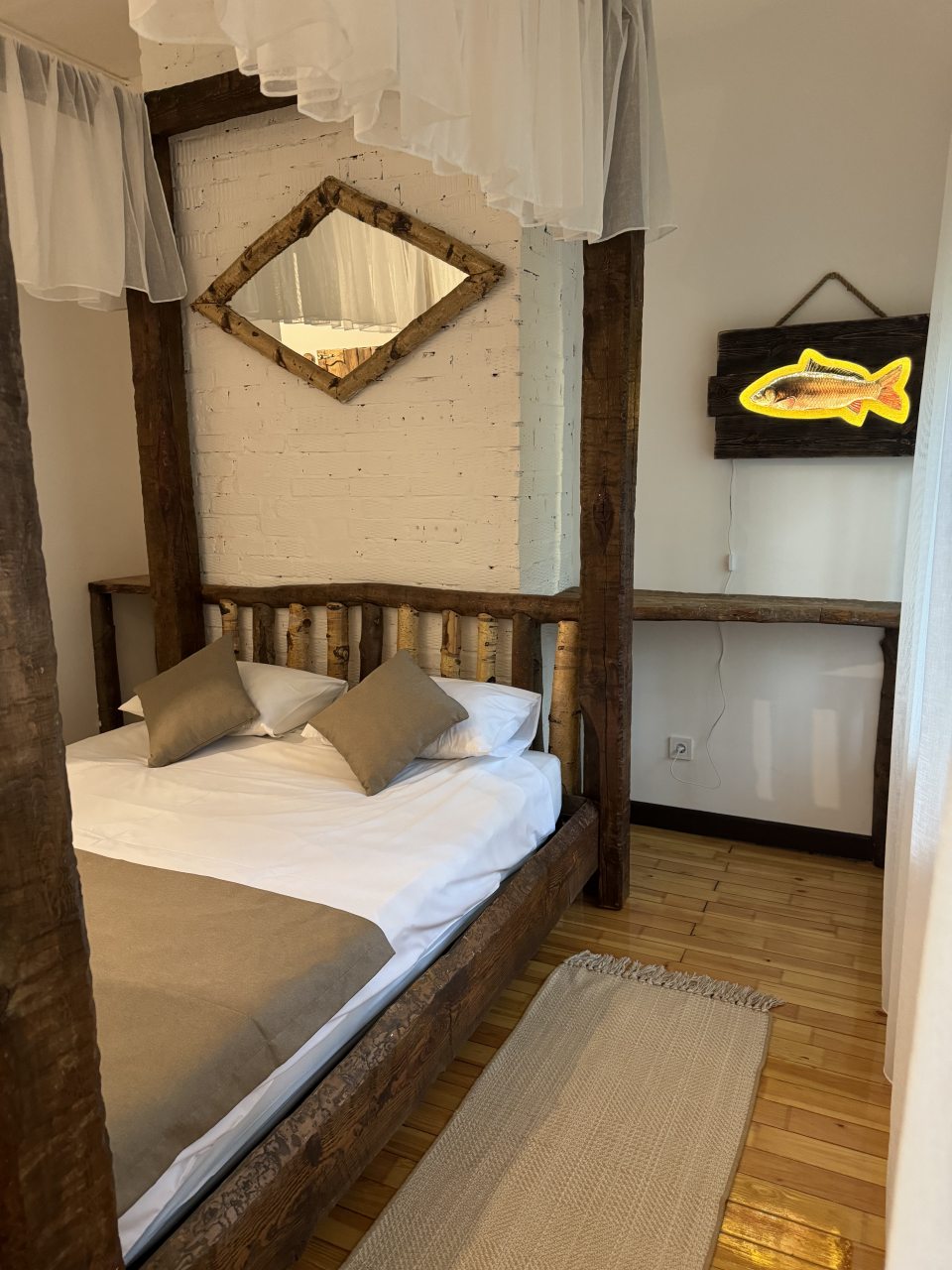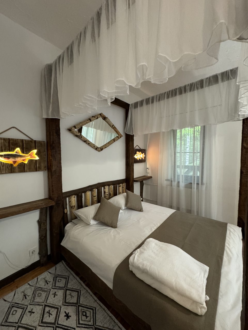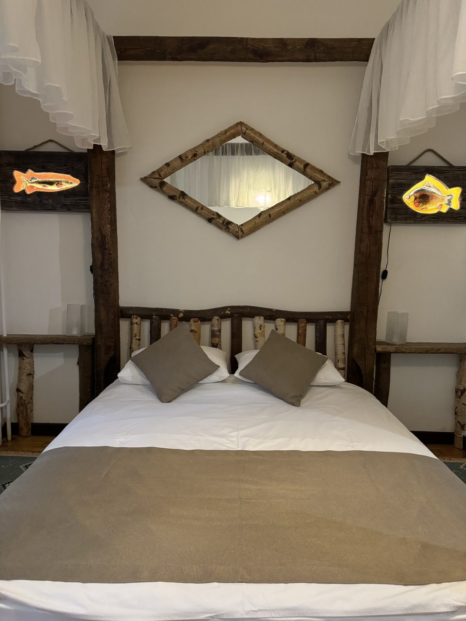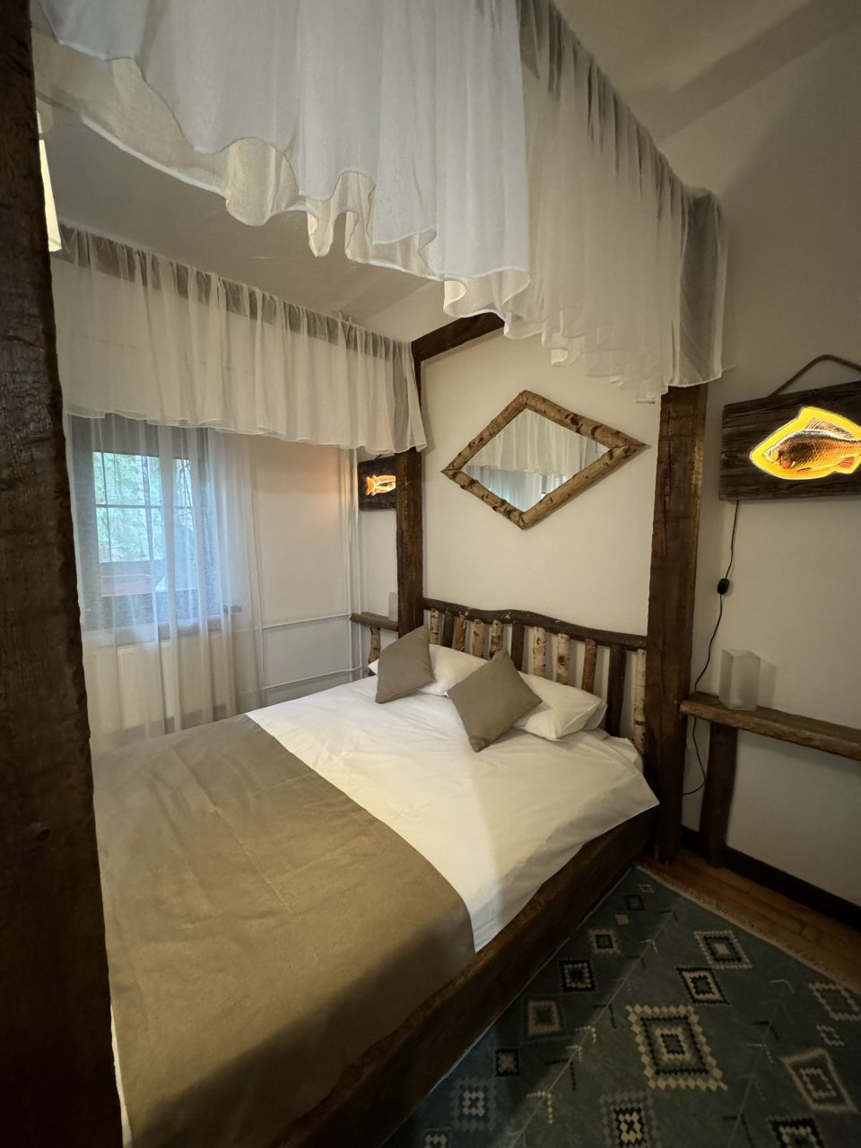 Проезд прямо до отеля по асфальтовой дороге. Есть своя стоянка для машин на огороженной территории отеля. Отель расположен в сосновом лесу и сосны вокруг отеля высокие с ветвями прямо до балконов - на громадных балконах есть пара тканевых кресел - можно посидеть и насладиться пением птиц, чистым воздухом и красотой природы. Соответственно воздух свежий и приятный. Ездили насладиться природой, чистым воздухом и осенними пейзажами. С погодой повезло - было солнечно. Живописные места для прогулок и отдуха на свежем воздухе. В отеле всё стилизовано под рыболовство, начиная со входной двери в виде стоящих вёсел и перевёрнутой рыбацкой лодки на потолке столовой и заканчивая картинами с подсветкой разных рыб на стенах в номере. Всё сделано из дерева и даже есть подушки с наполнителем из какой то крупы или шелухи для здорового сна. В номере чисто и тепло (были осенью в октябре) - топят очень хорошо, даже приходится иногда приоткрывать окра для проветривания. Персонал любезный и отзывчивый - приехали в 13.40 вместо 14.00 - без вопросов тут же заселили. В номере есть фен, холодильник, тапочки, халаты, полотенца для лица и тела для каждого, мыло, шампунь, гель для душа, туалетная бумага, освежитель воздуха, телевизор в каждой комнате с кучей каналов телевидение. Мы накачали семейных фильмов на вечер и устроили семейный просмотр. Питание - шведский стол. Сразу хочу сказать, что приготовлено всё ОЧЕНЬ вкусно и еда разнообразная. На ужин было: винегрет, салат из помидоров и огурцов, салат из пекинской капусты и каких то овощей, капуста квашеная, грибы солёные, салат из грибов с сыром, сельдь с луком - это как бы салаты. Потом по горячему: курица с грибами в сметанном соусе, печень с подливкой, говядина с подливкой, рыба (судак) жарено-отварная (не понял как приготовлена, но очень вкусно), ёжики, картофель отварной, огурчики маринованные и т.д. Ещё был пирог творожный типа большая ватрушка и пирожки с фаршем и тушёной капустой. Ужин прошёл на УРА! Завтрак тоже был на высоте - вкусный и разнообразный: каши, сырники, яйца, сосиски, омлет, творог (местного производства), сметана, масло. молоко, колбаса копчёная, сыр, глазированные творожки, плавленный сыр и т.д. В общем и целом осталось приятное впечатление от отеля, так что рекомендую к посещению, несмотря на буйных рыбаков и отличную слышимость в номерах.