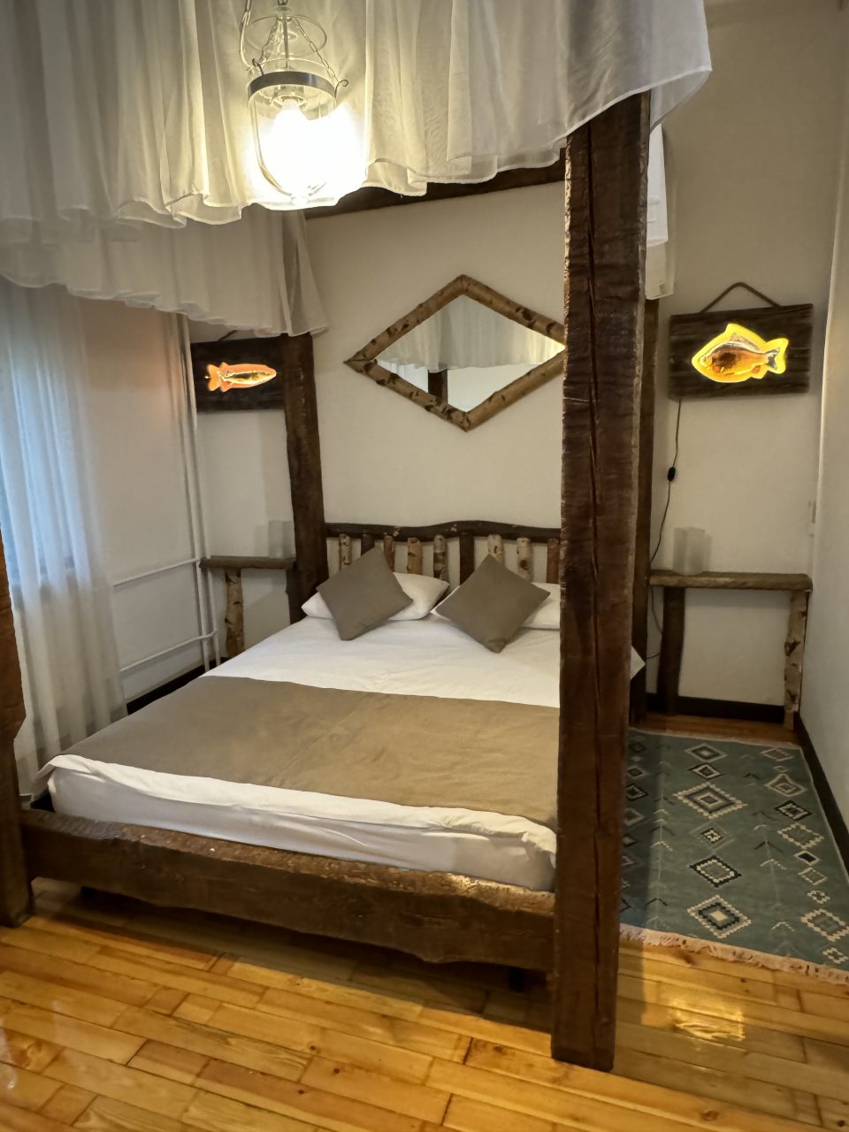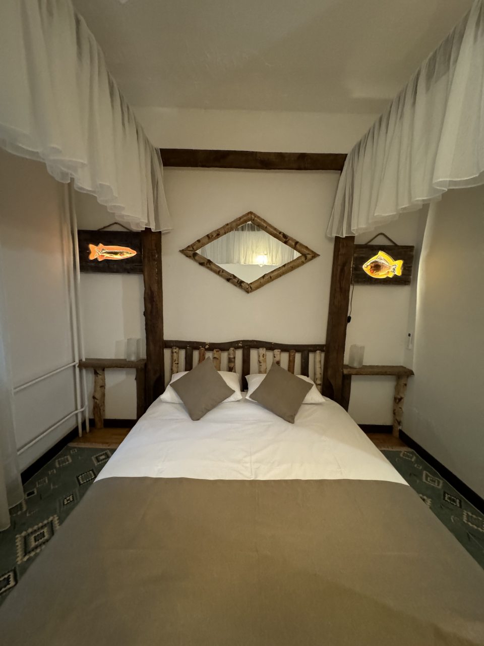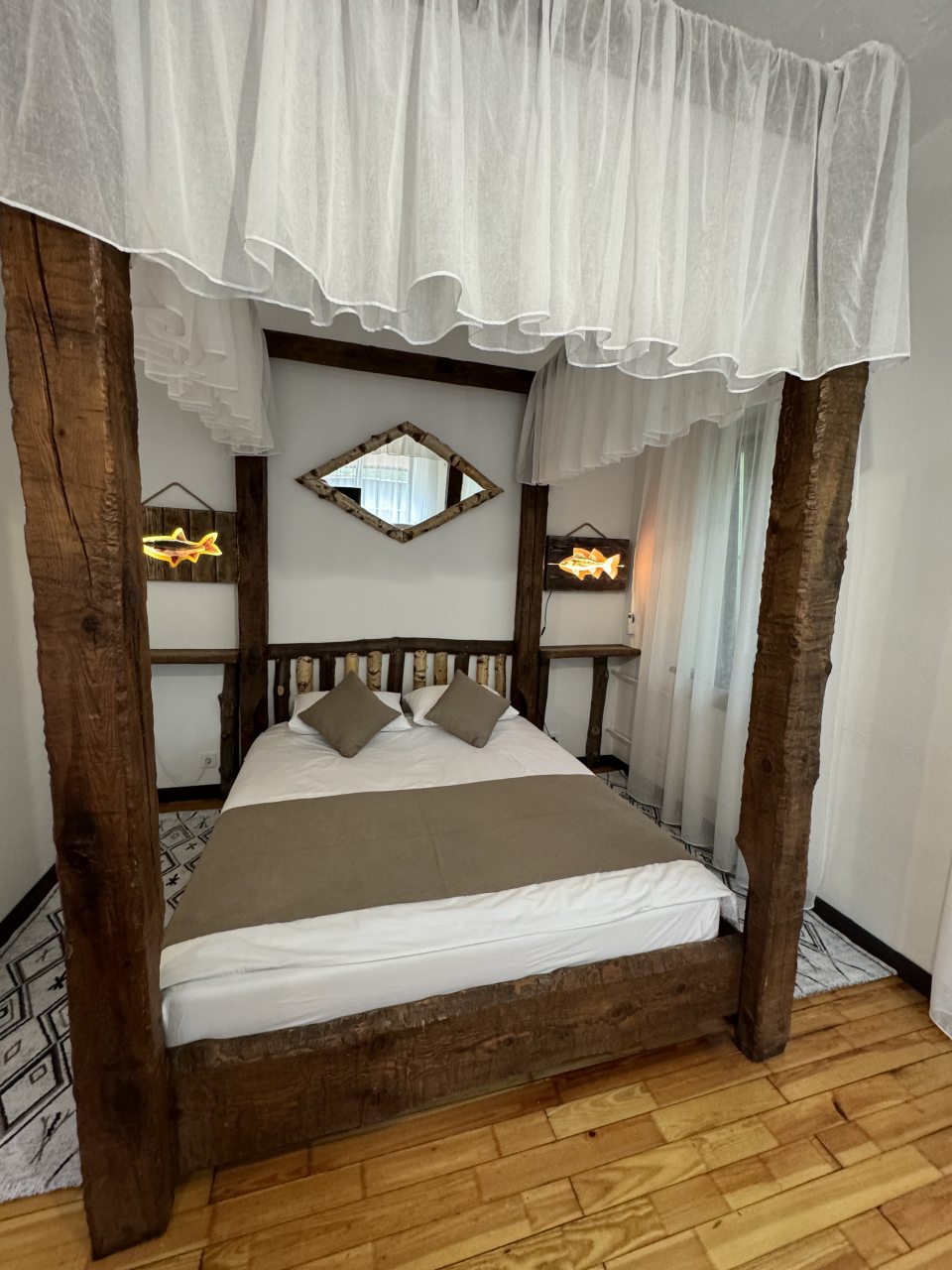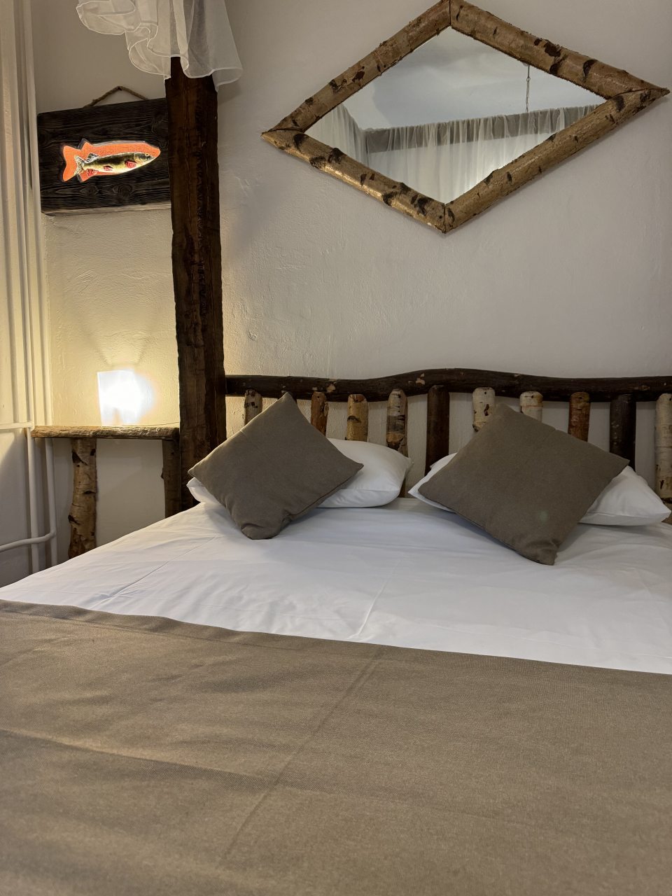 Проезд прямо до отеля по асфальтовой дороге. Есть своя стоянка для машин на огороженной территории отеля. Отель расположен в сосновом лесу и сосны вокруг отеля высокие с ветвями прямо до балконов - на громадных балконах есть пара тканевых кресел - можно посидеть и насладиться пением птиц, чистым воздухом и красотой природы. Соответственно воздух свежий и приятный. Ездили насладиться природой, чистым воздухом и осенними пейзажами. С погодой повезло - было солнечно. Живописные места для прогулок и отдуха на свежем воздухе. В отеле всё стилизовано под рыболовство, начиная со входной двери в виде стоящих вёсел и перевёрнутой рыбацкой лодки на потолке столовой и заканчивая картинами с подсветкой разных рыб на стенах в номере. Всё сделано из дерева и даже есть подушки с наполнителем из какой то крупы или шелухи для здорового сна. В номере чисто и тепло (были осенью в октябре) - топят очень хорошо, даже приходится иногда приоткрывать окра для проветривания. Персонал любезный и отзывчивый - приехали в 13.40 вместо 14.00 - без вопросов тут же заселили. В номере есть фен, холодильник, тапочки, халаты, полотенца для лица и тела для каждого, мыло, шампунь, гель для душа, туалетная бумага, освежитель воздуха, телевизор в каждой комнате с кучей каналов телевидение. Мы накачали семейных фильмов на вечер и устроили семейный просмотр. Питание - шведский стол. Сразу хочу сказать, что приготовлено всё ОЧЕНЬ вкусно и еда разнообразная. На ужин было: винегрет, салат из помидоров и огурцов, салат из пекинской капусты и каких то овощей, капуста квашеная, грибы солёные, салат из грибов с сыром, сельдь с луком - это как бы салаты. Потом по горячему: курица с грибами в сметанном соусе, печень с подливкой, говядина с подливкой, рыба (судак) жарено-отварная (не понял как приготовлена, но очень вкусно), ёжики, картофель отварной, огурчики маринованные и т.д. Ещё был пирог творожный типа большая ватрушка и пирожки с фаршем и тушёной капустой. Ужин прошёл на УРА! Завтрак тоже был на высоте - вкусный и разнообразный: каши, сырники, яйца, сосиски, омлет, творог (местного производства), сметана, масло. молоко, колбаса копчёная, сыр, глазированные творожки, плавленный сыр и т.д. В общем и целом осталось приятное впечатление от отеля, так что рекомендую к посещению, несмотря на буйных рыбаков и отличную слышимость в номерах.