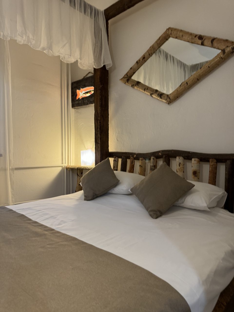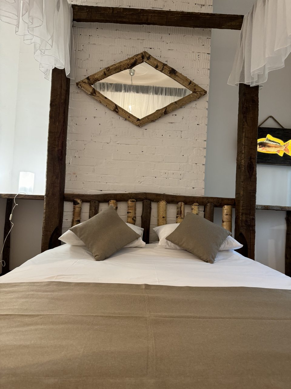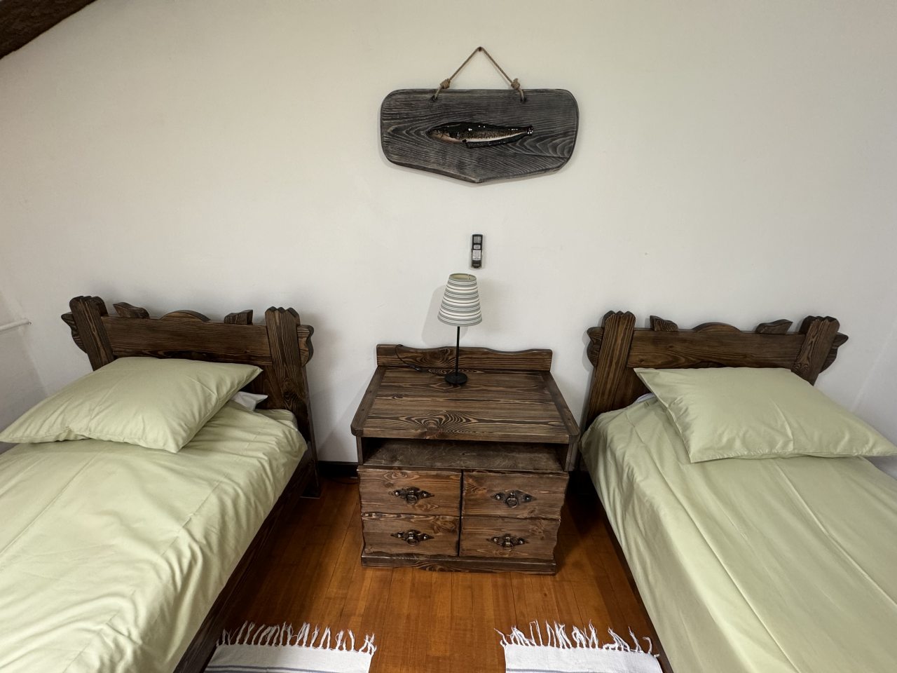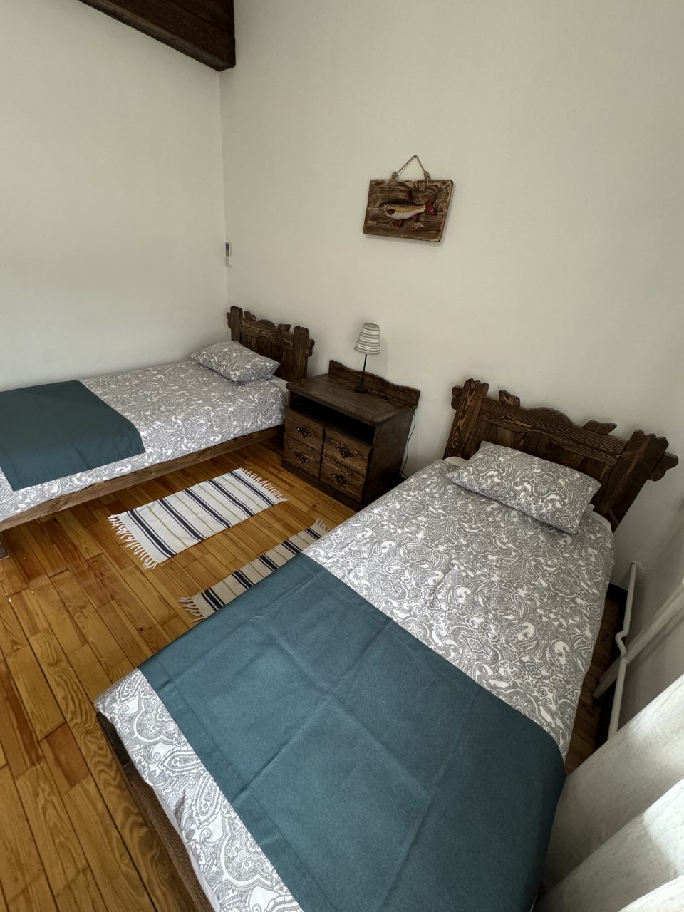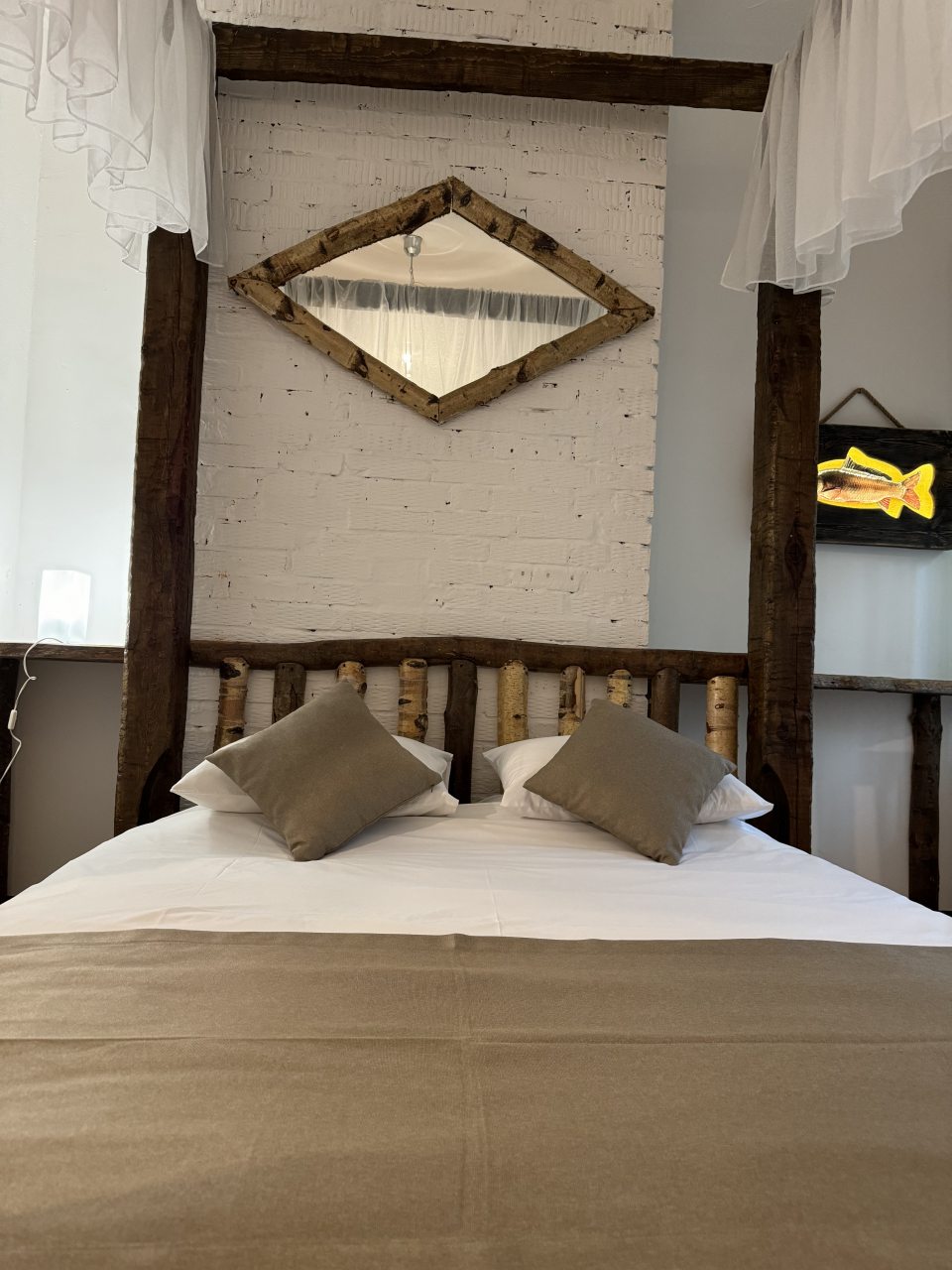 Проезд прямо до отеля по асфальтовой дороге. Есть своя стоянка для машин на огороженной территории отеля. Отель расположен в сосновом лесу и сосны вокруг отеля высокие с ветвями прямо до балконов - на громадных балконах есть пара тканевых кресел - можно посидеть и насладиться пением птиц, чистым воздухом и красотой природы. Соответственно воздух свежий и приятный. Ездили насладиться природой, чистым воздухом и осенними пейзажами. С погодой повезло - было солнечно. Живописные места для прогулок и отдуха на свежем воздухе. В отеле всё стилизовано под рыболовство, начиная со входной двери в виде стоящих вёсел и перевёрнутой рыбацкой лодки на потолке столовой и заканчивая картинами с подсветкой разных рыб на стенах в номере. Всё сделано из дерева и даже есть подушки с наполнителем из какой то крупы или шелухи для здорового сна. В номере чисто и тепло (были осенью в октябре) - топят очень хорошо, даже приходится иногда приоткрывать окра для проветривания. Персонал любезный и отзывчивый - приехали в 13.40 вместо 14.00 - без вопросов тут же заселили. В номере есть фен, холодильник, тапочки, халаты, полотенца для лица и тела для каждого, мыло, шампунь, гель для душа, туалетная бумага, освежитель воздуха, телевизор в каждой комнате с кучей каналов телевидение. Мы накачали семейных фильмов на вечер и устроили семейный просмотр. Питание - шведский стол. Сразу хочу сказать, что приготовлено всё ОЧЕНЬ вкусно и еда разнообразная. На ужин было: винегрет, салат из помидоров и огурцов, салат из пекинской капусты и каких то овощей, капуста квашеная, грибы солёные, салат из грибов с сыром, сельдь с луком - это как бы салаты. Потом по горячему: курица с грибами в сметанном соусе, печень с подливкой, говядина с подливкой, рыба (судак) жарено-отварная (не понял как приготовлена, но очень вкусно), ёжики, картофель отварной, огурчики маринованные и т.д. Ещё был пирог творожный типа большая ватрушка и пирожки с фаршем и тушёной капустой. Ужин прошёл на УРА! Завтрак тоже был на высоте - вкусный и разнообразный: каши, сырники, яйца, сосиски, омлет, творог (местного производства), сметана, масло. молоко, колбаса копчёная, сыр, глазированные творожки, плавленный сыр и т.д. В общем и целом осталось приятное впечатление от отеля, так что рекомендую к посещению, несмотря на буйных рыбаков и отличную слышимость в номерах.