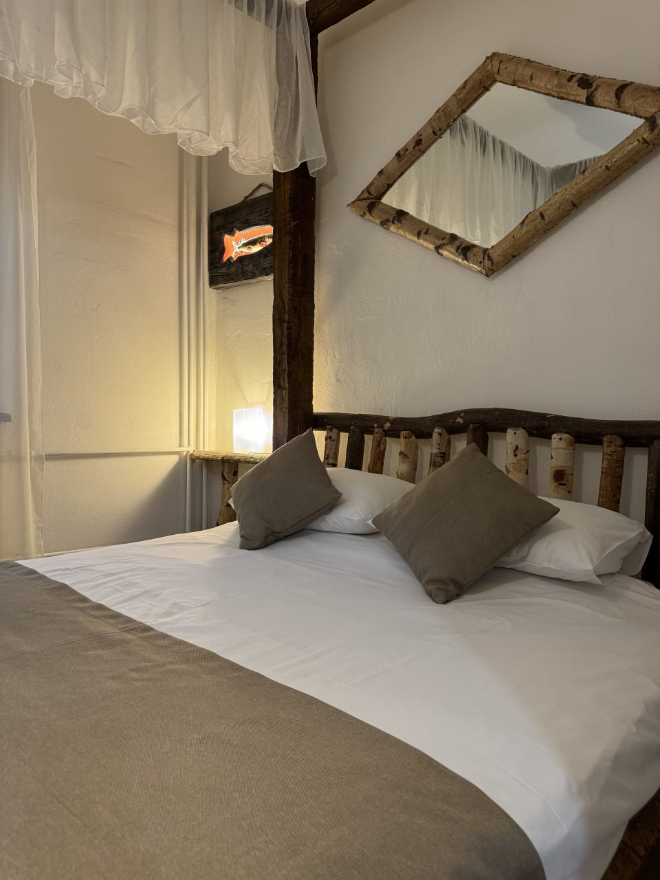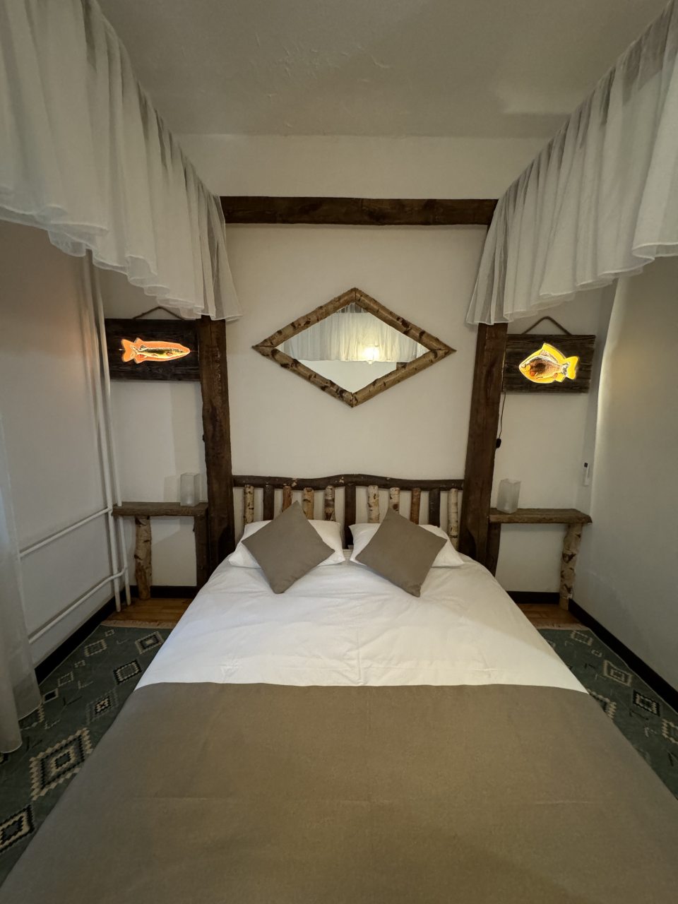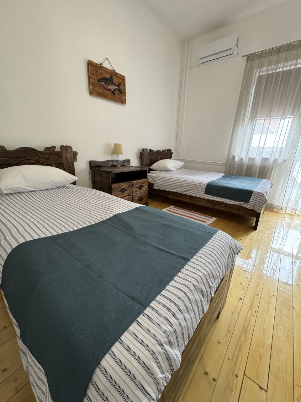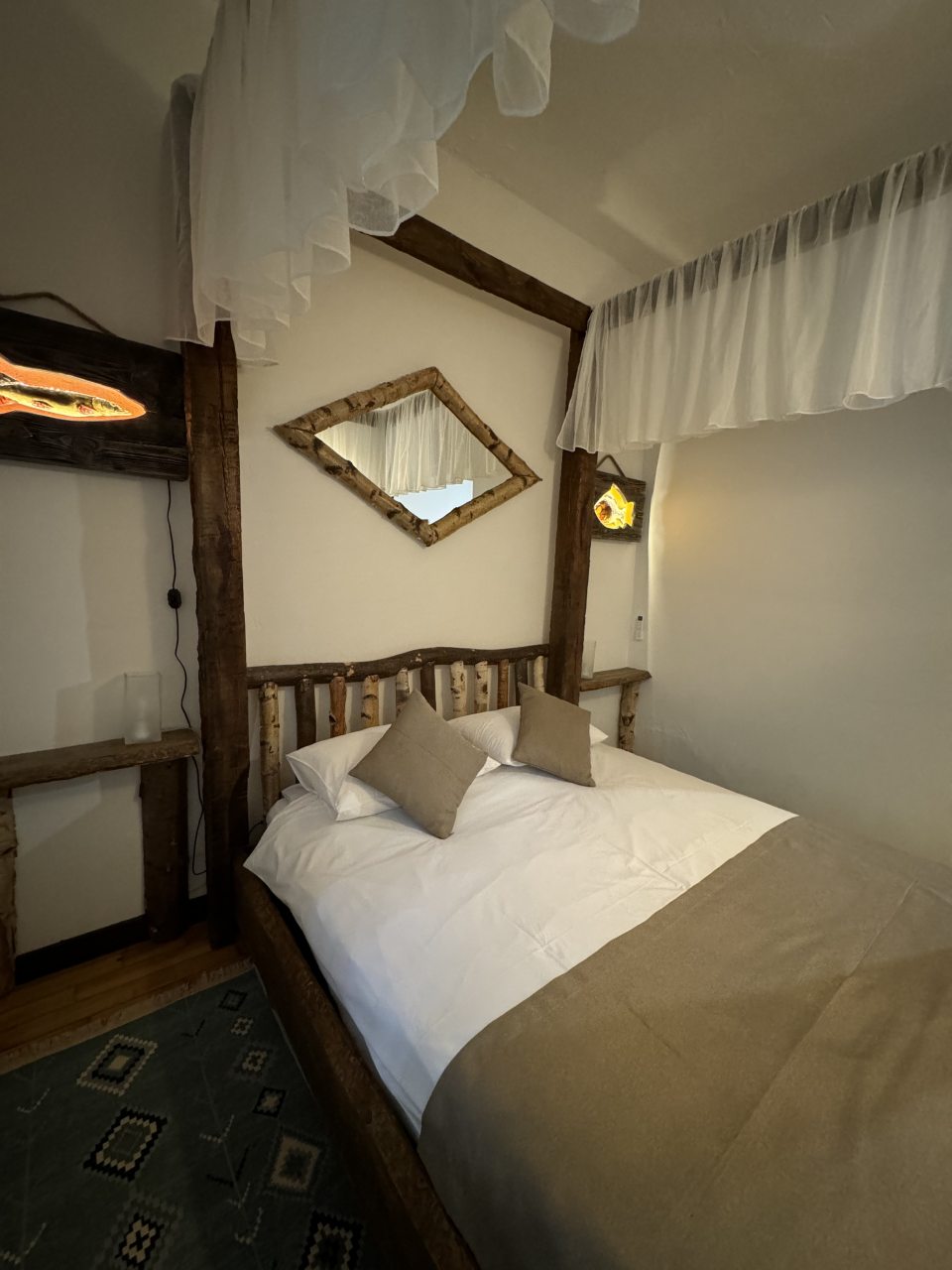 Проезд прямо до отеля по асфальтовой дороге. Есть своя стоянка для машин на огороженной территории отеля. Отель расположен в сосновом лесу и сосны вокруг отеля высокие с ветвями прямо до балконов - на громадных балконах есть пара тканевых кресел - можно посидеть и насладиться пением птиц, чистым воздухом и красотой природы. Соответственно воздух свежий и приятный. Ездили насладиться природой, чистым воздухом и осенними пейзажами. С погодой повезло - было солнечно. Живописные места для прогулок и отдуха на свежем воздухе. В отеле всё стилизовано под рыболовство, начиная со входной двери в виде стоящих вёсел и перевёрнутой рыбацкой лодки на потолке столовой и заканчивая картинами с подсветкой разных рыб на стенах в номере. Всё сделано из дерева и даже есть подушки с наполнителем из какой то крупы или шелухи для здорового сна. В номере чисто и тепло (были осенью в октябре) - топят очень хорошо, даже приходится иногда приоткрывать окра для проветривания. Персонал любезный и отзывчивый - приехали в 13.40 вместо 14.00 - без вопросов тут же заселили. В номере есть фен, холодильник, тапочки, халаты, полотенца для лица и тела для каждого, мыло, шампунь, гель для душа, туалетная бумага, освежитель воздуха, телевизор в каждой комнате с кучей каналов телевидение. Мы накачали семейных фильмов на вечер и устроили семейный просмотр. Питание - шведский стол. Сразу хочу сказать, что приготовлено всё ОЧЕНЬ вкусно и еда разнообразная. На ужин было: винегрет, салат из помидоров и огурцов, салат из пекинской капусты и каких то овощей, капуста квашеная, грибы солёные, салат из грибов с сыром, сельдь с луком - это как бы салаты. Потом по горячему: курица с грибами в сметанном соусе, печень с подливкой, говядина с подливкой, рыба (судак) жарено-отварная (не понял как приготовлена, но очень вкусно), ёжики, картофель отварной, огурчики маринованные и т.д. Ещё был пирог творожный типа большая ватрушка и пирожки с фаршем и тушёной капустой. Ужин прошёл на УРА! Завтрак тоже был на высоте - вкусный и разнообразный: каши, сырники, яйца, сосиски, омлет, творог (местного производства), сметана, масло. молоко, колбаса копчёная, сыр, глазированные творожки, плавленный сыр и т.д. В общем и целом осталось приятное впечатление от отеля, так что рекомендую к посещению, несмотря на буйных рыбаков и отличную слышимость в номерах.