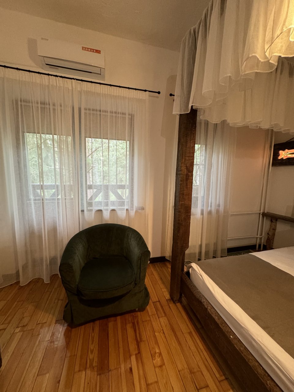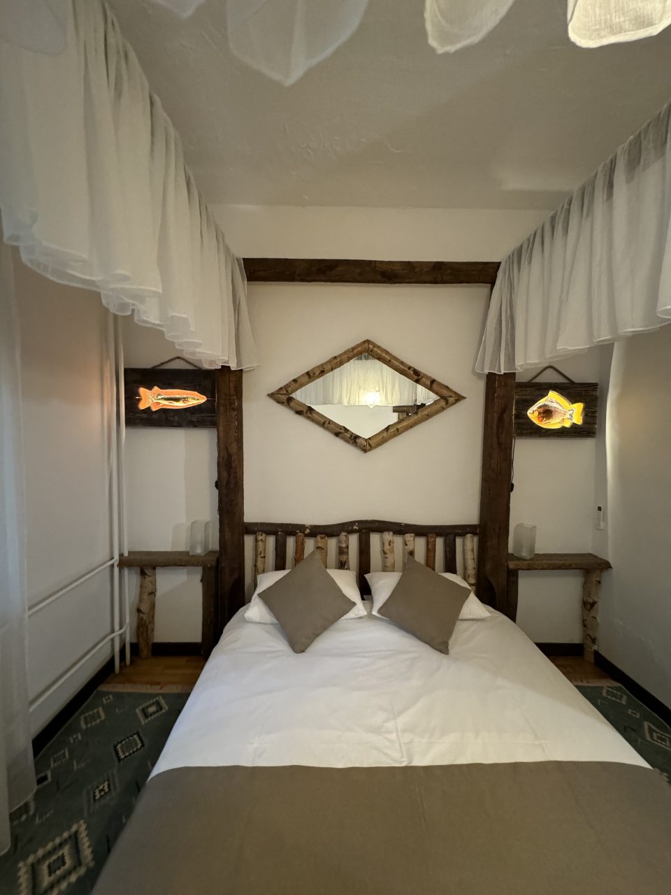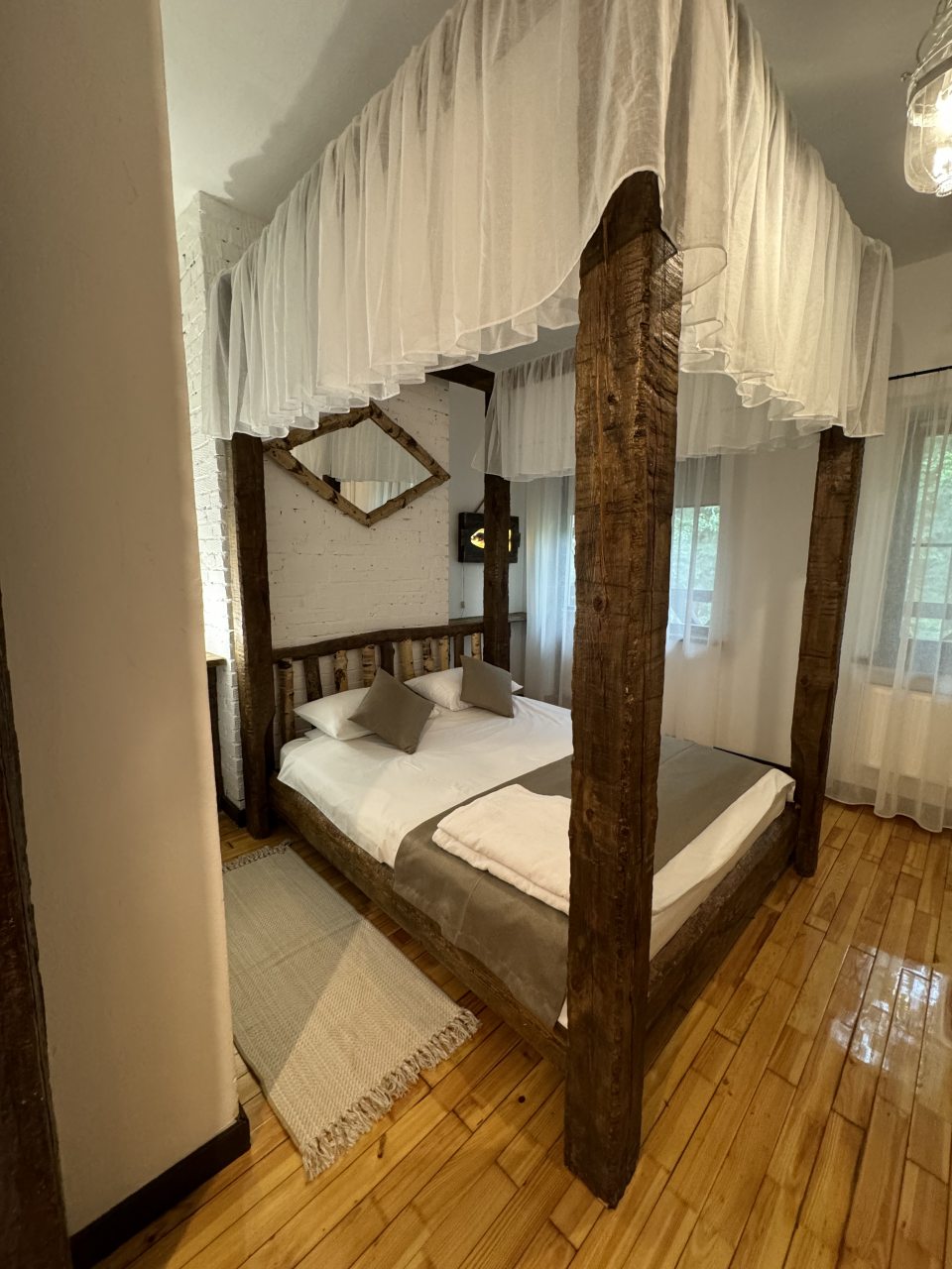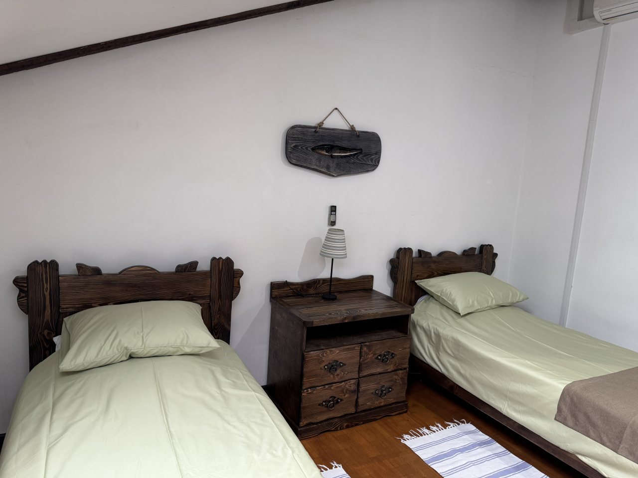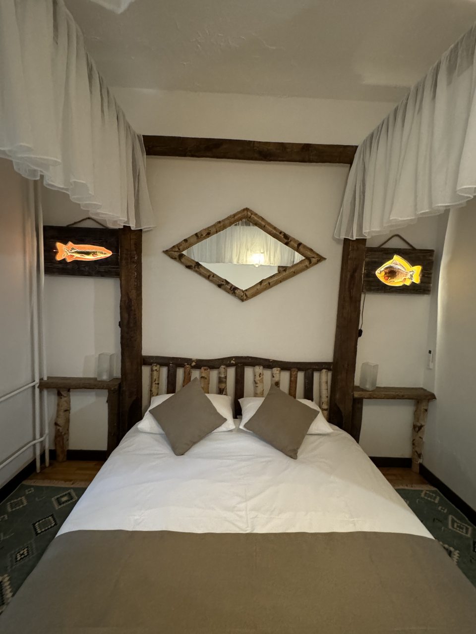 Проезд прямо до отеля по асфальтовой дороге. Есть своя стоянка для машин на огороженной территории отеля. Отель расположен в сосновом лесу и сосны вокруг отеля высокие с ветвями прямо до балконов - на громадных балконах есть пара тканевых кресел - можно посидеть и насладиться пением птиц, чистым воздухом и красотой природы. Соответственно воздух свежий и приятный. Ездили насладиться природой, чистым воздухом и осенними пейзажами. С погодой повезло - было солнечно. Живописные места для прогулок и отдуха на свежем воздухе. В отеле всё стилизовано под рыболовство, начиная со входной двери в виде стоящих вёсел и перевёрнутой рыбацкой лодки на потолке столовой и заканчивая картинами с подсветкой разных рыб на стенах в номере. Всё сделано из дерева и даже есть подушки с наполнителем из какой то крупы или шелухи для здорового сна. В номере чисто и тепло (были осенью в октябре) - топят очень хорошо, даже приходится иногда приоткрывать окра для проветривания. Персонал любезный и отзывчивый - приехали в 13.40 вместо 14.00 - без вопросов тут же заселили. В номере есть фен, холодильник, тапочки, халаты, полотенца для лица и тела для каждого, мыло, шампунь, гель для душа, туалетная бумага, освежитель воздуха, телевизор в каждой комнате с кучей каналов телевидение. Мы накачали семейных фильмов на вечер и устроили семейный просмотр. Питание - шведский стол. Сразу хочу сказать, что приготовлено всё ОЧЕНЬ вкусно и еда разнообразная. На ужин было: винегрет, салат из помидоров и огурцов, салат из пекинской капусты и каких то овощей, капуста квашеная, грибы солёные, салат из грибов с сыром, сельдь с луком - это как бы салаты. Потом по горячему: курица с грибами в сметанном соусе, печень с подливкой, говядина с подливкой, рыба (судак) жарено-отварная (не понял как приготовлена, но очень вкусно), ёжики, картофель отварной, огурчики маринованные и т.д. Ещё был пирог творожный типа большая ватрушка и пирожки с фаршем и тушёной капустой. Ужин прошёл на УРА! Завтрак тоже был на высоте - вкусный и разнообразный: каши, сырники, яйца, сосиски, омлет, творог (местного производства), сметана, масло. молоко, колбаса копчёная, сыр, глазированные творожки, плавленный сыр и т.д. В общем и целом осталось приятное впечатление от отеля, так что рекомендую к посещению, несмотря на буйных рыбаков и отличную слышимость в номерах.