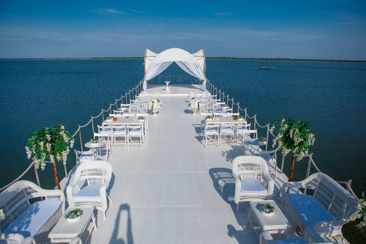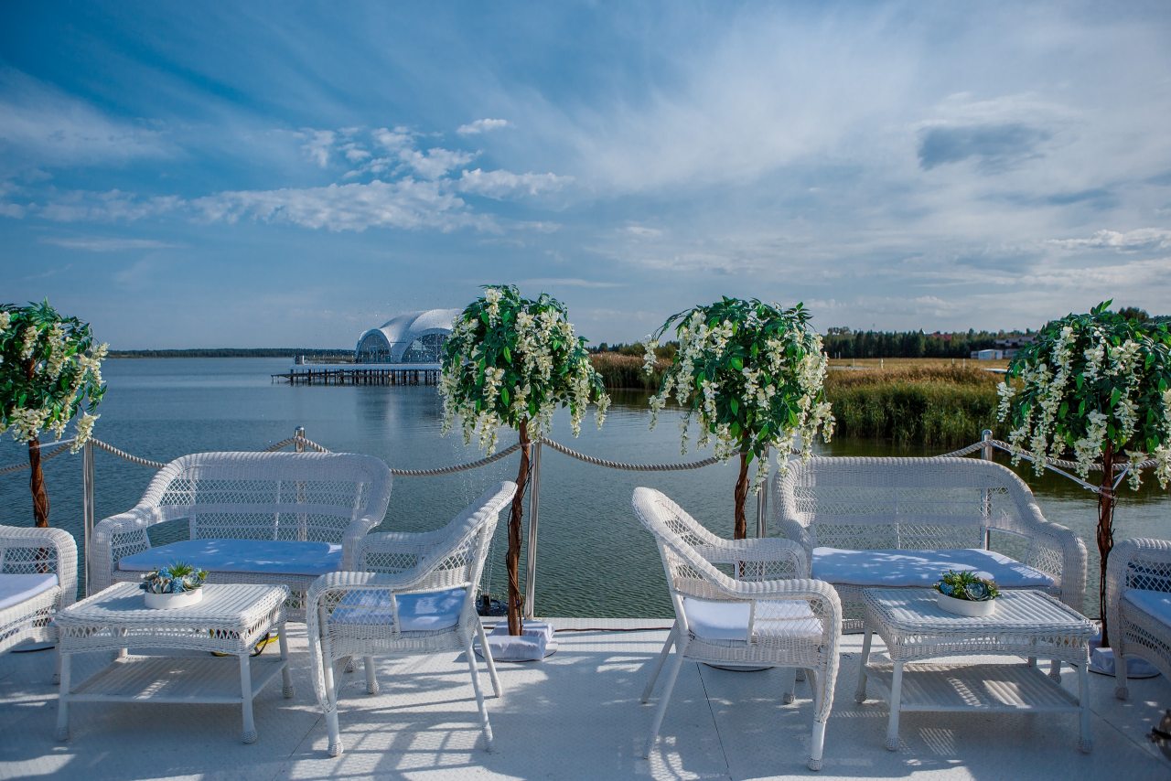 Белоснежный пирс будет украшен как вы пожелаете – живые цветы, или полупрозрачная органза, любые другие элементы декора выдержанные в стилистике вашей свадьбы.