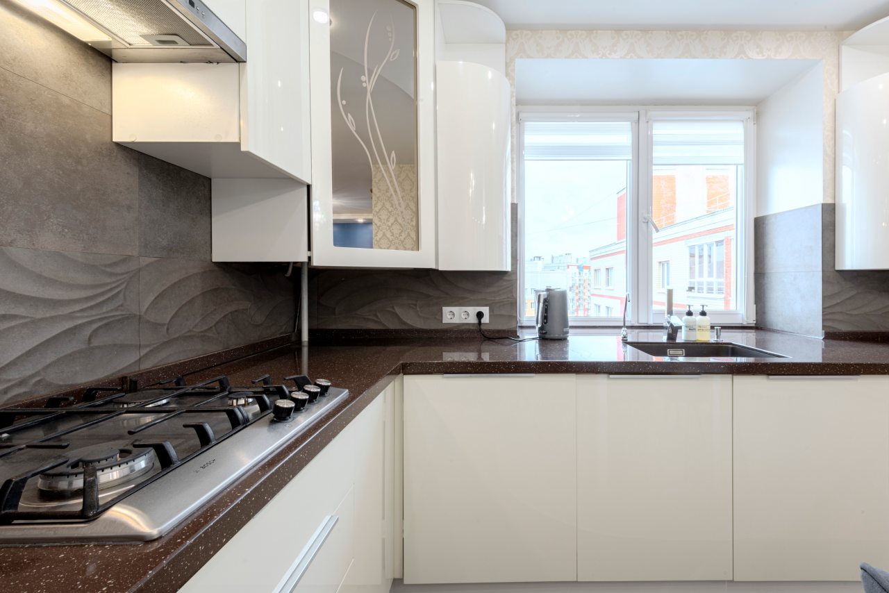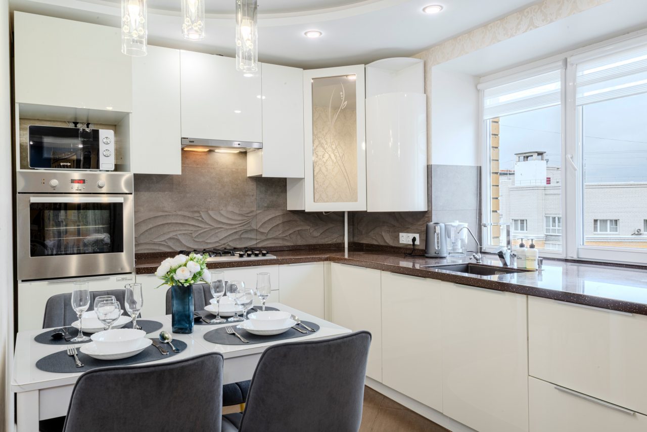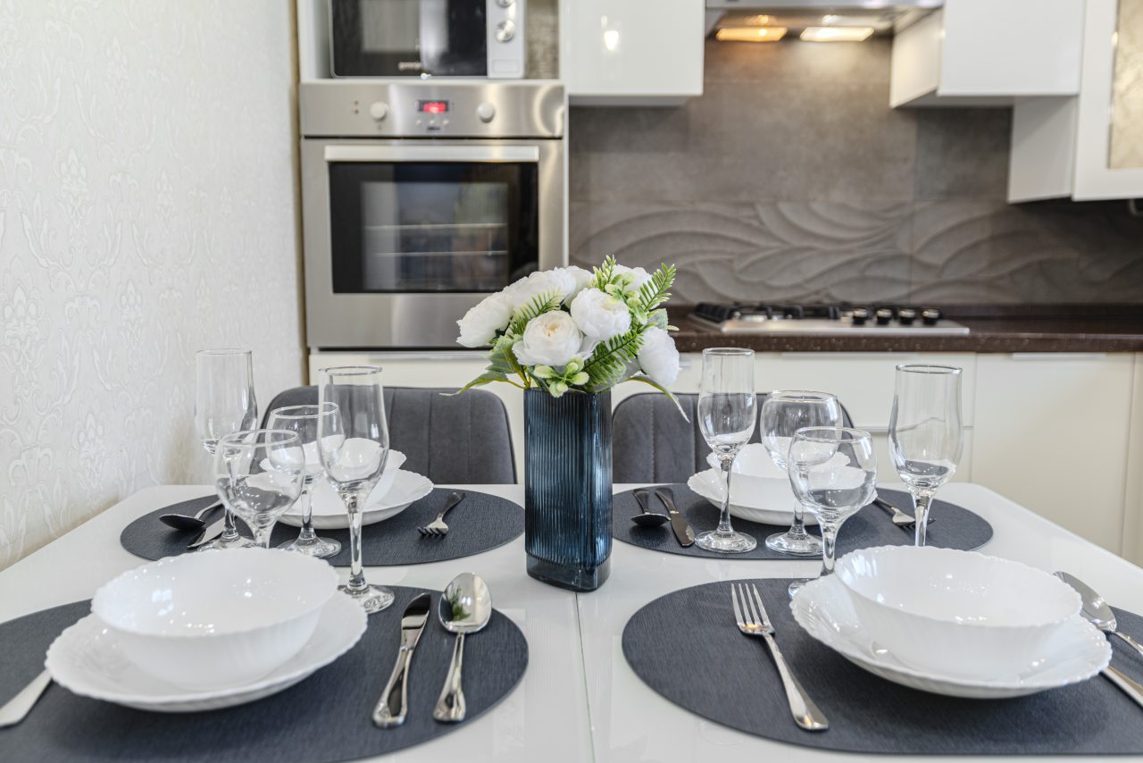 На кухне вы сможете воплотить в жизнь любую кулинарную идею, так как имеются плита, духовой шкаф, СВЧ-печь, чайник, фильтр для воды, посуда, столовые приборы и красивая обеденная зона.