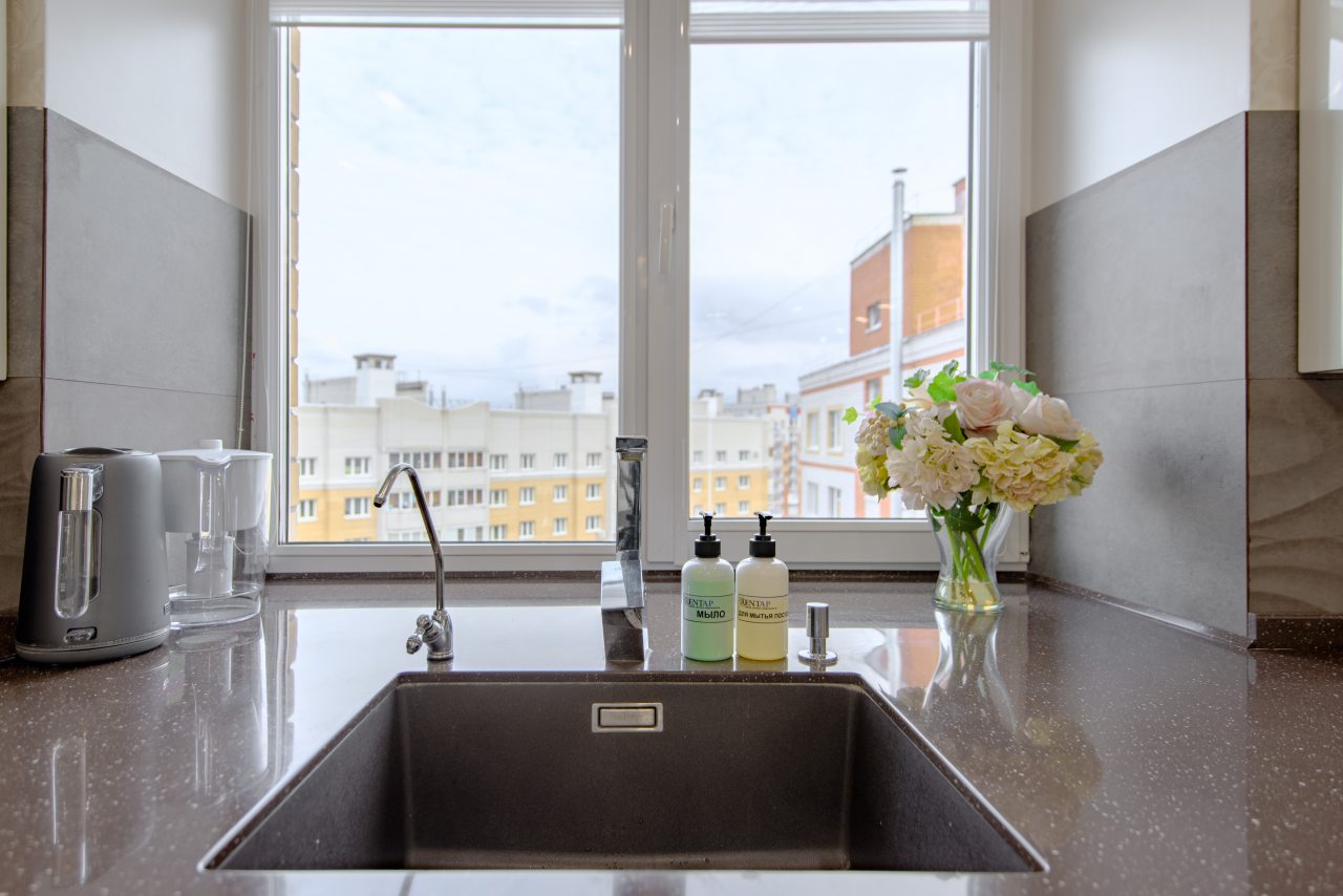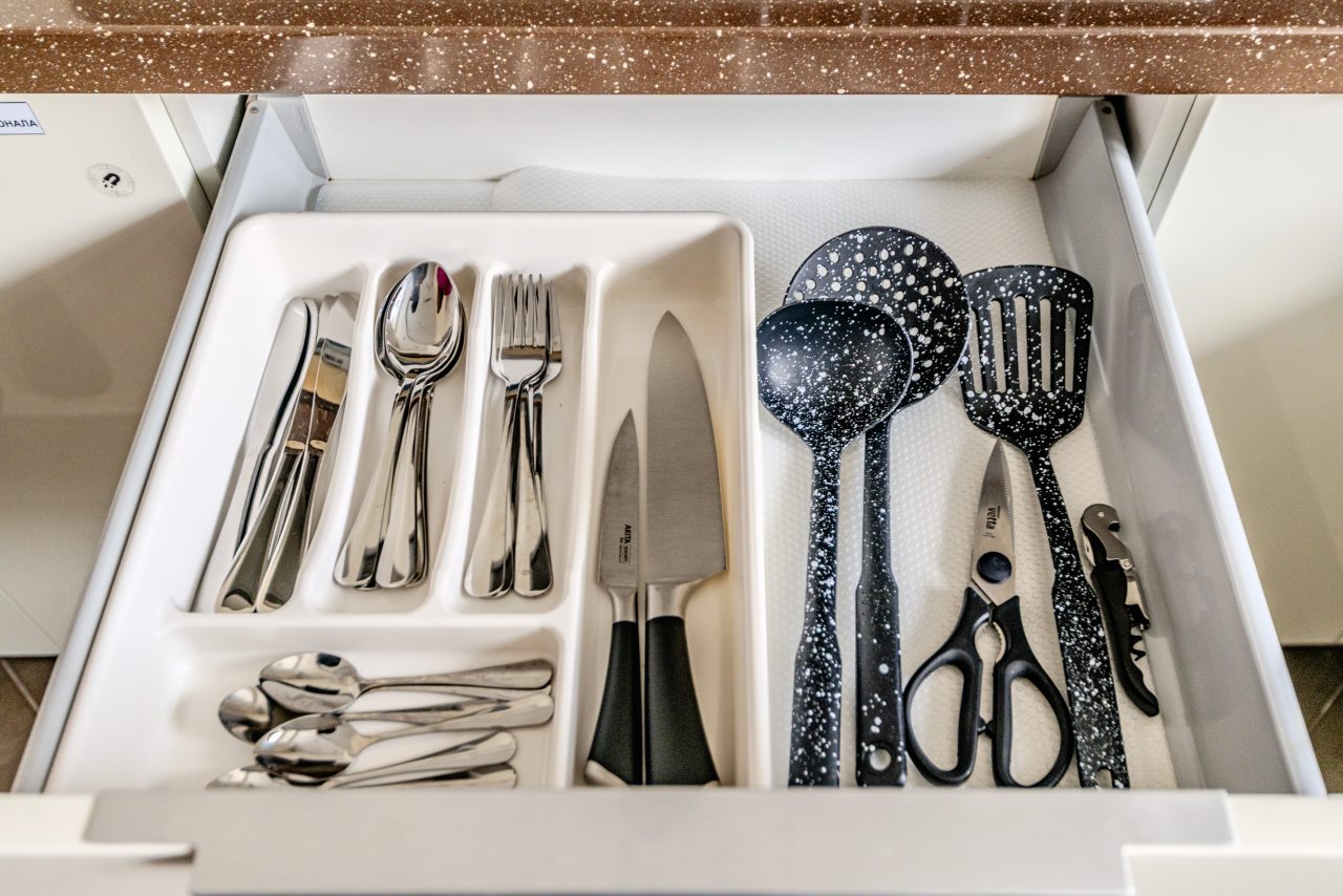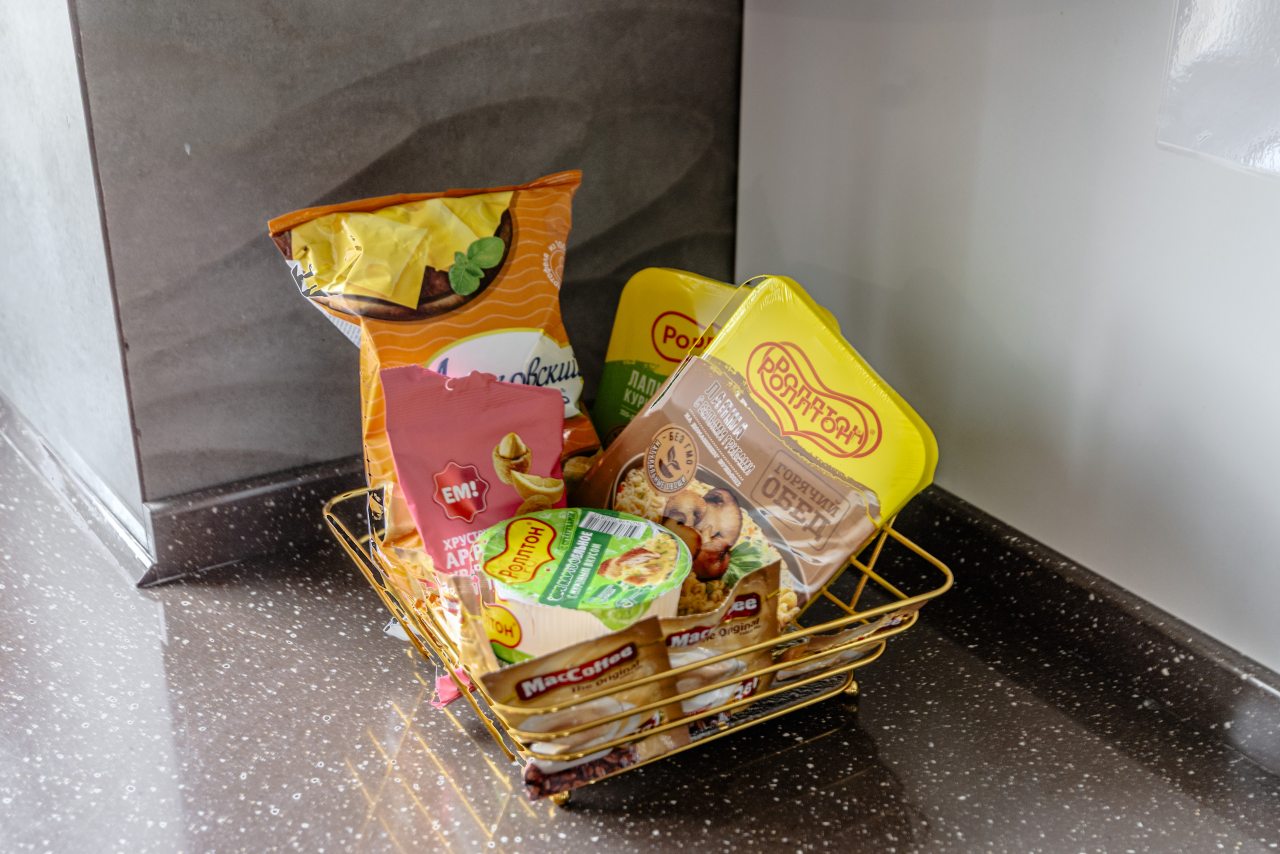 На кухне вы сможете воплотить в жизнь любую кулинарную идею, так как имеются плита, духовой шкаф, СВЧ-печь, чайник, фильтр для воды, посуда, столовые приборы и красивая обеденная зона.