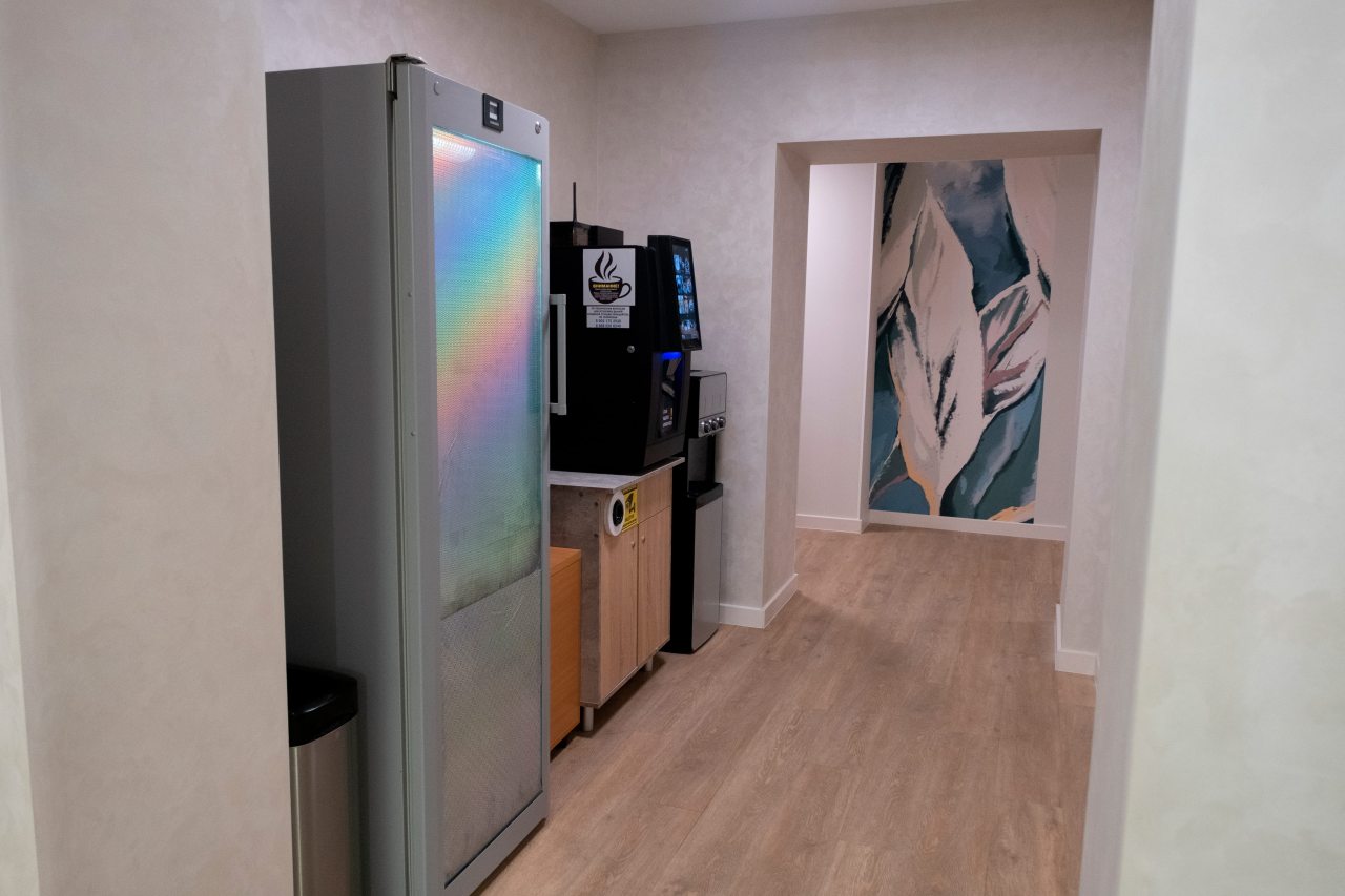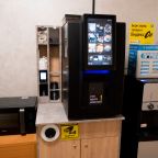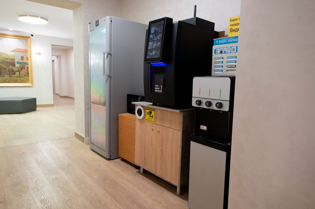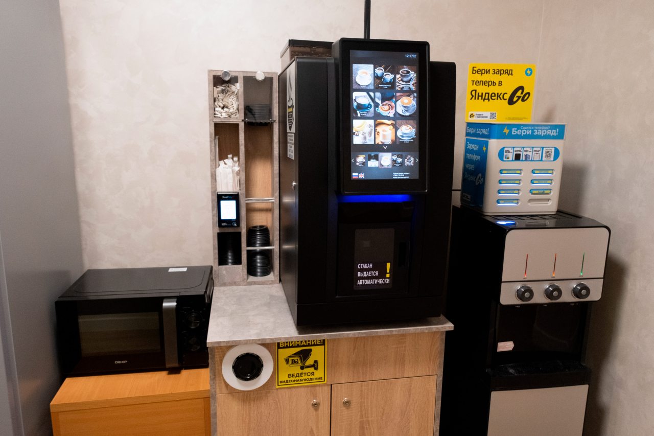 На первом этаже кофеаппарат. Кофе подается горячим и в больших стаканчиках, что для меня было очень акктуально.