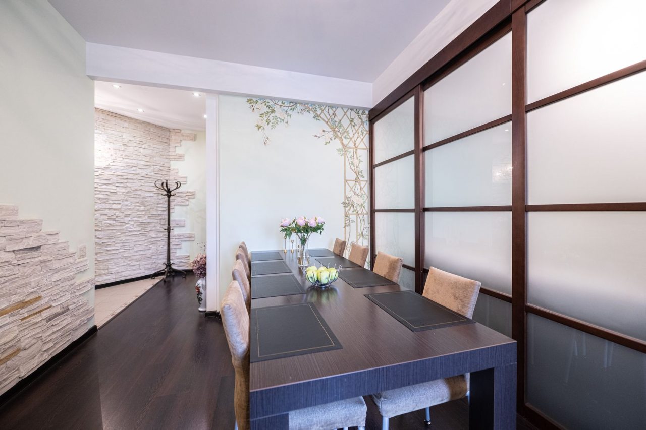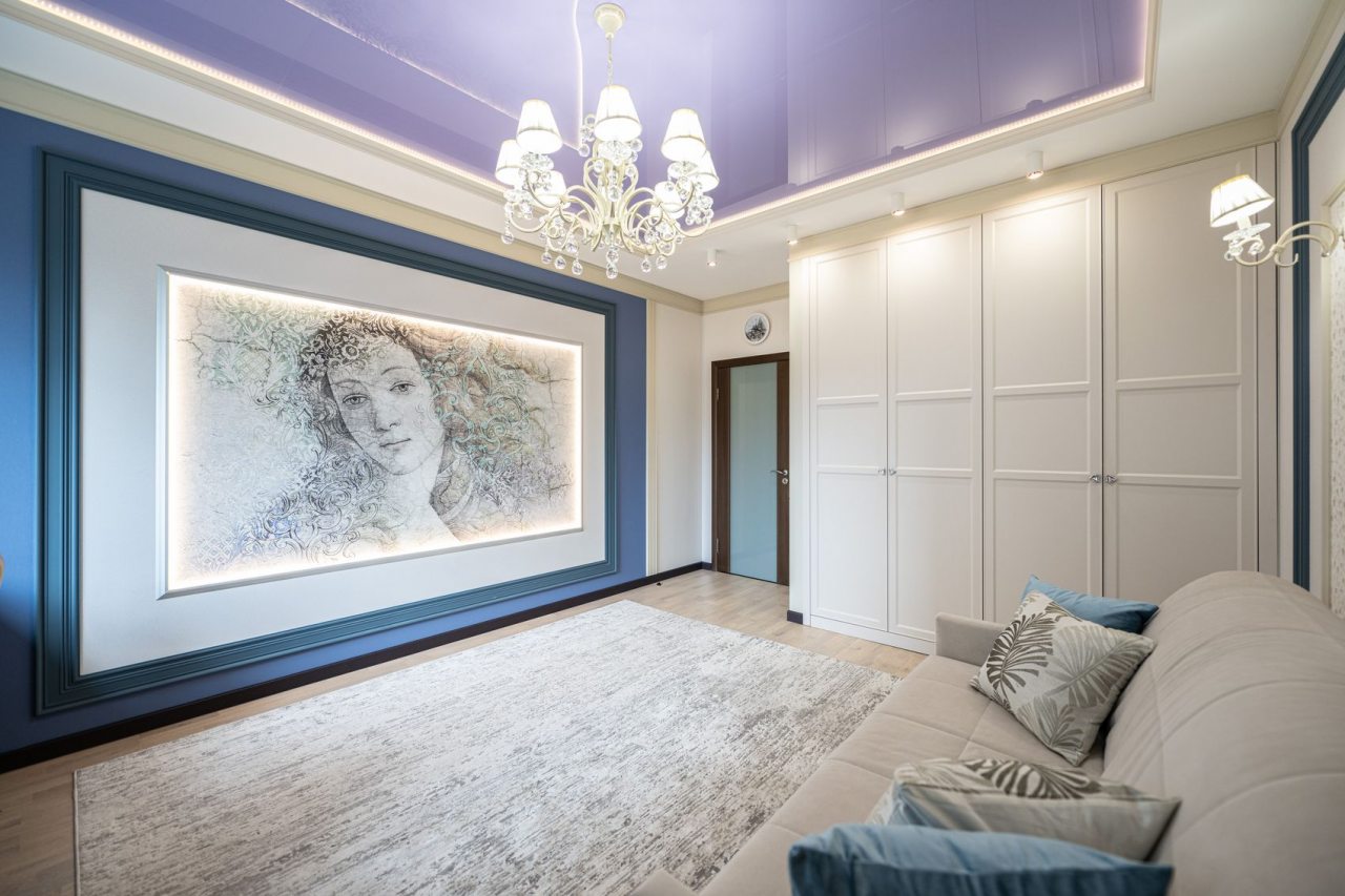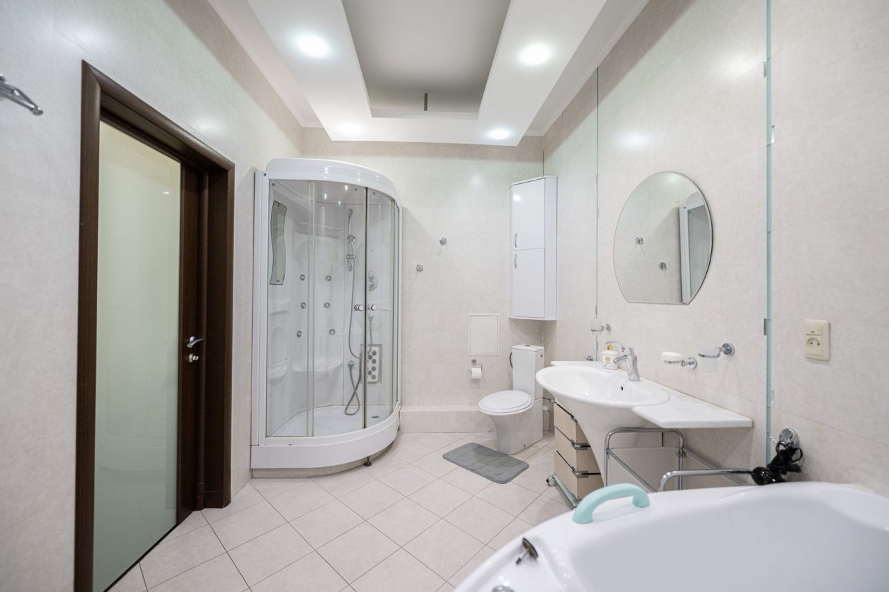 Это идеальный вариант для размещения семьей или компанией, поскольку на площади 112 квадратных метров имеется двуспальная кровать с мягким изголовьем и качественным матрасом, прикроватные лампы и тумбы, два вместительных дивана, письменный стол у окна, различные шкафы, а также просторный санузел со стиральной машиной, душевой кабиной и ванной с гидромассажем.