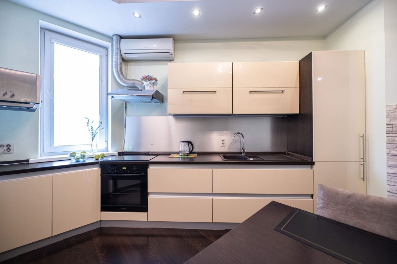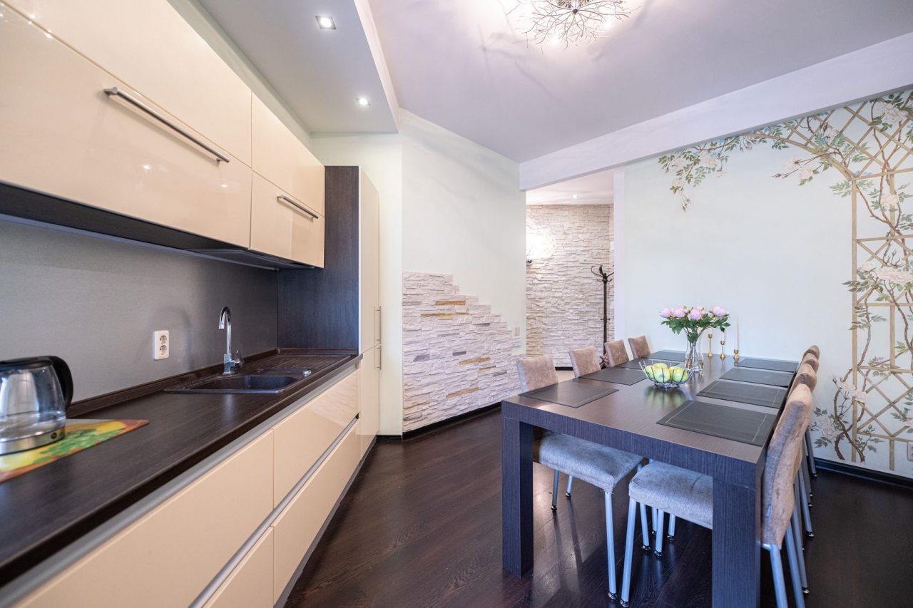 На кухне будет приятно готовить любимые блюда и трапезничать. Из бытовой техники в наличии СВЧ, варочная панель с вытяжкой, чайник, духовой шкаф, холодильник.