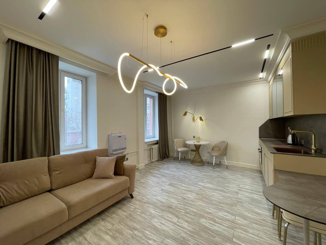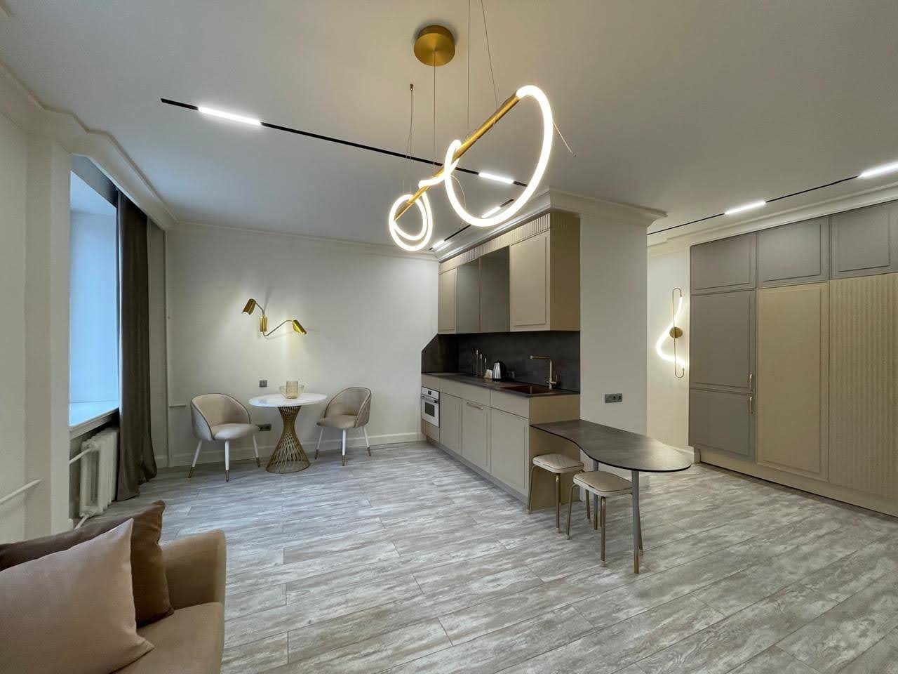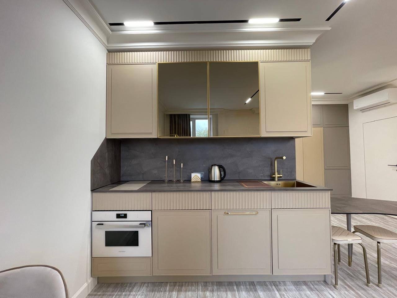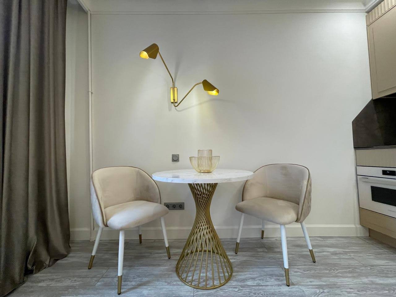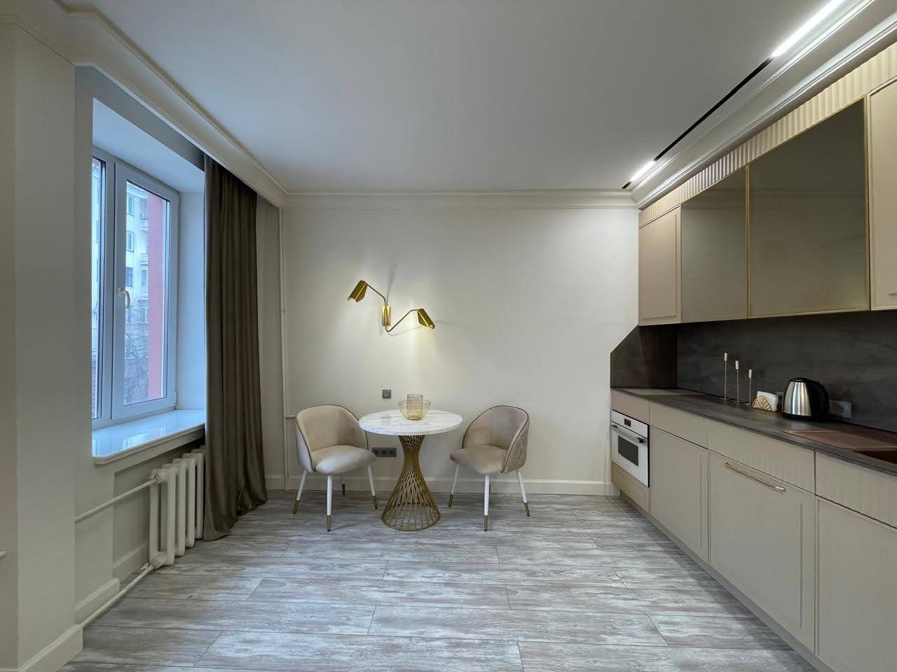 Кухонная зона оснащена стильным гарнитуром, обеденным столом и необходимой бытовой техникой. Пообедать можно в ближайшем кафе.