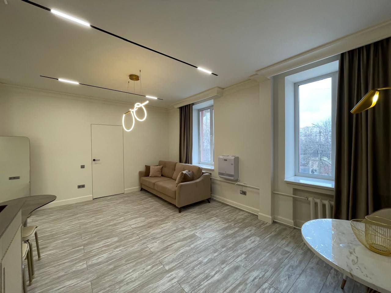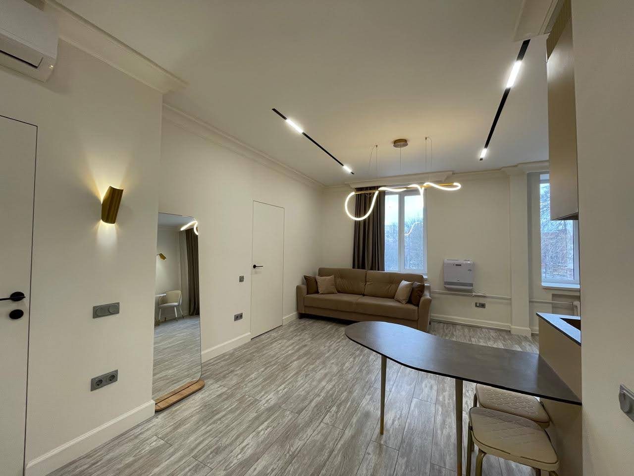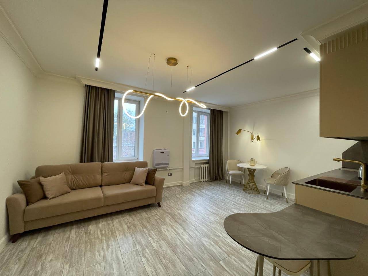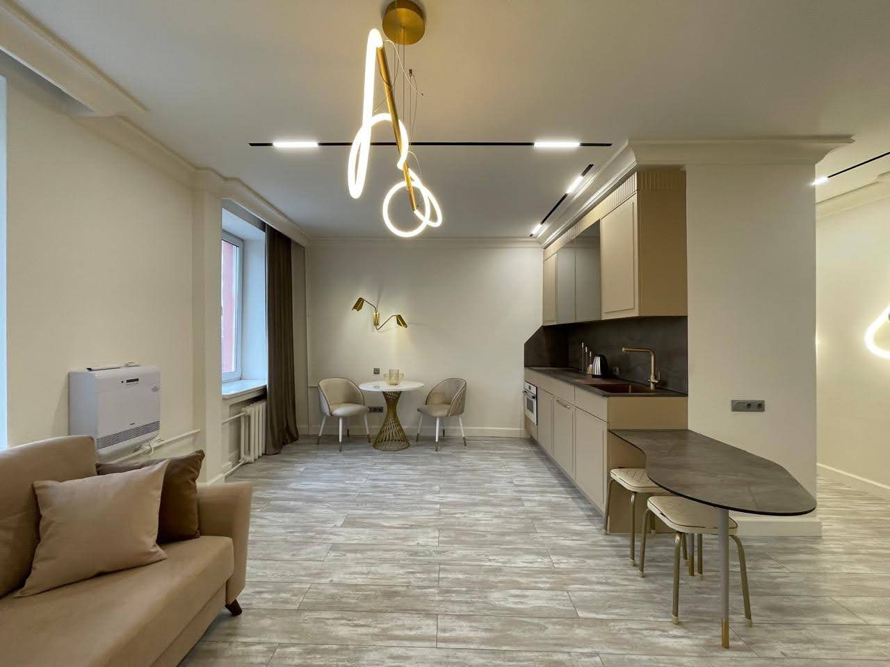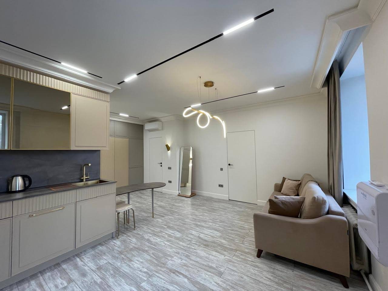 Кухонная зона оснащена стильным гарнитуром, обеденным столом и необходимой бытовой техникой. Пообедать можно в ближайшем кафе.