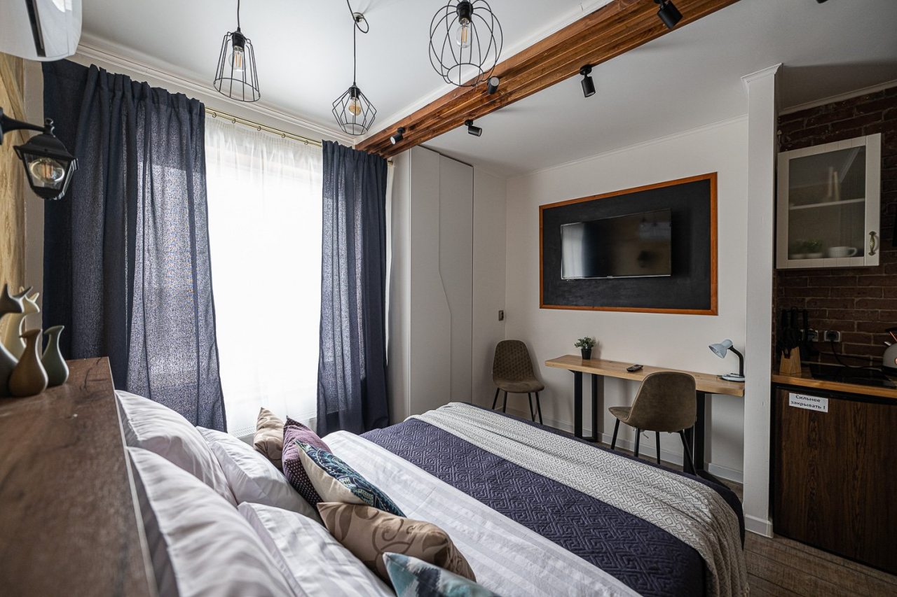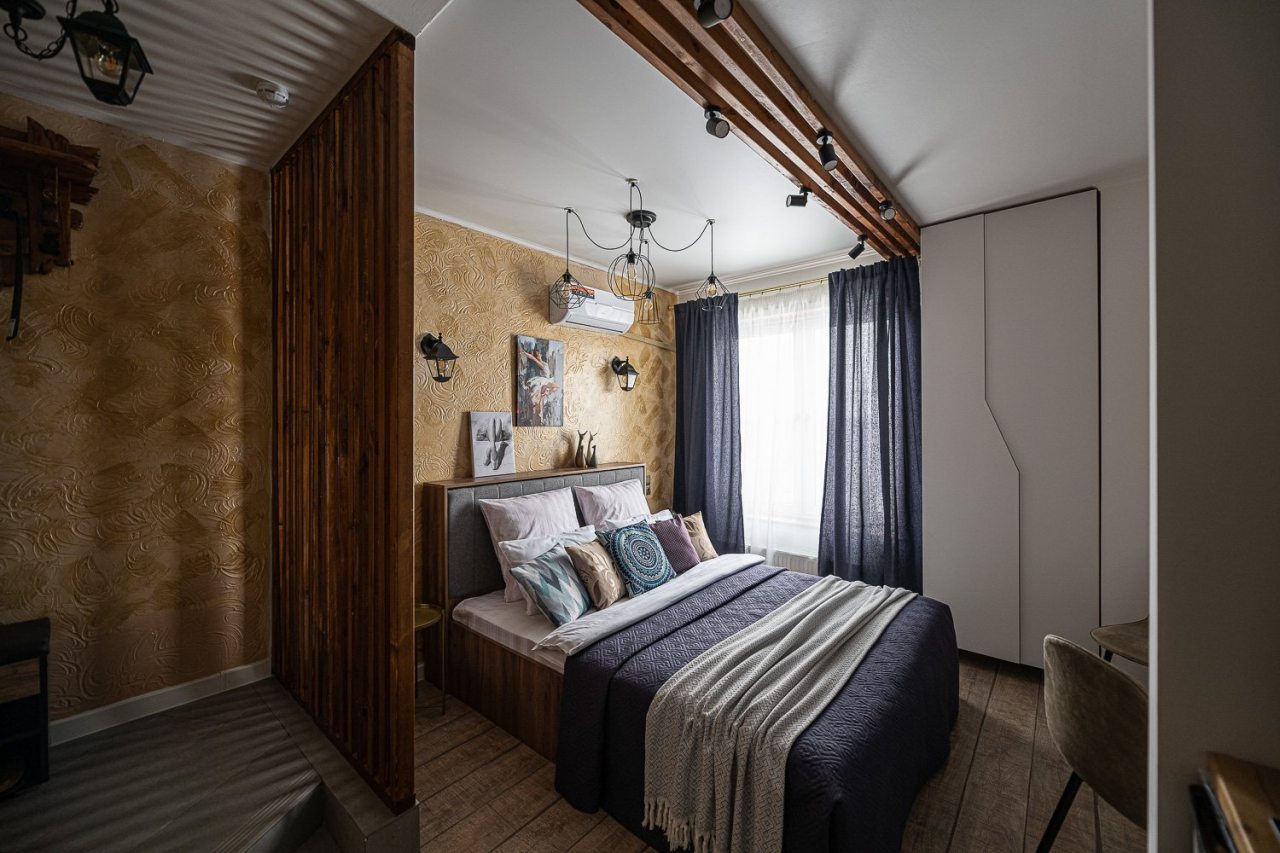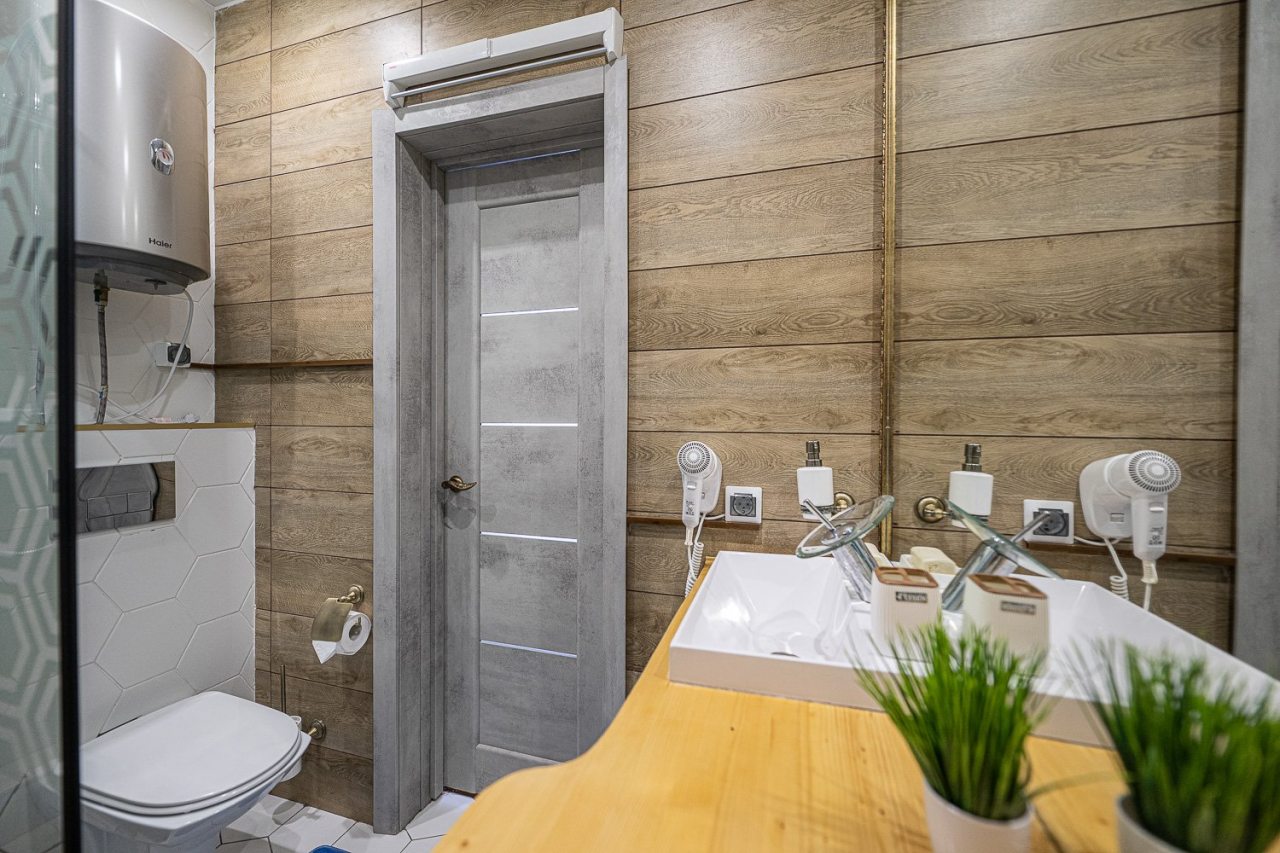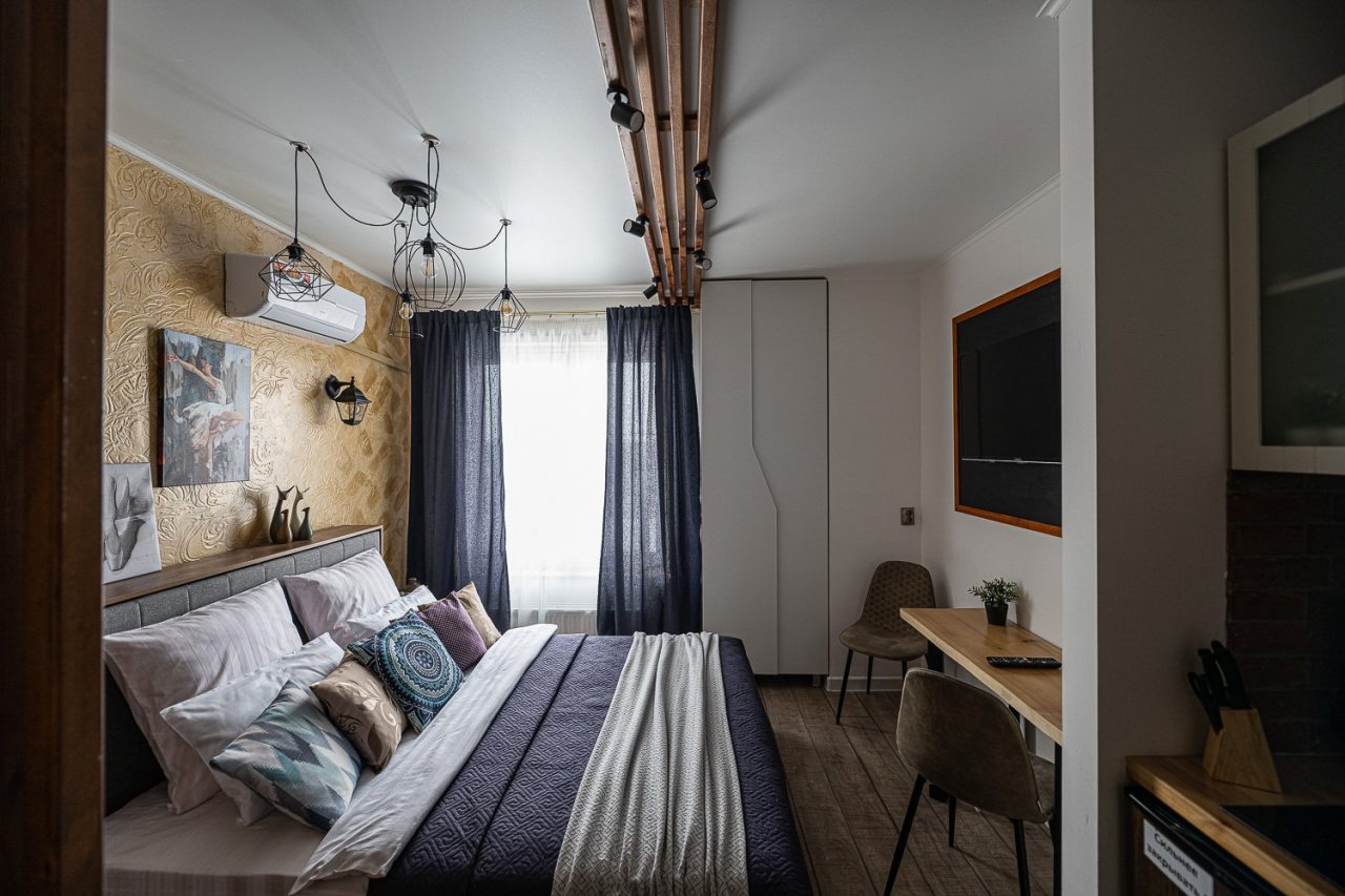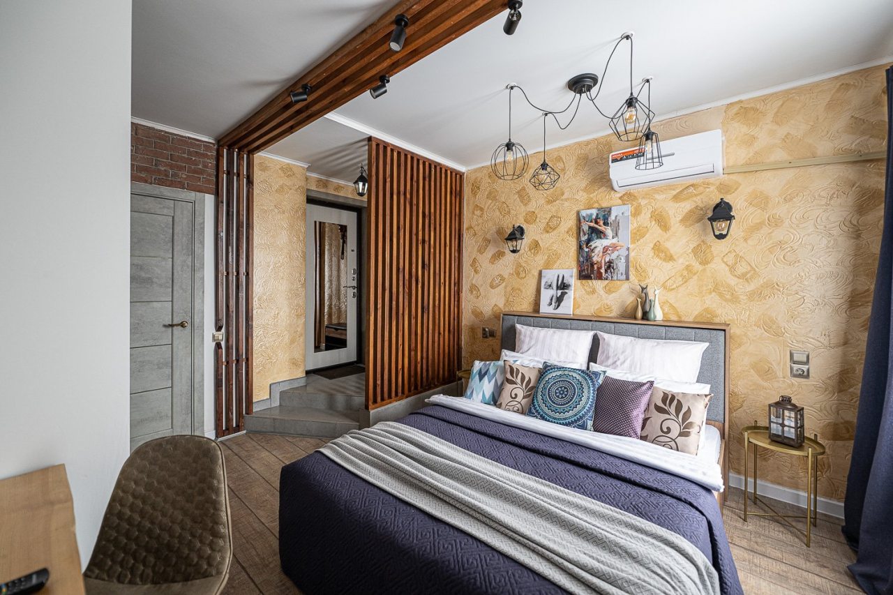 Внутри всё продумано для комфорта гостей, включая стильный дизайн, удобную двуспальную кровать, телевизор, кондиционер, вместительный шкаф, санузел со стиральной машиной, полотенцами и халатами.