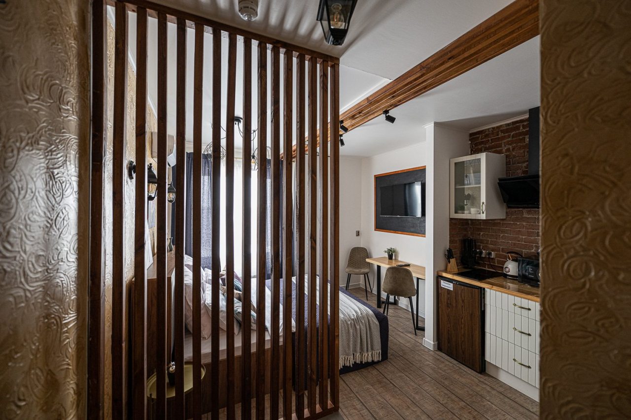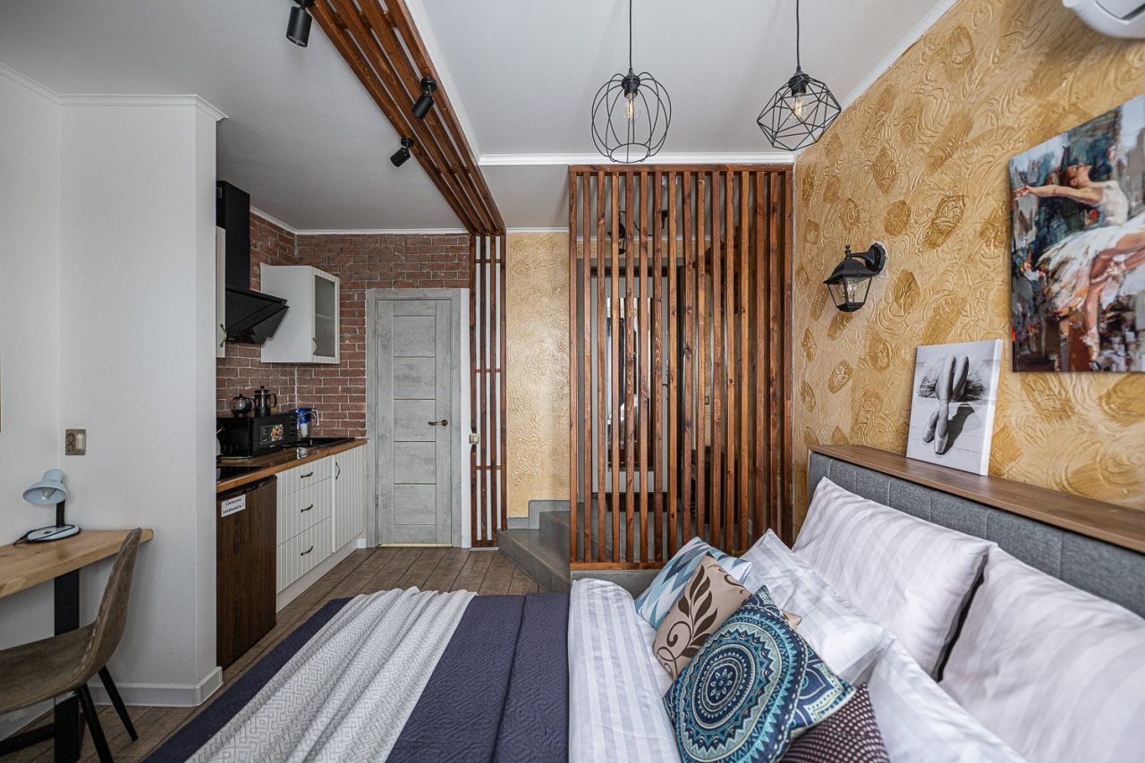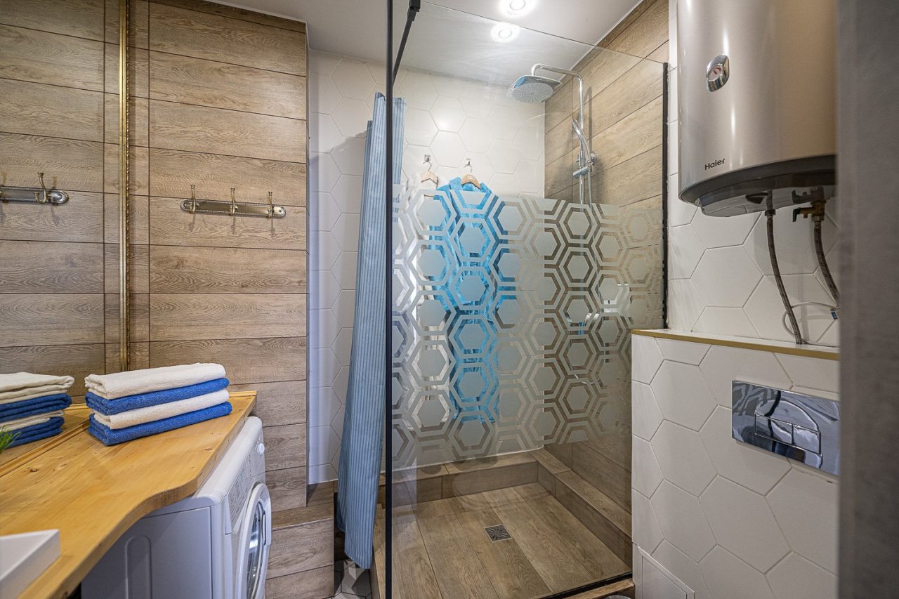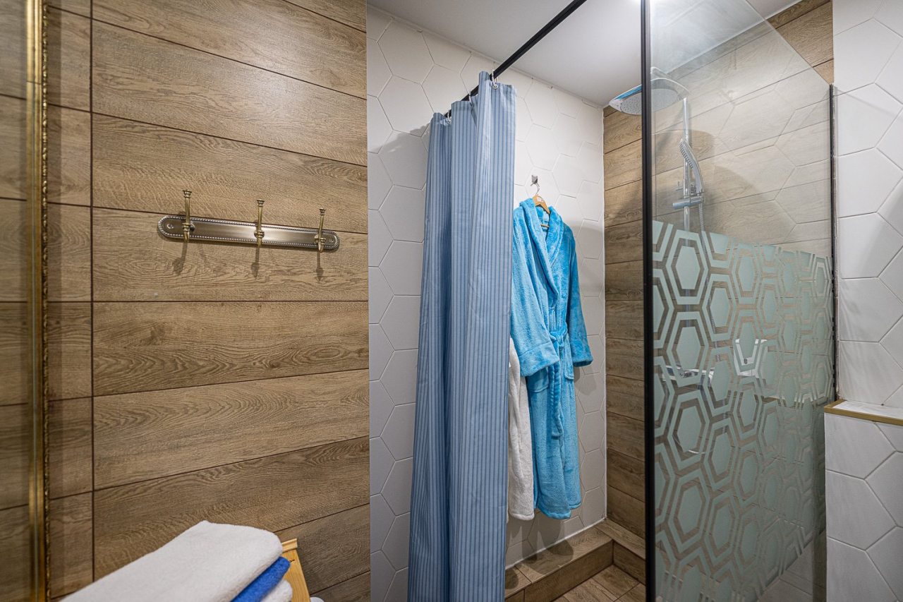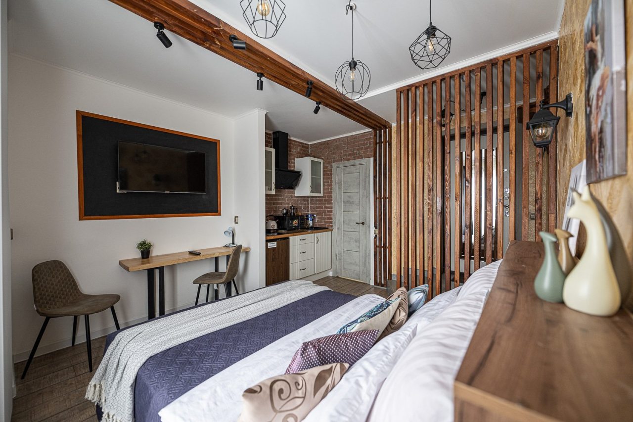 Внутри всё продумано для комфорта гостей, включая стильный дизайн, удобную двуспальную кровать, телевизор, кондиционер, вместительный шкаф, санузел со стиральной машиной, полотенцами и халатами.