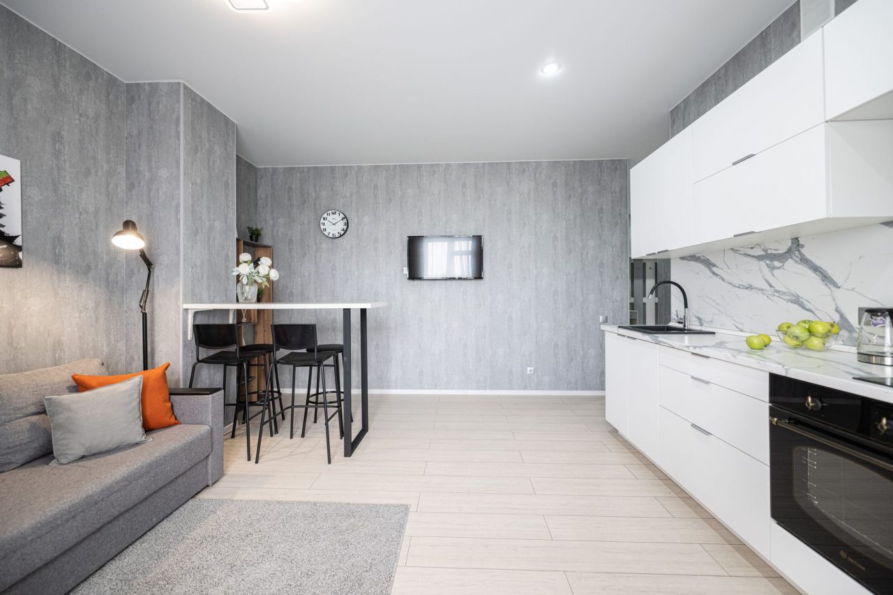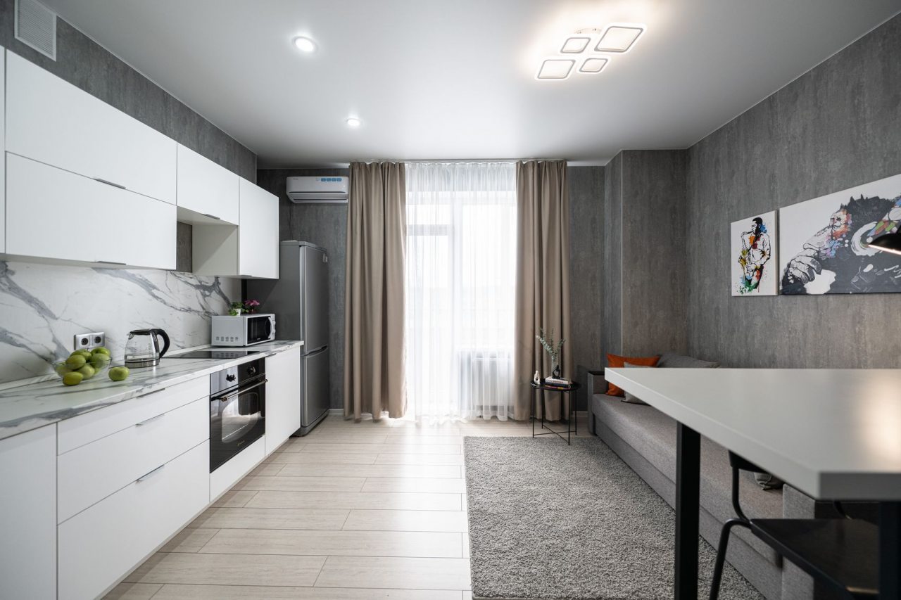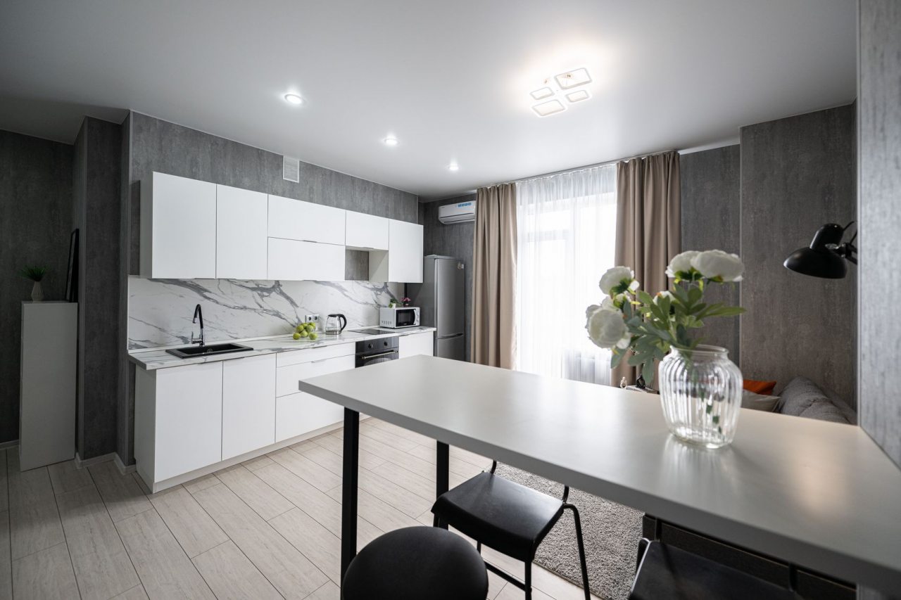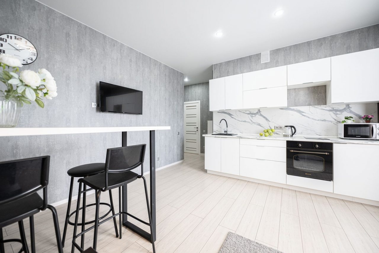 На просторной кухне будет приятно готовить любимые блюда, так как имеются варочная панель, чайник, духовой шкаф, СВЧ и красивая обеденная зона.