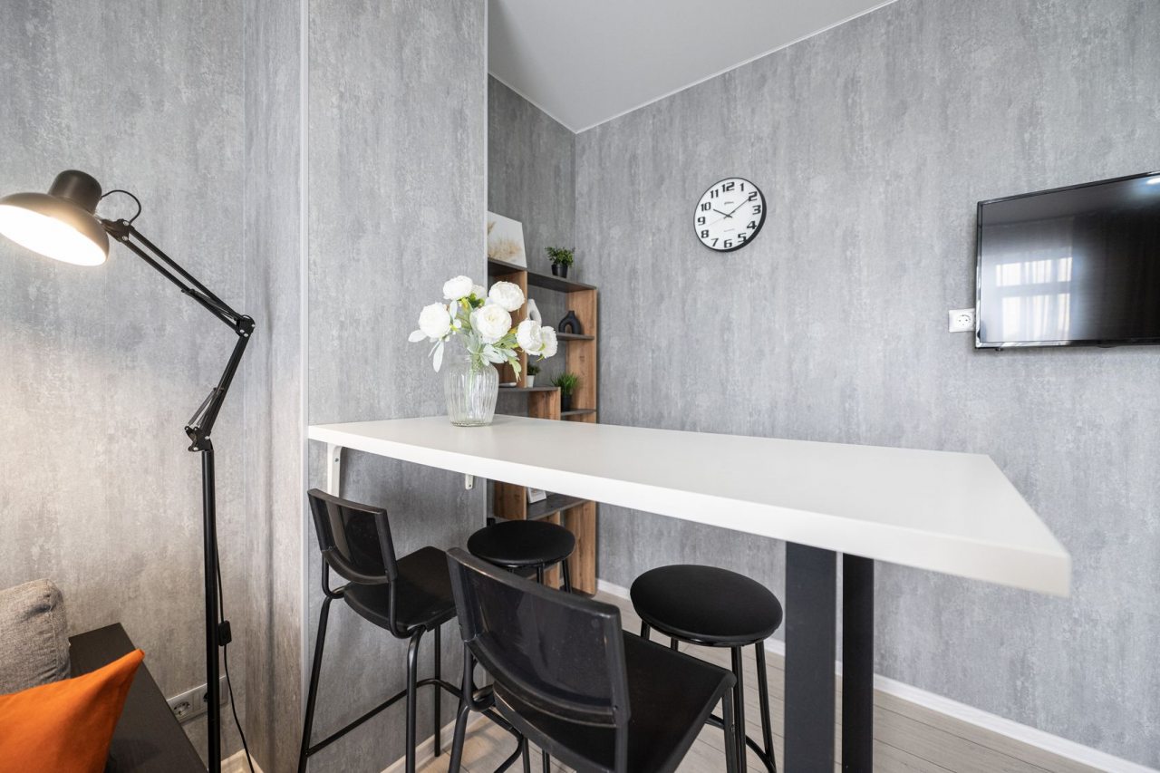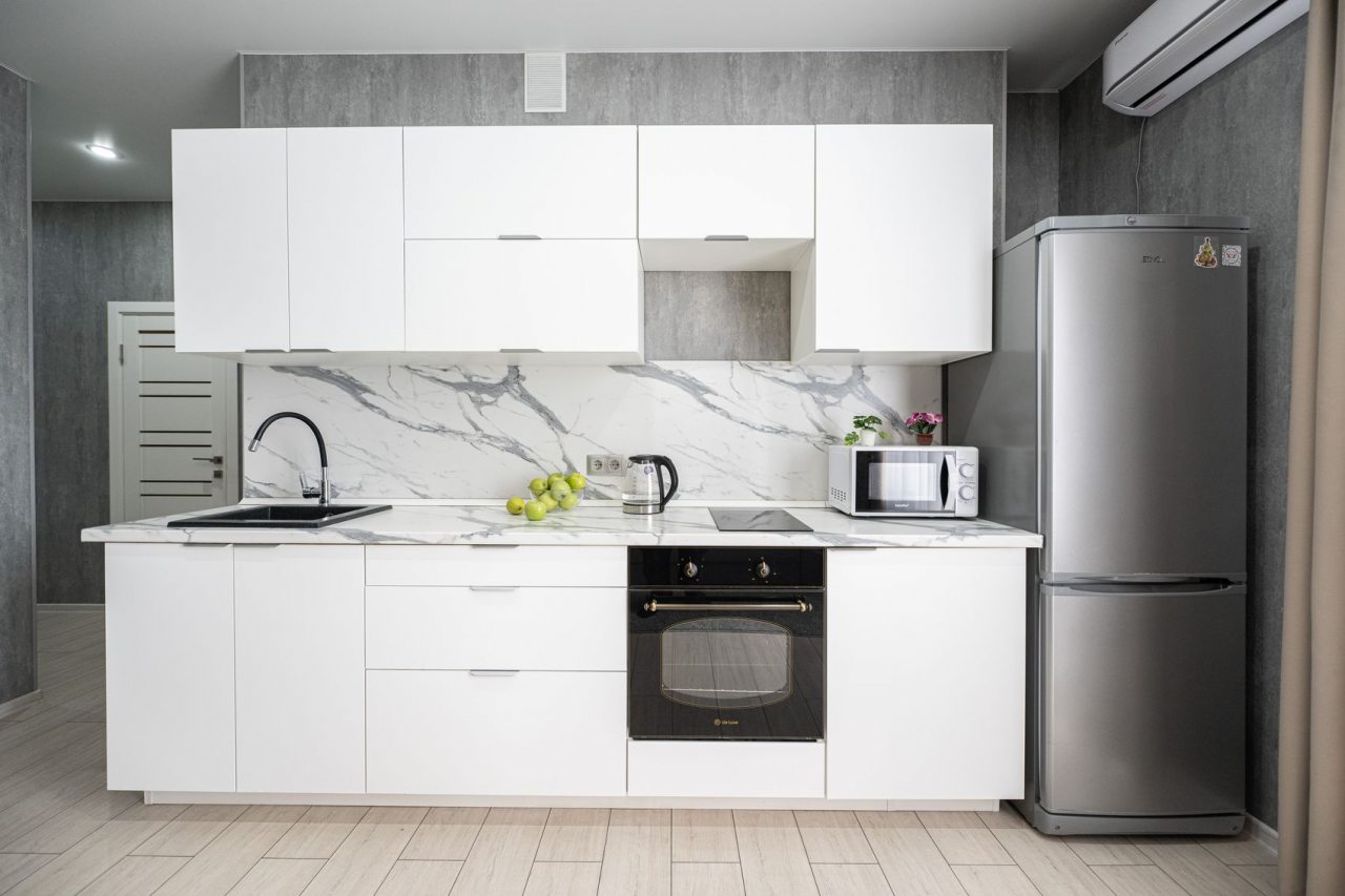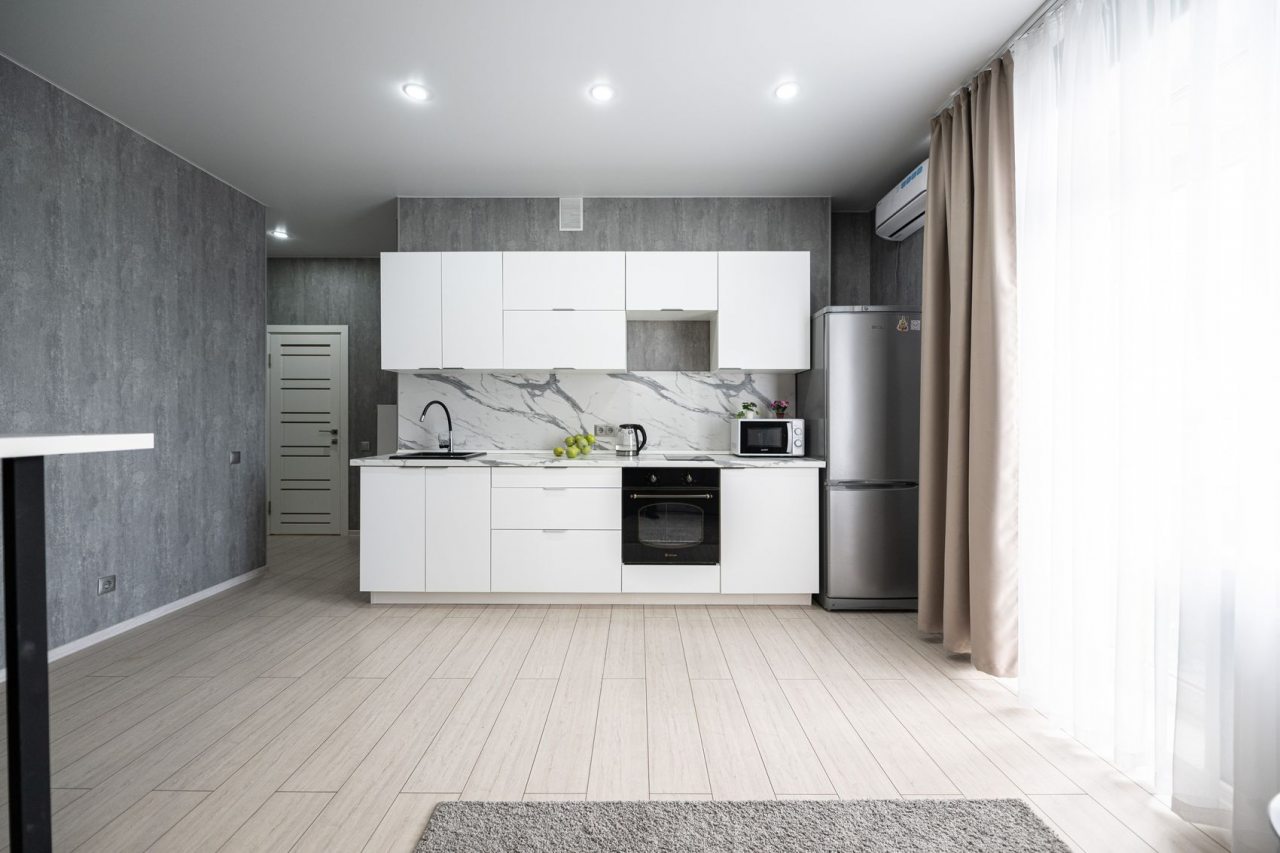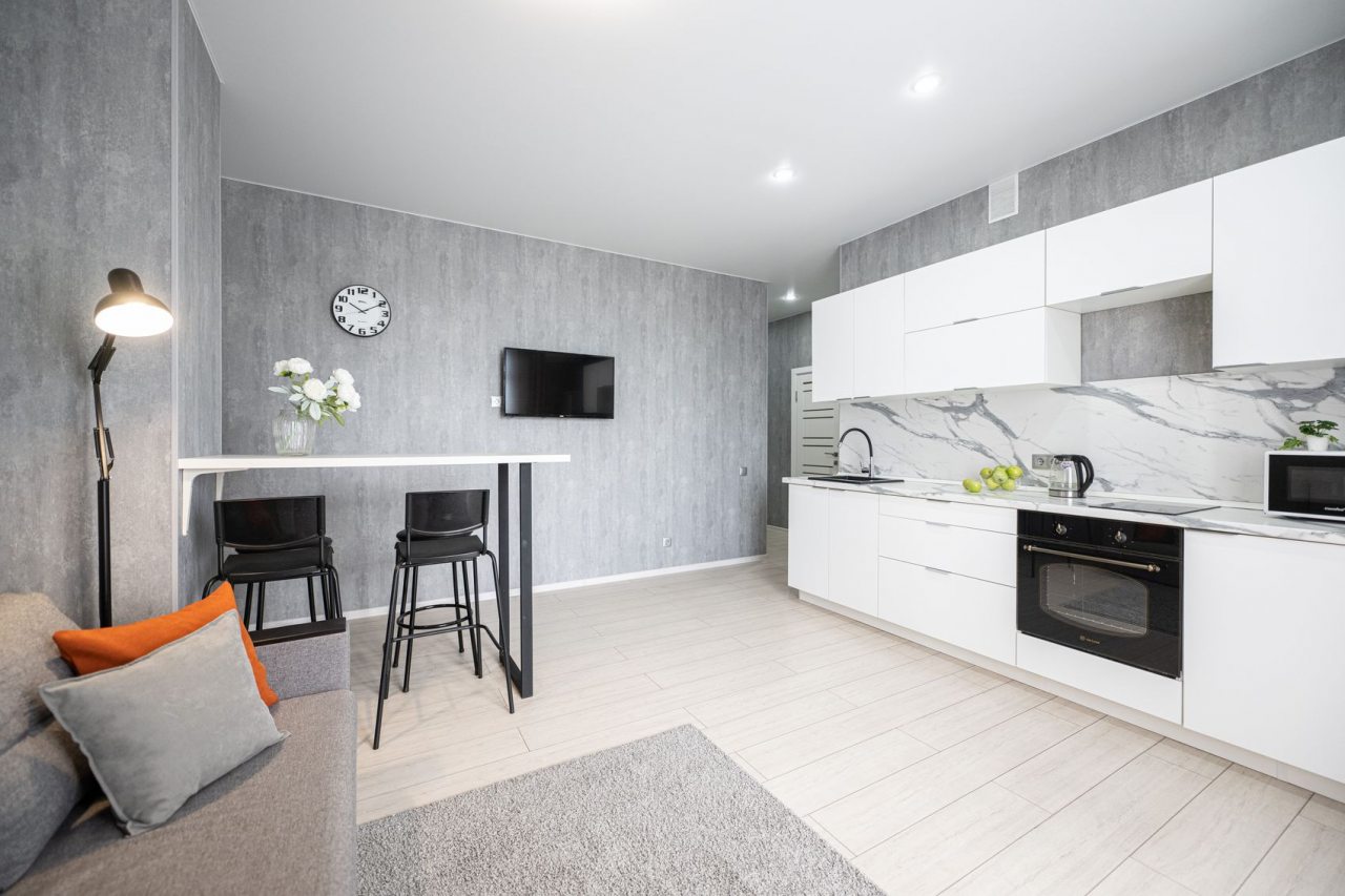 На просторной кухне будет приятно готовить любимые блюда, так как имеются варочная панель, чайник, духовой шкаф, СВЧ и красивая обеденная зона.