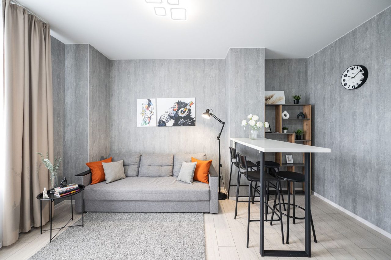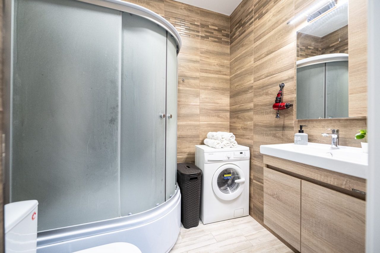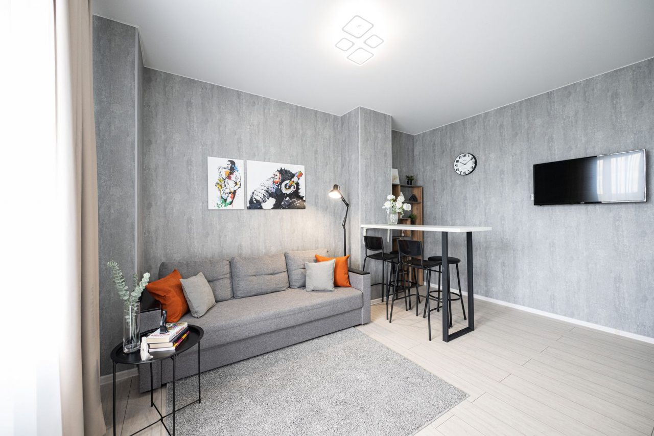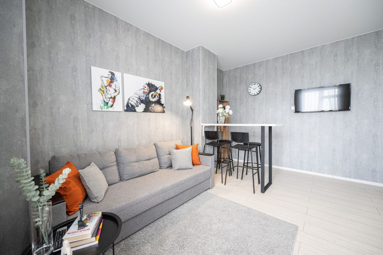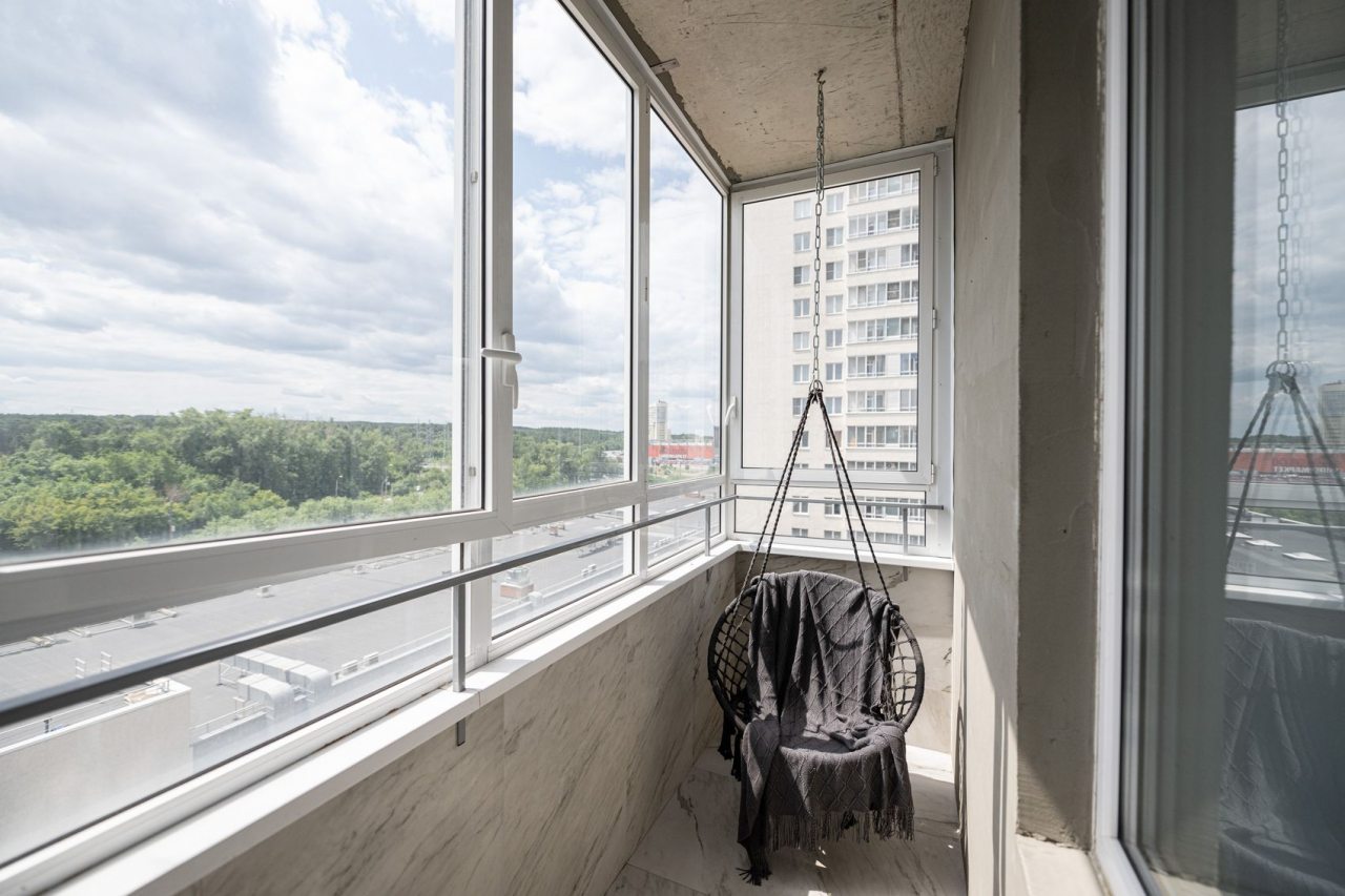 Для отдыха и расслабления предусмотрена комфортная двуспальная кровать, мягкий диван с телевизором, кресло-качели на лоджии. Среди дополнительных удобств — затемненные шторы, шкаф, санузел со стиральной машиной, феном и набором полотенец.