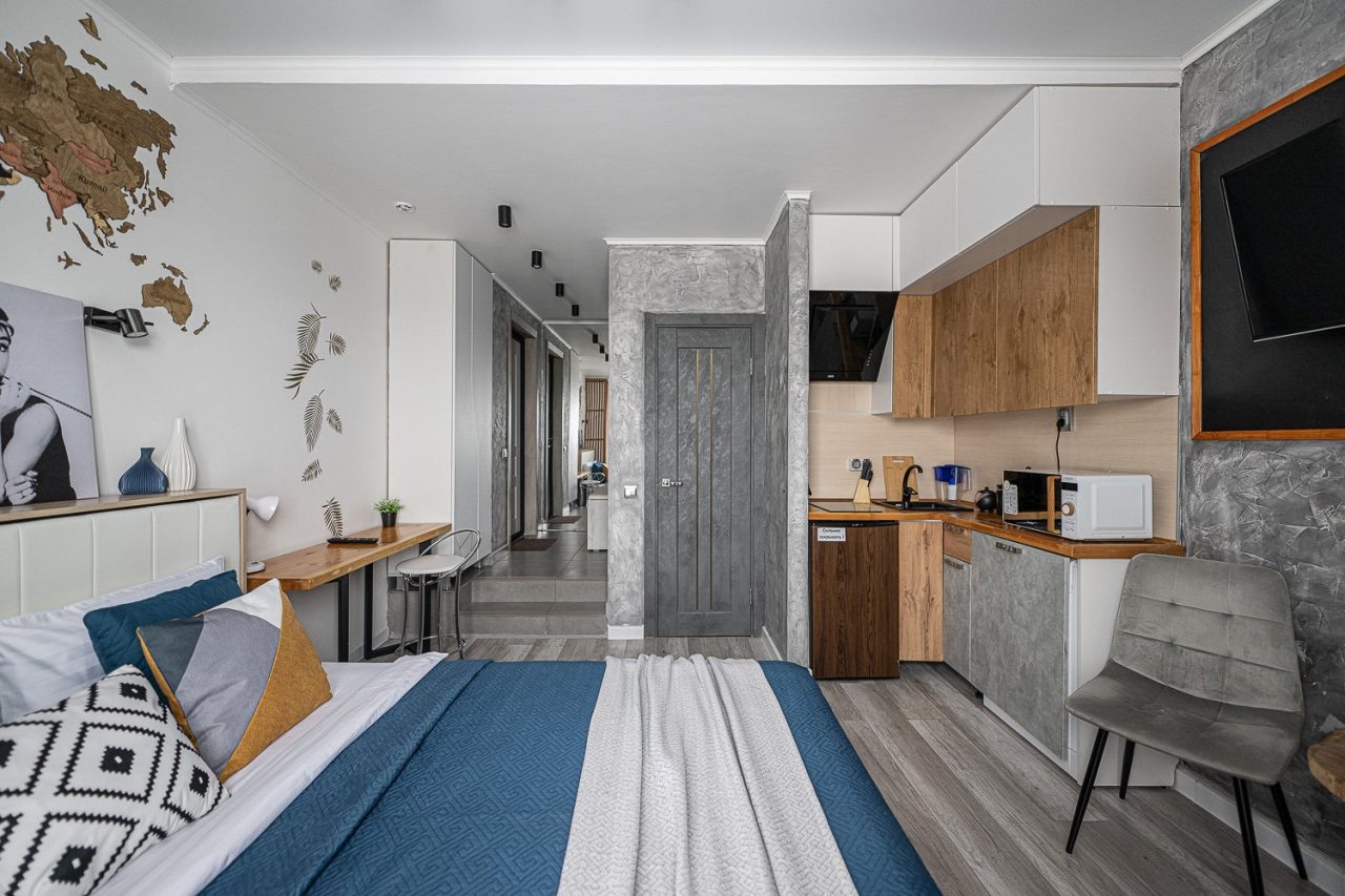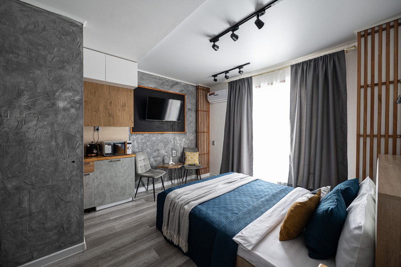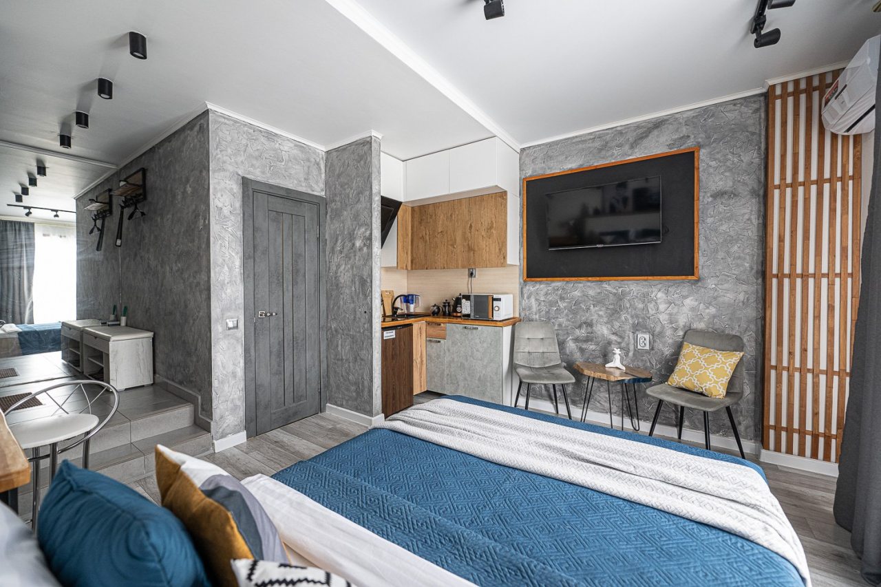 Апартаменты располагают всем необходимым для комфортного проживания гостей, в том числе удобной кроватью, телевизором и рабочим столом. Ванная комната оснащена современной техникой. Благодаря стильному дизайну гости будут чувствовать себя максимально уютно.