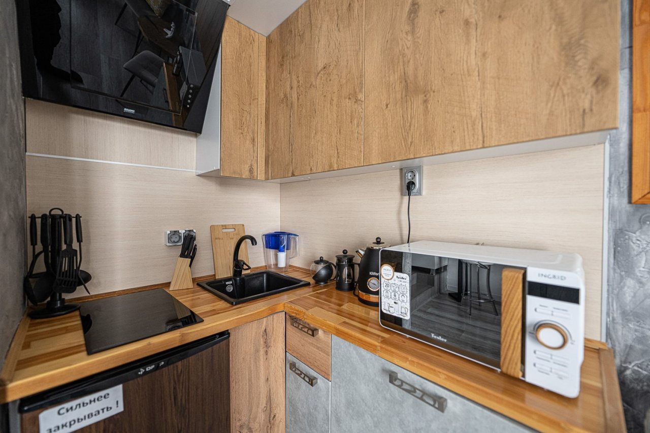 На кухонной зоне расположена бытовая техника и набор посуды для самостоятельной организации питания. Рядом работают продуктовые магазины и кафе.