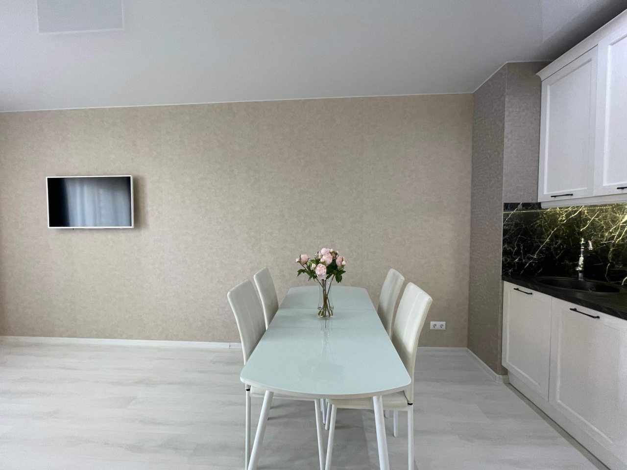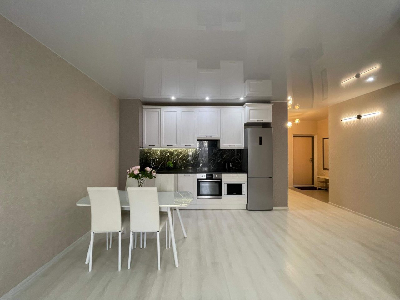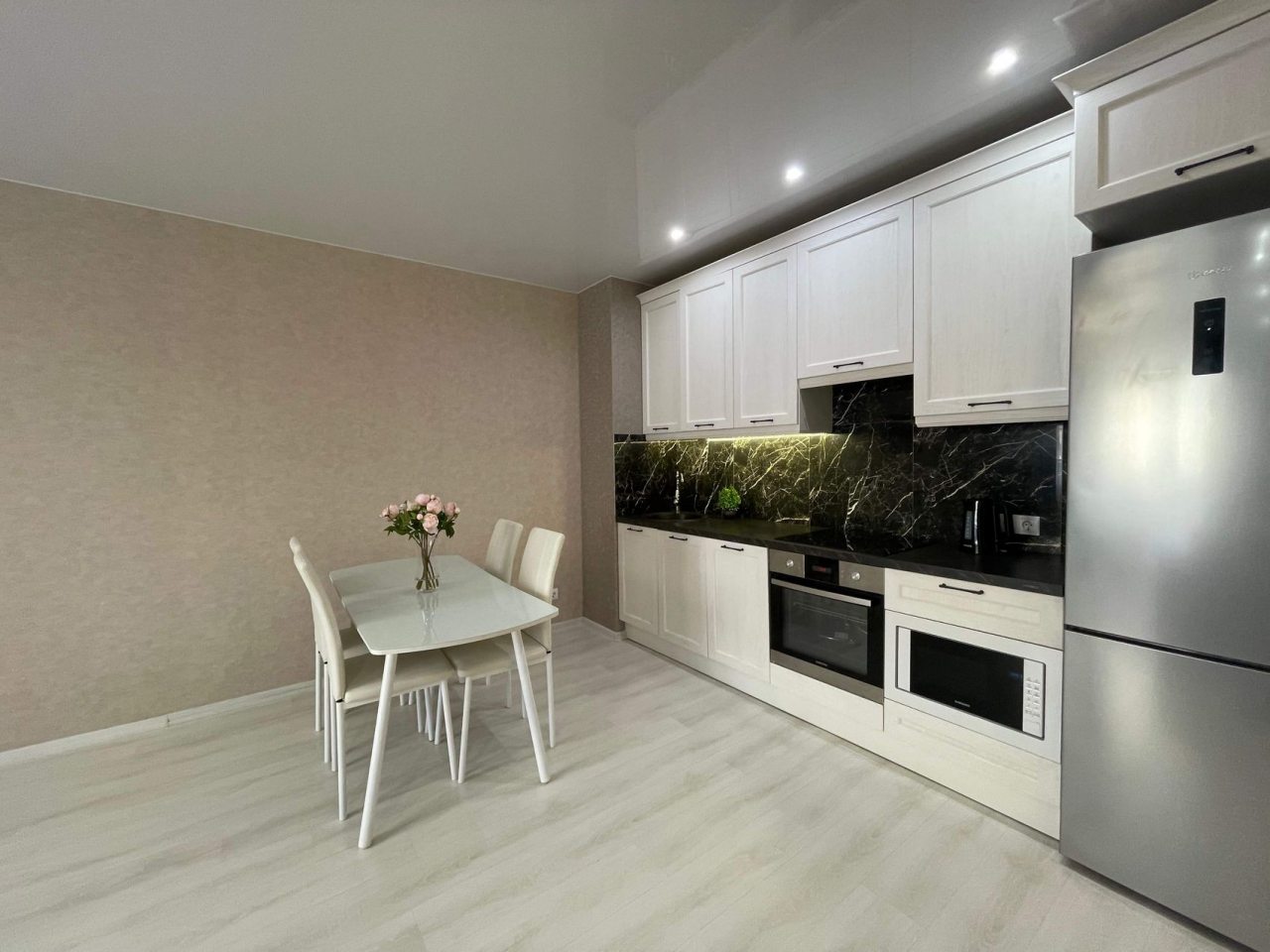 На кухне предусмотрена уютная обеденная зона и разнообразная бытовая техника, включая плиту, чайник, СВЧ-печь, духовой шкаф, чтобы вы могли с удовольствием готовить любимые блюда.