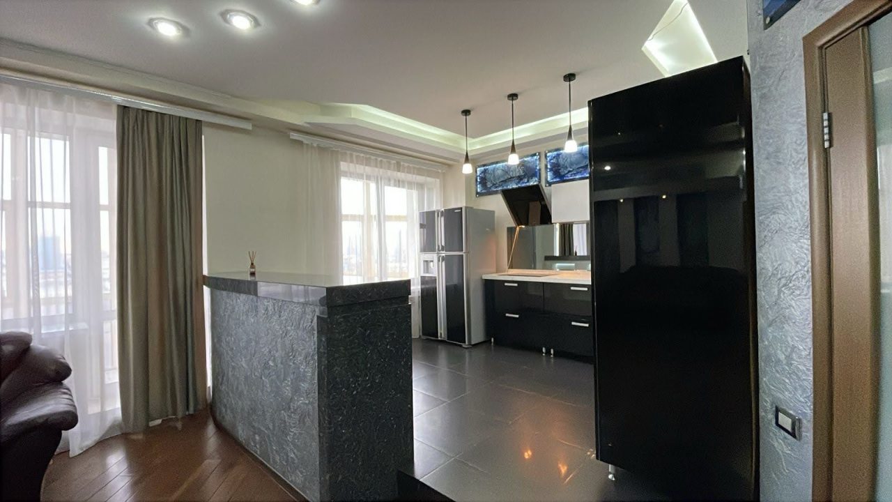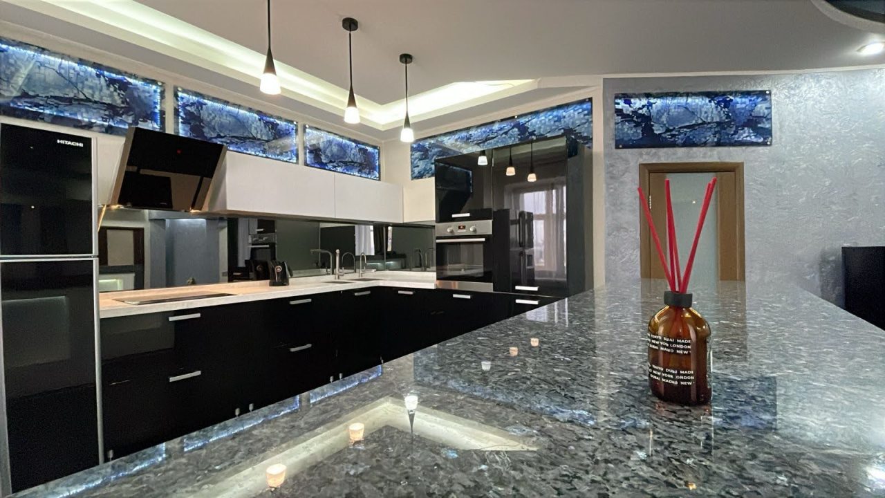 На кухне вы сможете с легкостью воплотить любую кулинарную задумку, поскольку предусмотрены духовой шкаф, варочная панель с вытяжкой, чайник, холодильник, красивая обеденная зона.