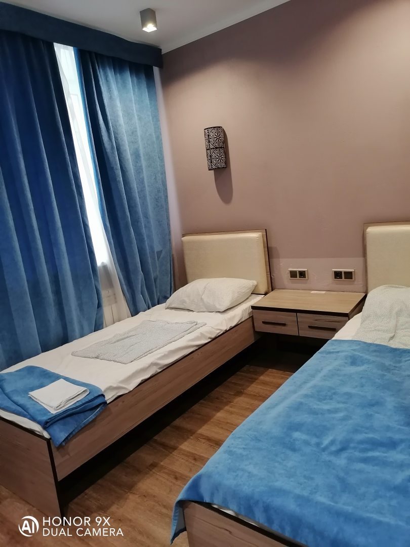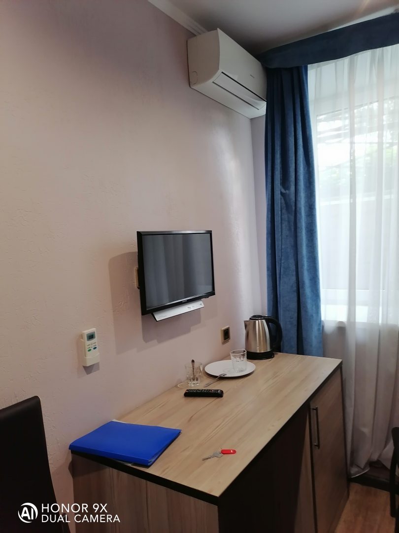 Отель расположен в удобном месте, рядом с остановками, недалеко от центра города. Отель небольшой, расположен в цокольном помещении жилого дома, но с естественным освещением. В комнате есть холодильник, кондиционер, чайник, стаканы, ложки. Вода в кулере в коридоре. В ванной комнате теплая батарея, душ, фен, шампуни и мыло, полотенца для рук, ног и тела. Можно заказать завтраки по 250 р с 8-30 до 12-00.Если надо пораньше, то необходимо позвонить в отель заранее. Оплата за проживание на месте, это удобно. Заезд в 14-00, выезд в 12-00
