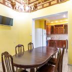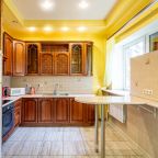 На кухне расположен большой обеденный стол, телевизор и кухонный гарнитур, укомплектованный набором техники для приготовления блюд.