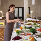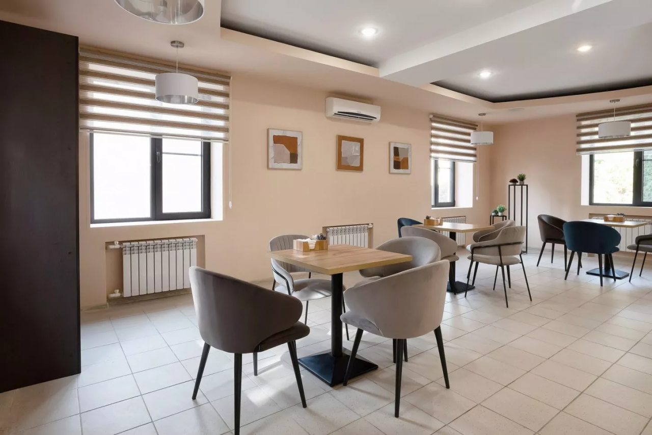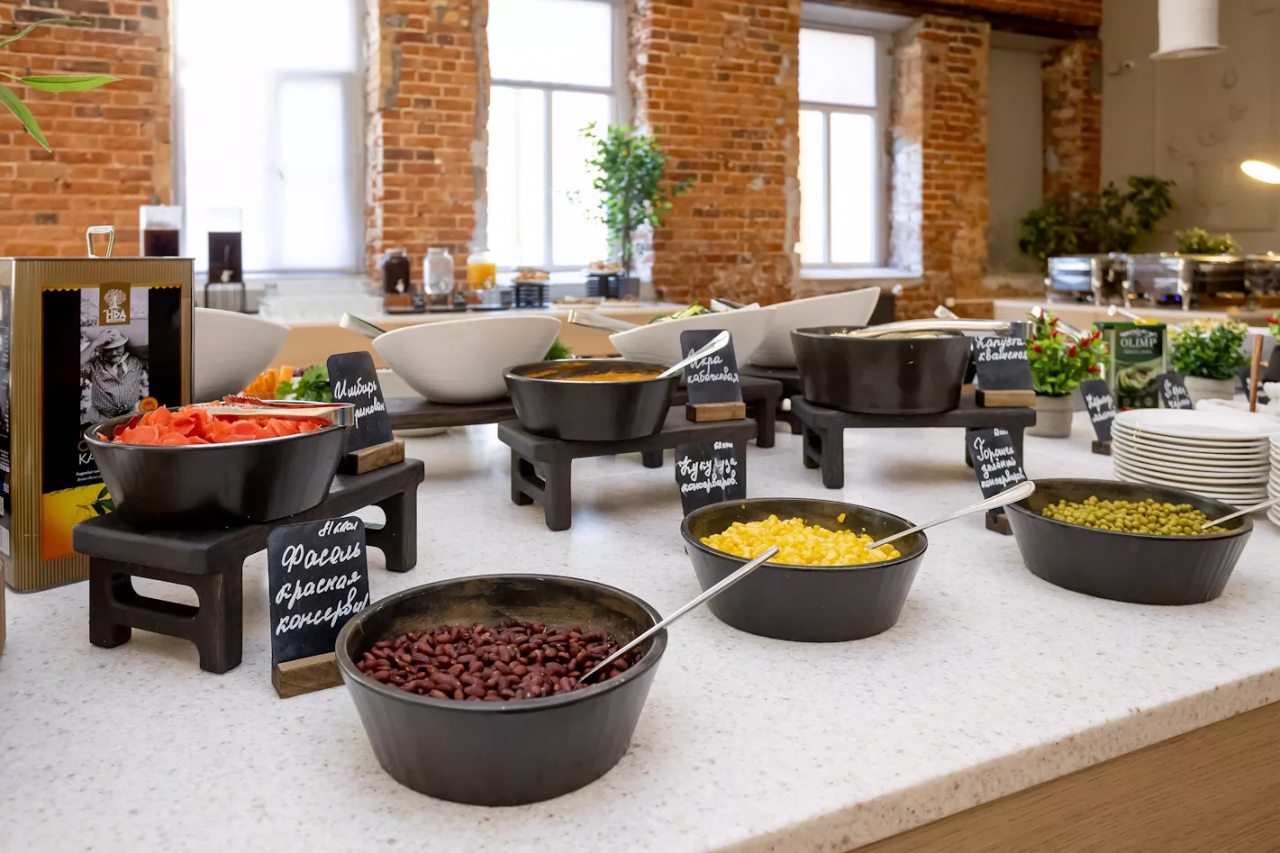 3-х разовое питание организовано по системе «Шведский стол» и включает в себя блюда европейской и русской кухни. На территории есть кофейня, где можно выпить вкусное зерновое кофе и ресторан «Званый ужин».