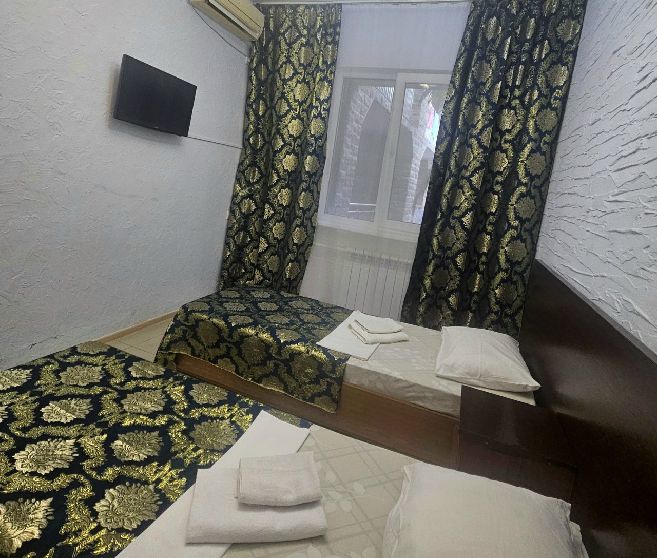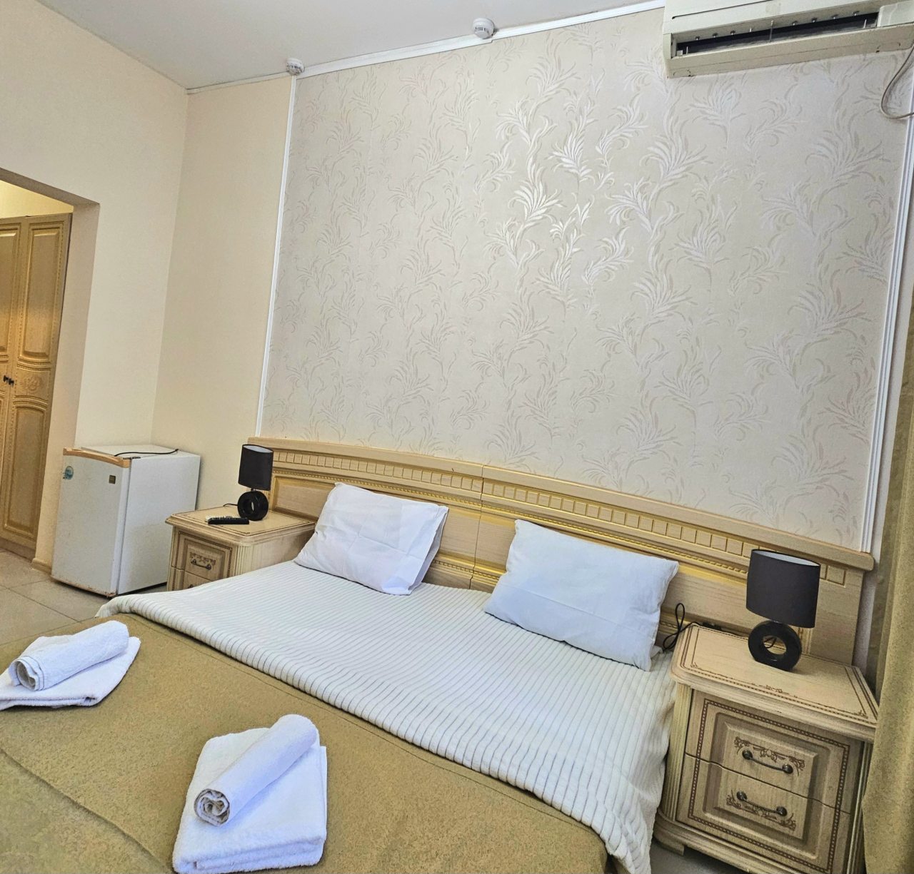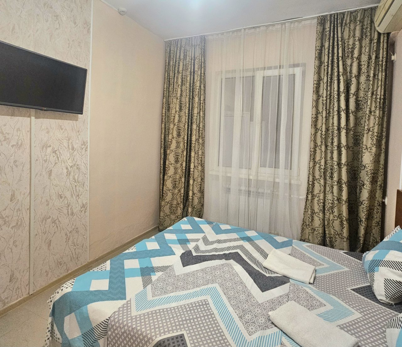 В номере чисто большая кровать и полуторка для ребёнка, кондиционер холодильник, телевизор