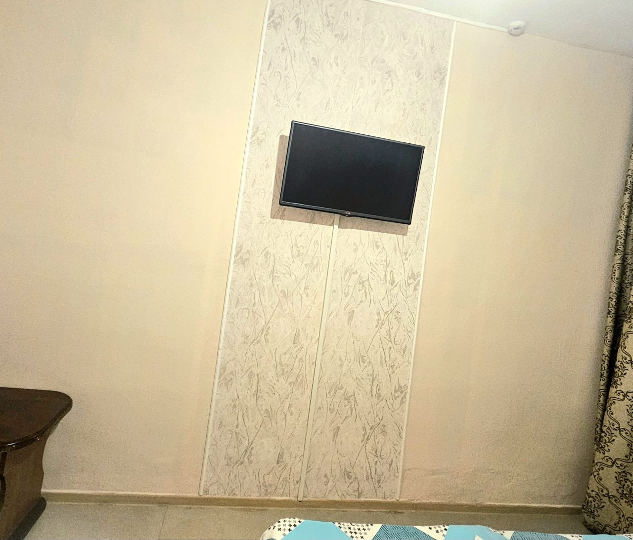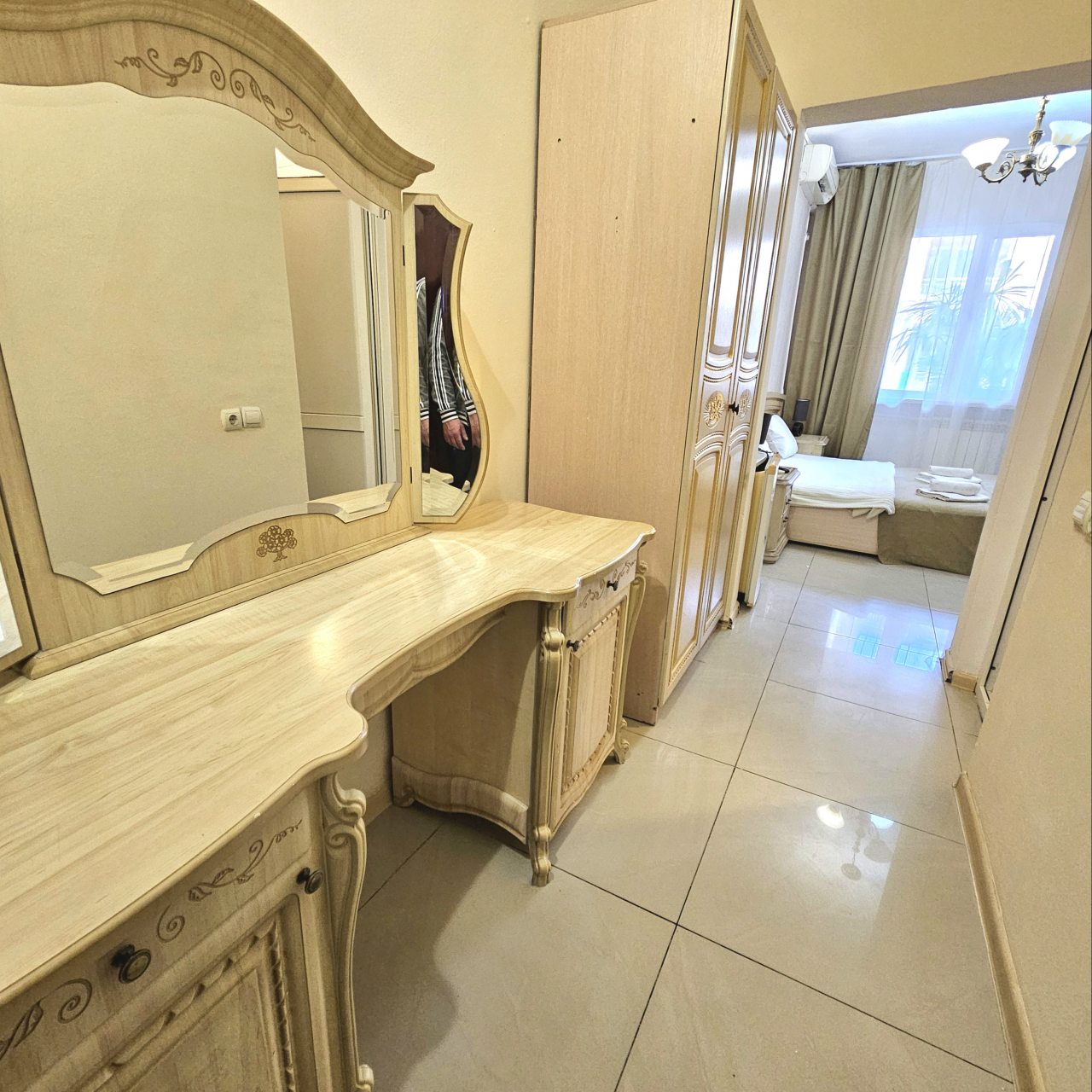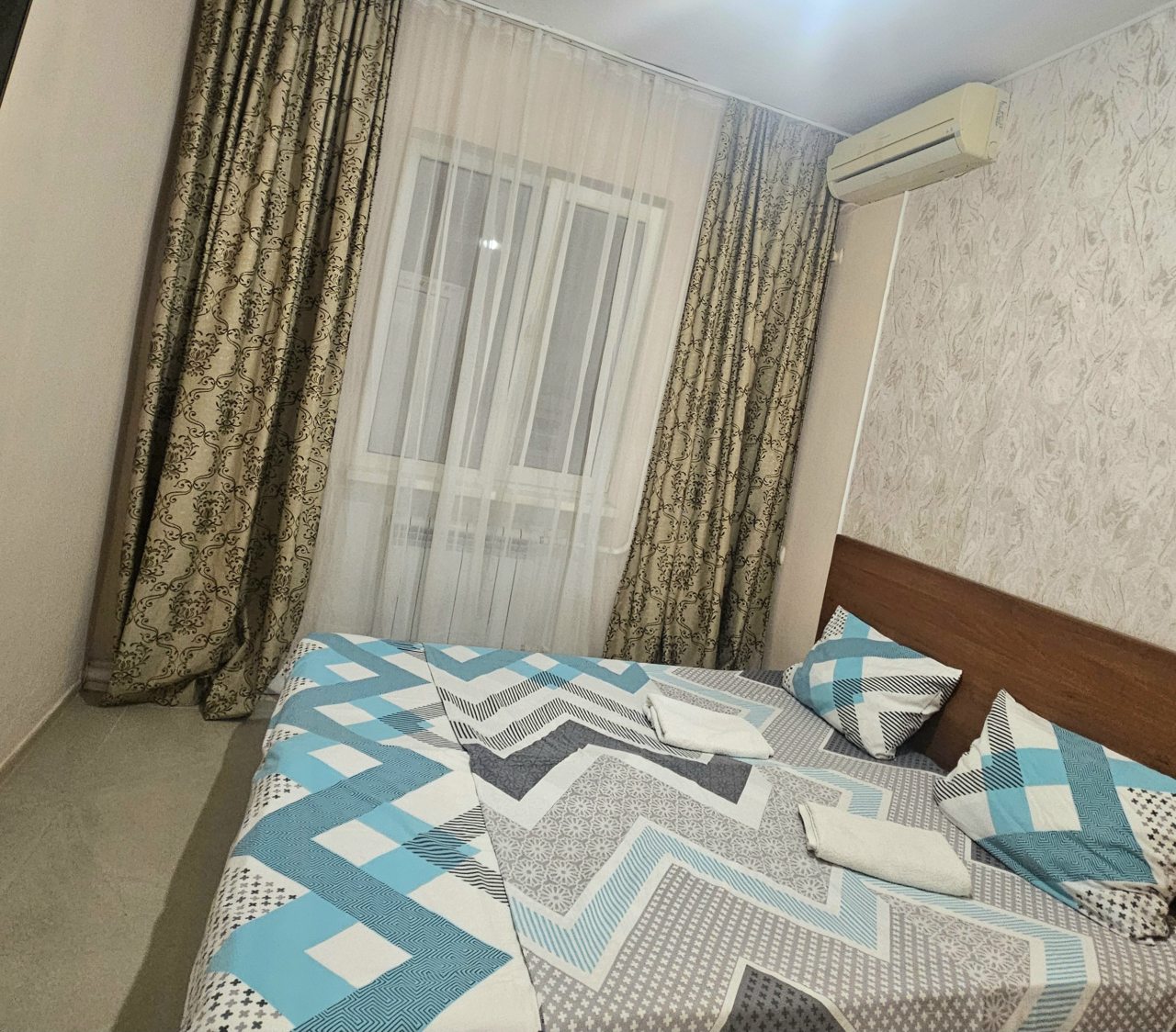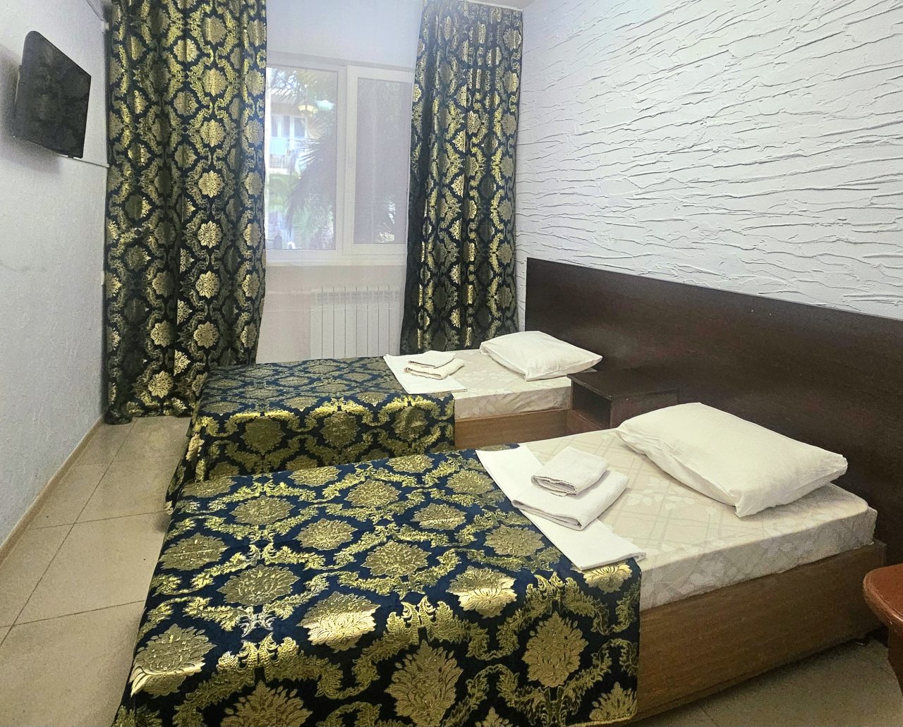 В номере чисто большая кровать и полуторка для ребёнка, кондиционер холодильник, телевизор