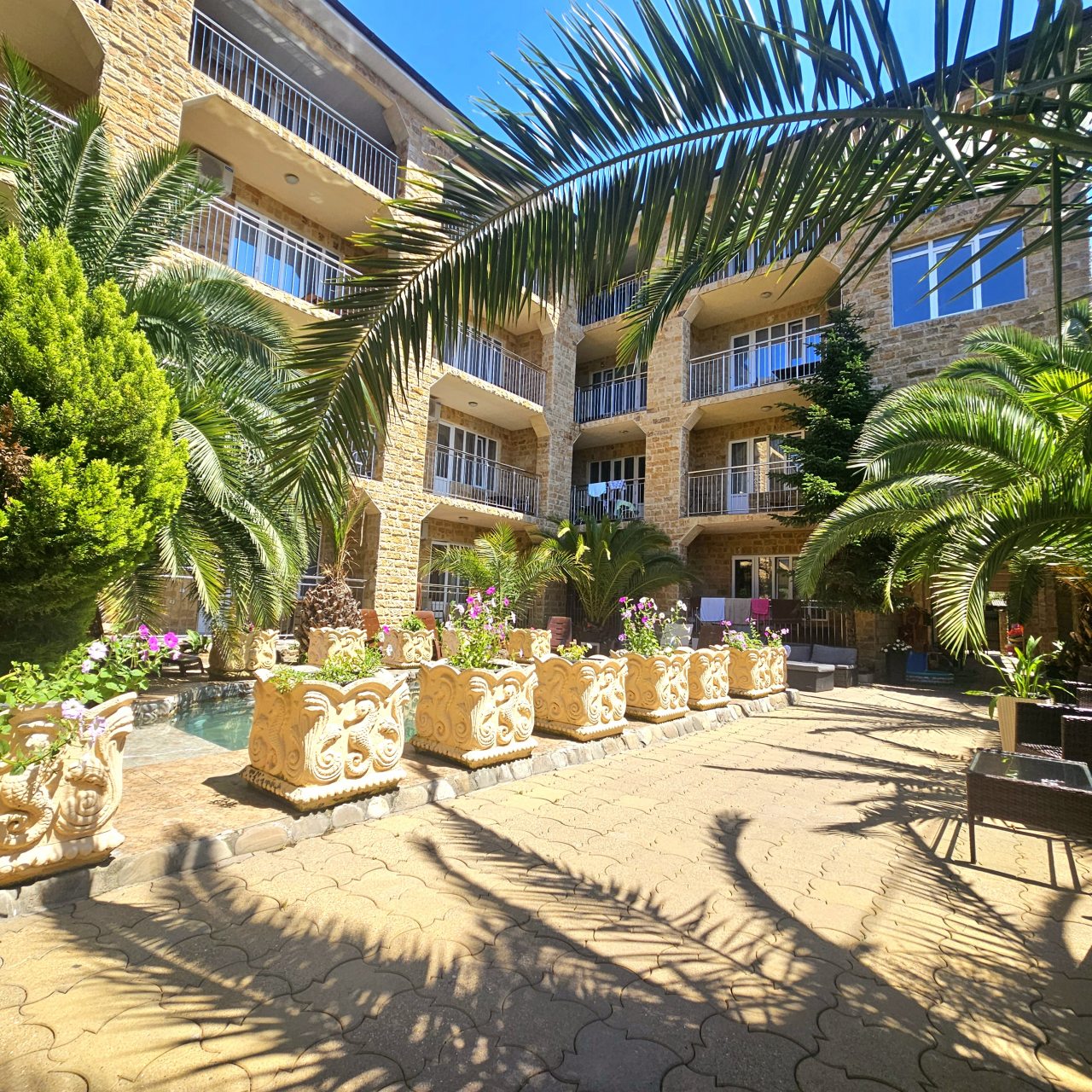 Хорошие большие номера, все с балконами. Уютный двор, бассейн. Вкусная еда. Отзывчивый персонал. Демократичные цены. Можно выбрать любой формат отдыха. Просто номер. Можно с завтраками. Можно Всё включено. Я останавливалась не один раз. Понравилось буквально всё