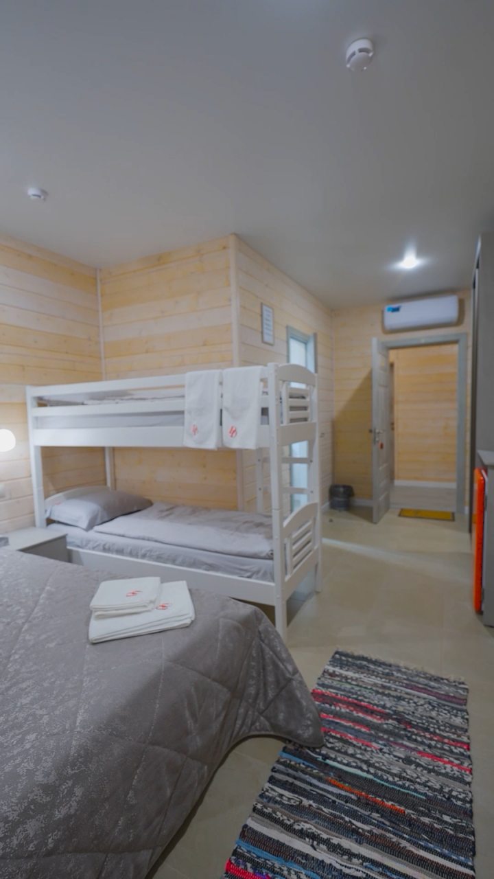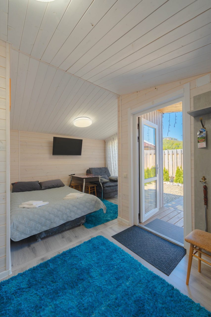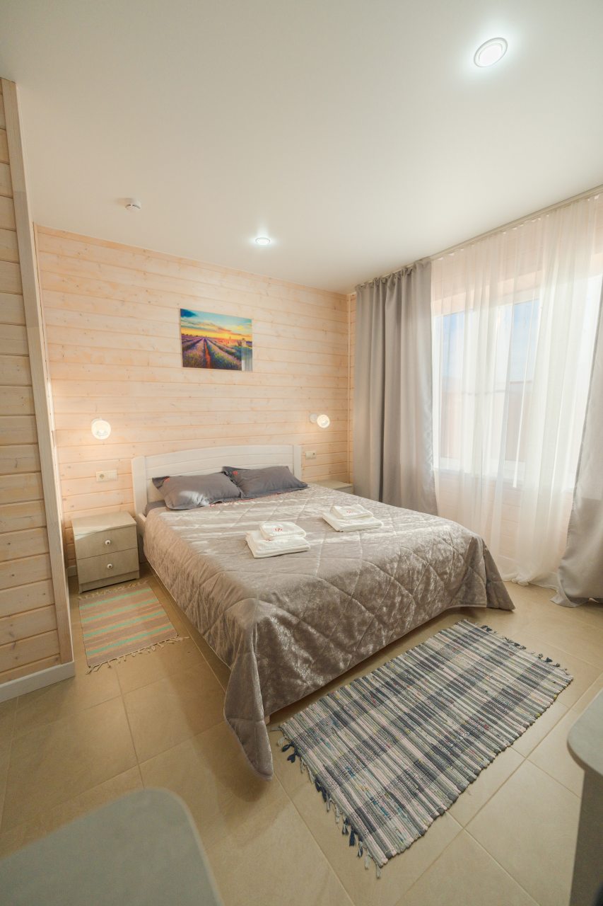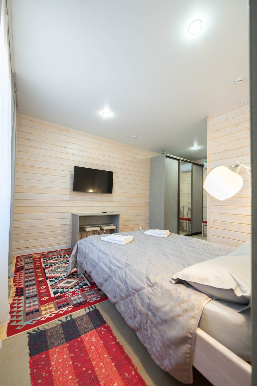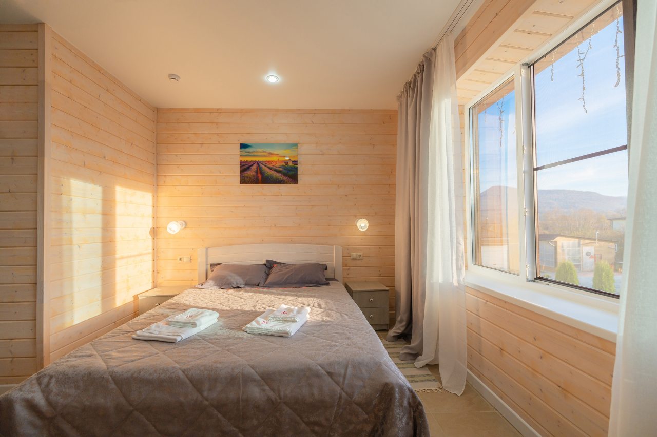 Светлые номера с видом на горы обустроены удобными спальными местами, шкафом, комодом, набором полотенец, постельным бельем, ЖК-телевизором, Wi-Fi и отдельной ванной комнатой с необходимыми гигиеническими средствами.