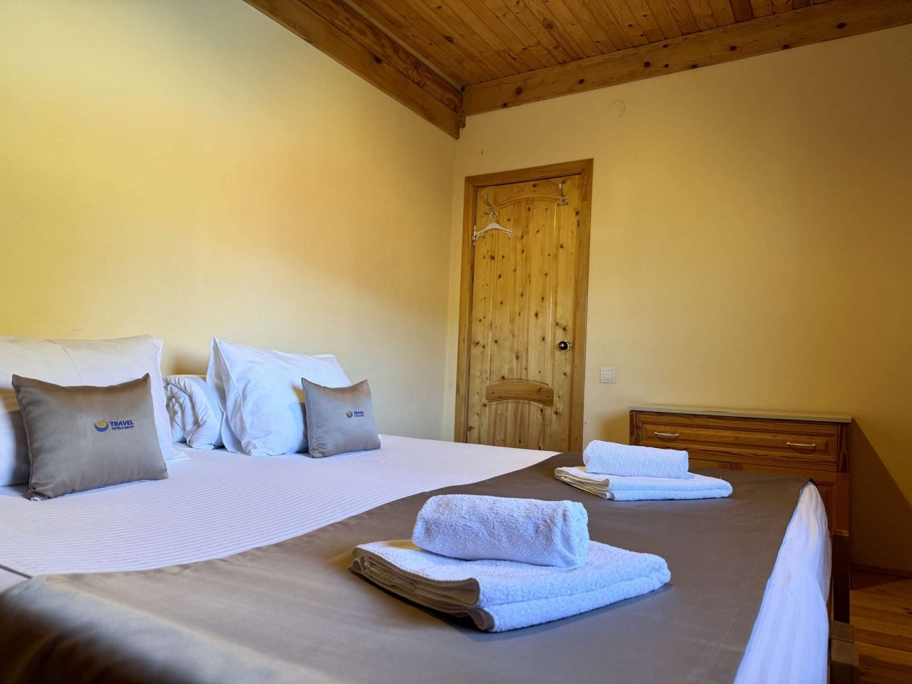 В оформлении комнат были использованы натуральные материалы из дерева для создания атмосферы тепла и уюта. Внутри имеется всё необходимое для жизни и отдыха, включая удобные кровати с набором постельного белья, плотные шторы, телевизор, различную мебель для хранения вещей, а также ванную комнату с туалетно-косметическими принадлежностями. Из окон открываются захватывающие горные виды.