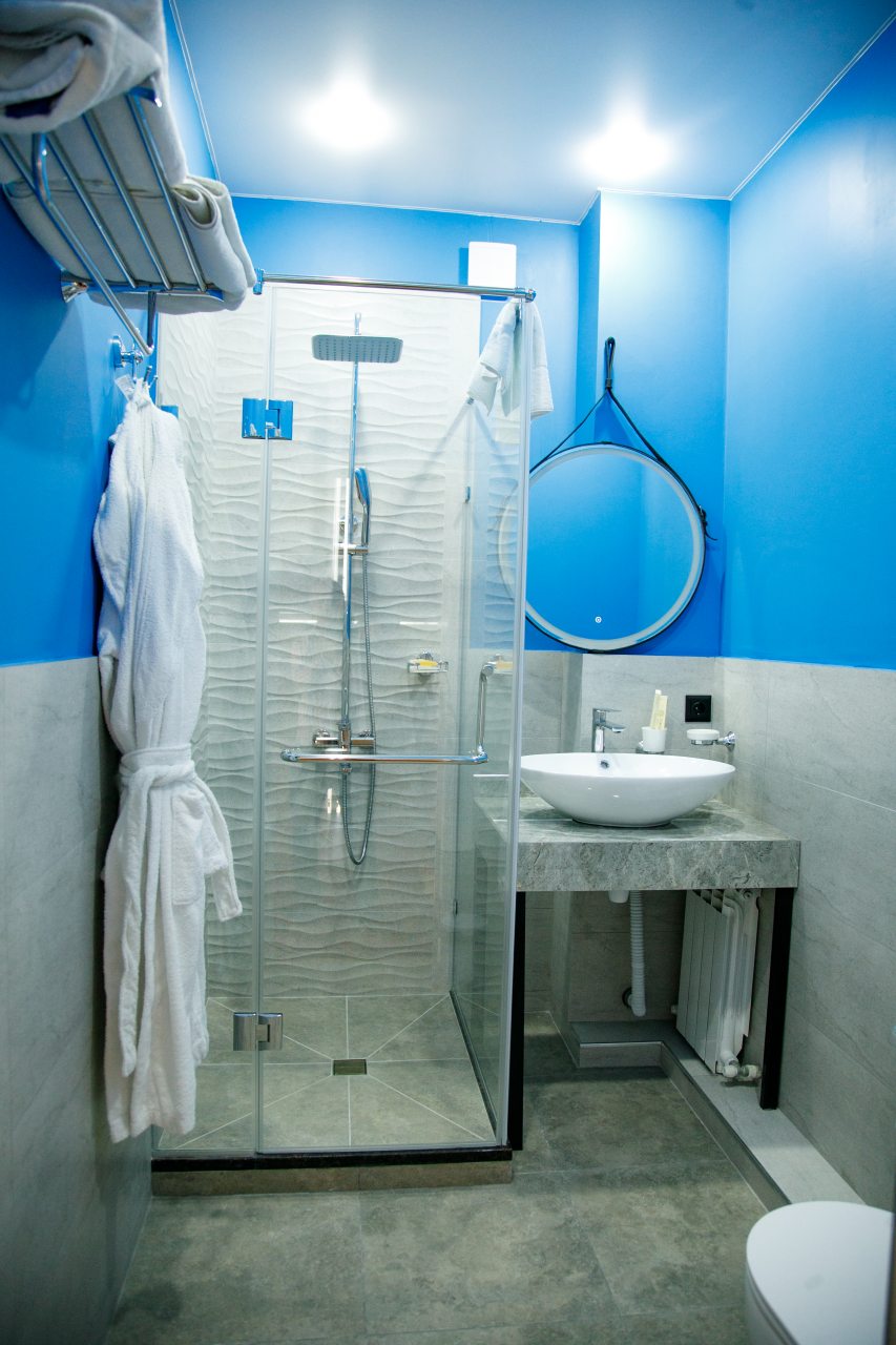 Каждый номер, кроме стандартной меблировки имеет в своем оснащении современный телевизор и электрический чайник. Санузел в зависимости от категории может быть оборудован душевой кабиной или полноценной ванной. Тапочки и халаты предоставляются без дополнительной оплаты и подготовлены по количеству гостей.