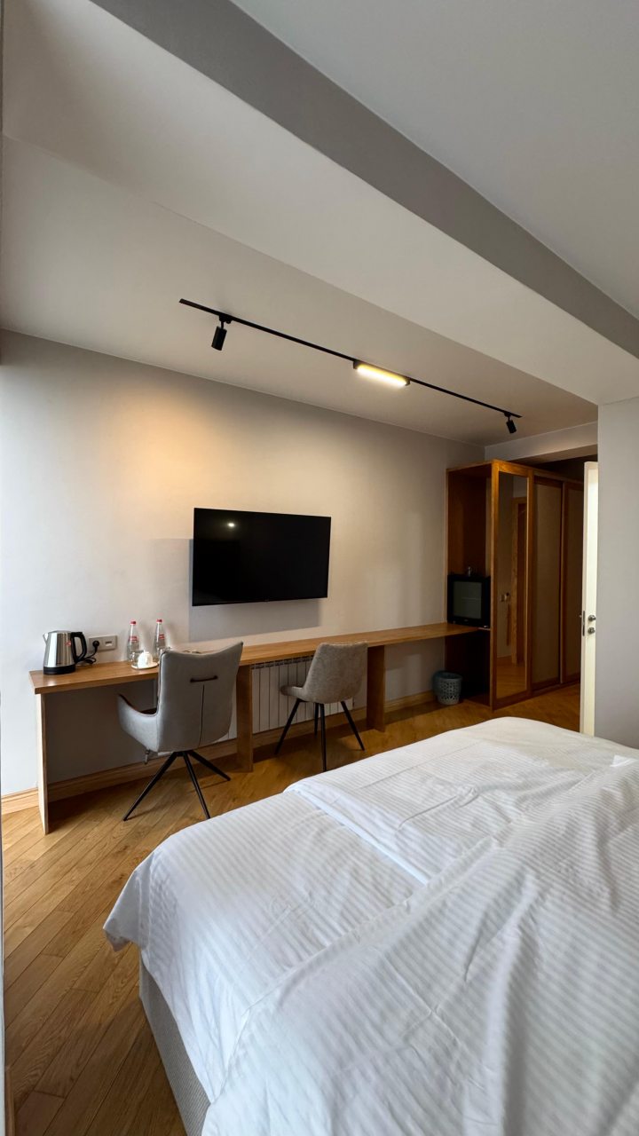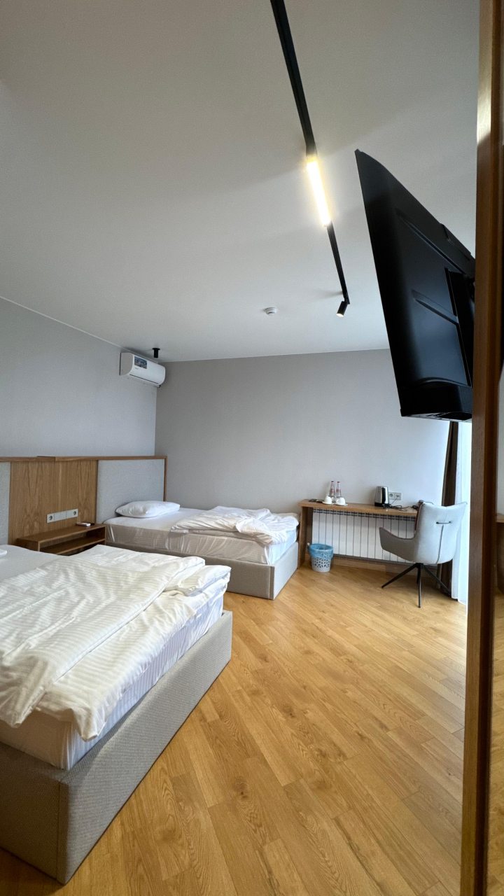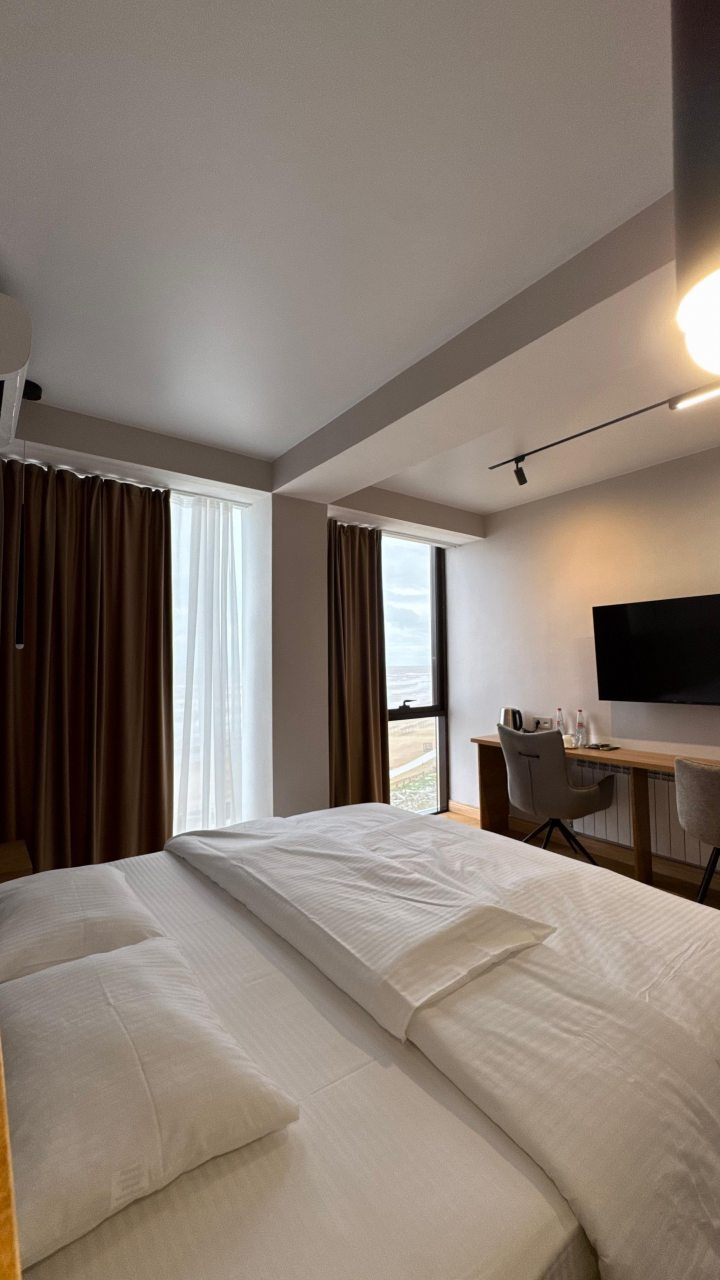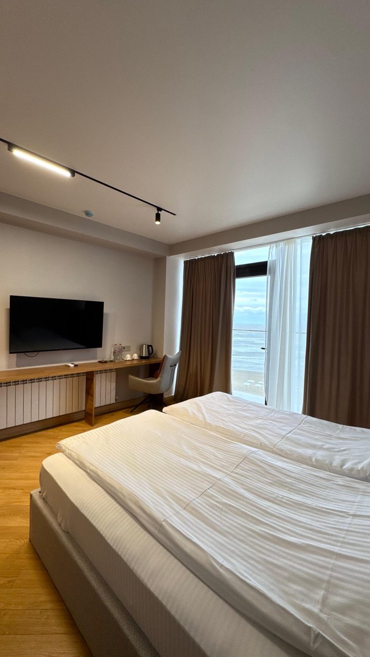 Уборка проводилась ежедневно, полотенца менялись ежедневно. В наличии были халаты и полотенца. Тапочки нам не положили, но это было не критично, так как были свои. В номере есть ковер (чистый) . Воду по 2 бутылки ставят ежедневно, чай, кофе обновляют. Холодильник и чайник электрический в отличном состоянии, пользовались, все устраивало. Вайфай работал отлично. Телевизор был с выходом в интернет, что очень удобно.Несмотря на то, что номер был с видом на море, никто не прописал, что это и вид на проезжую часть) Хочу отметить что это никак не повлияло на мой чуткий сон. Ночью спокойно, высыпались. Нормальных фото номера не делала, есть кадр с видео которое снимала. Сам номер просторный, тихий