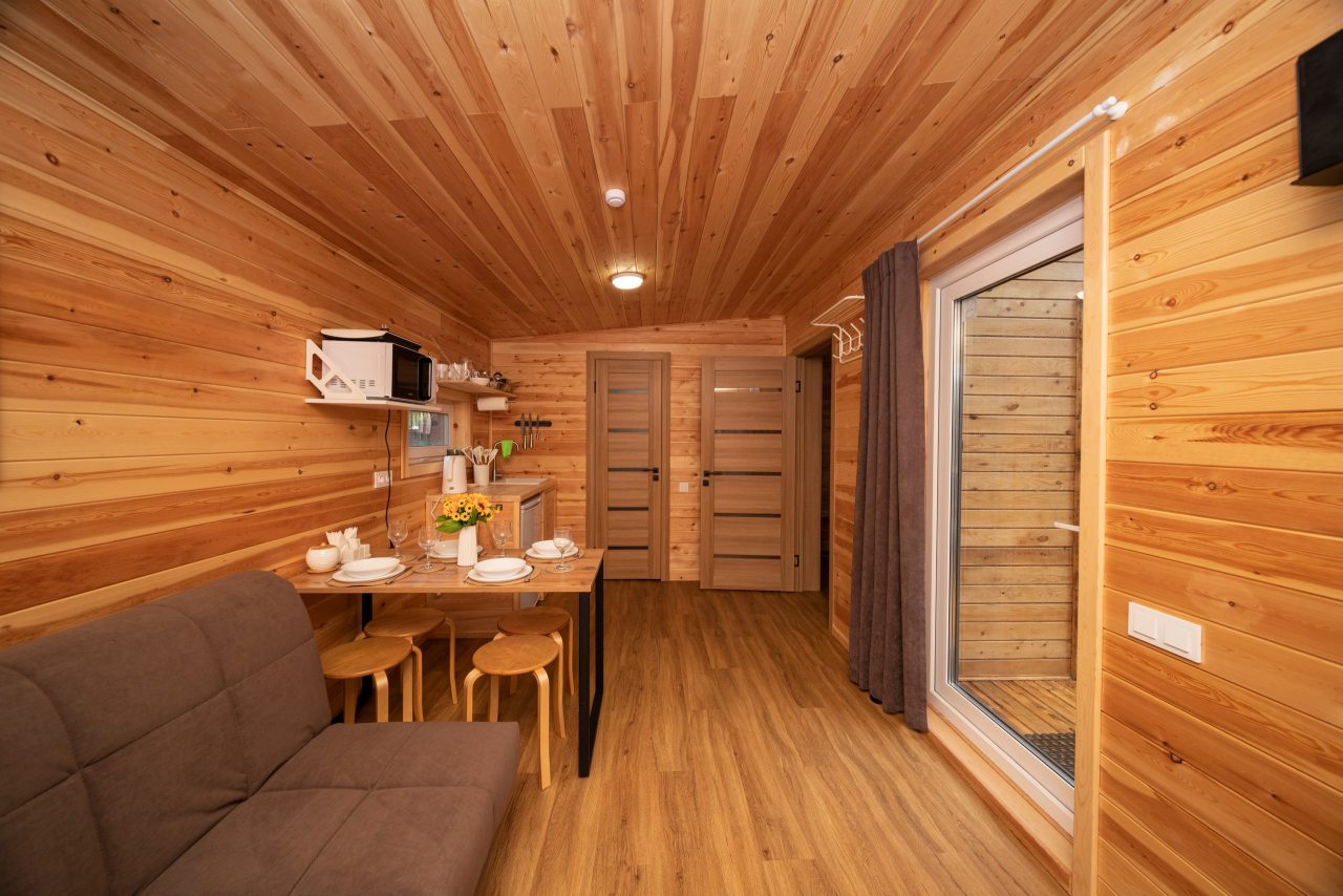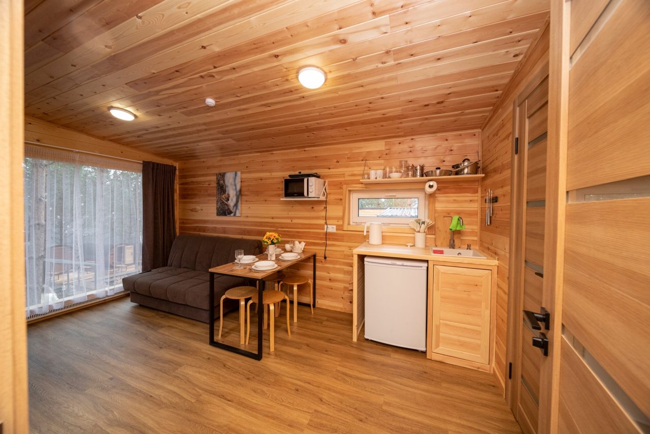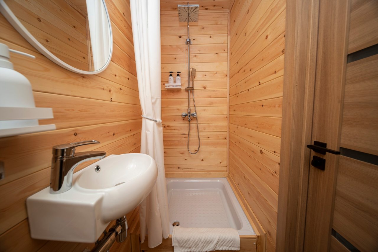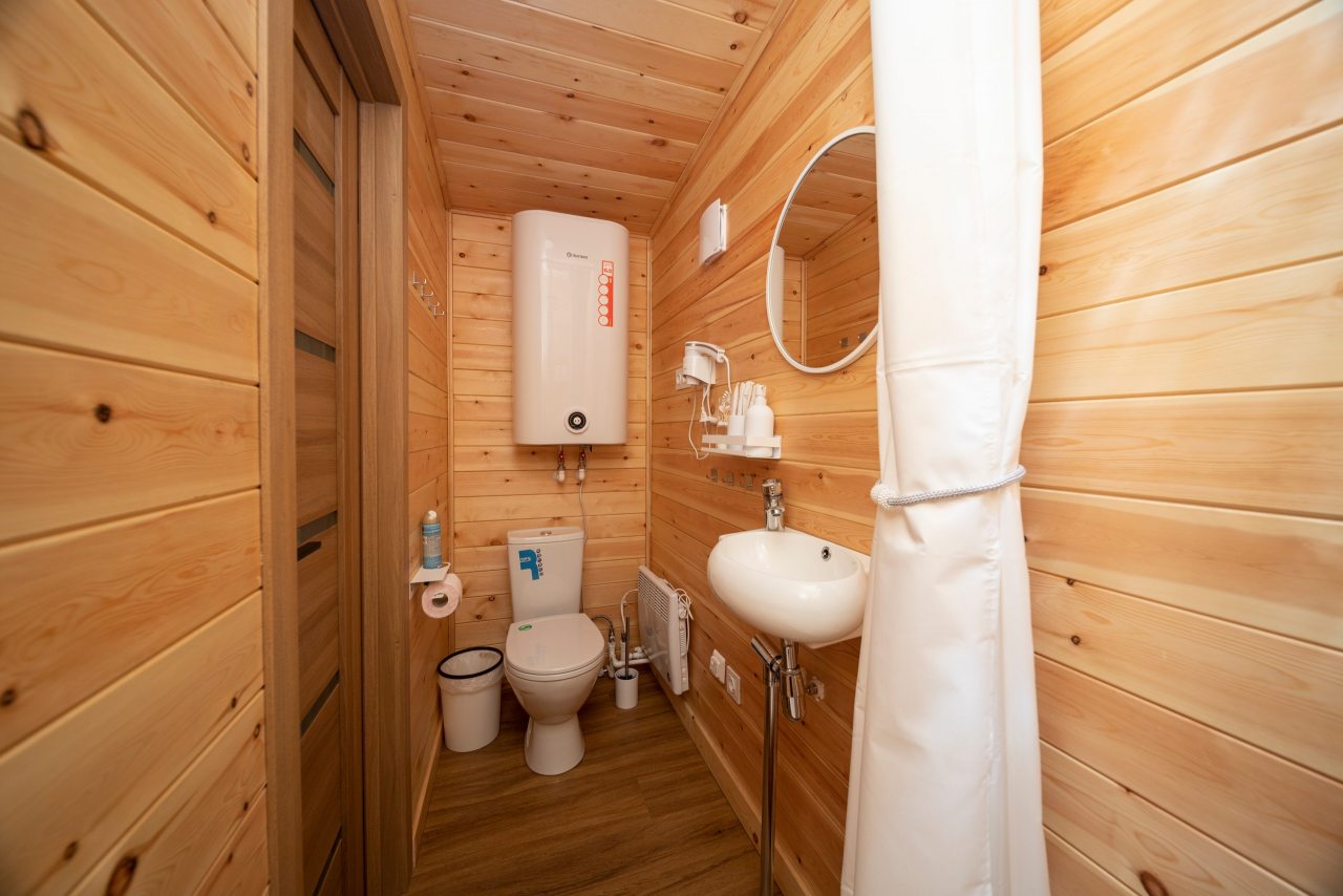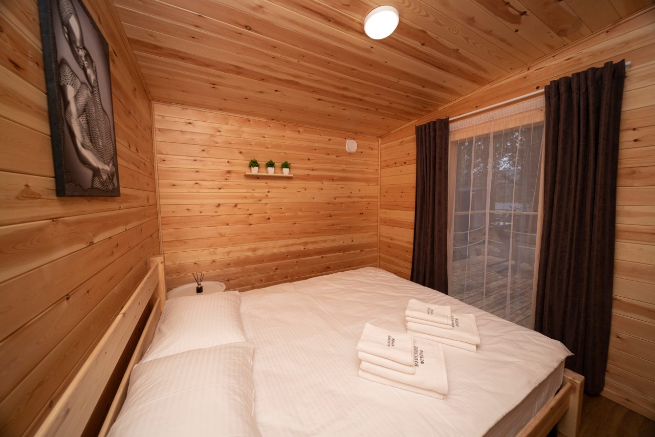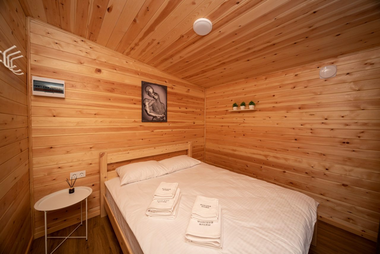 Для размещения отдыхающих представлен уютный и компактный домик, выполненный из натуральных материалов. Он оснащен: двуспальной кроватью, белоснежным постельным бельем, телевизором для просмотра передач и собственным санузлом с набором гигиенических средств и полотенец.