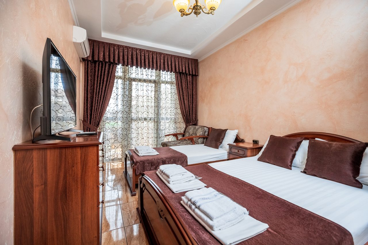 Номера оформлены в приятных тонах и оборудованы всем необходимым для комфортного проживания. Каждое помещение оснащено удобной мебелью, телевизором и кондиционером. Многие номера имеют выход на балкон, с которого открывается вид на сад.