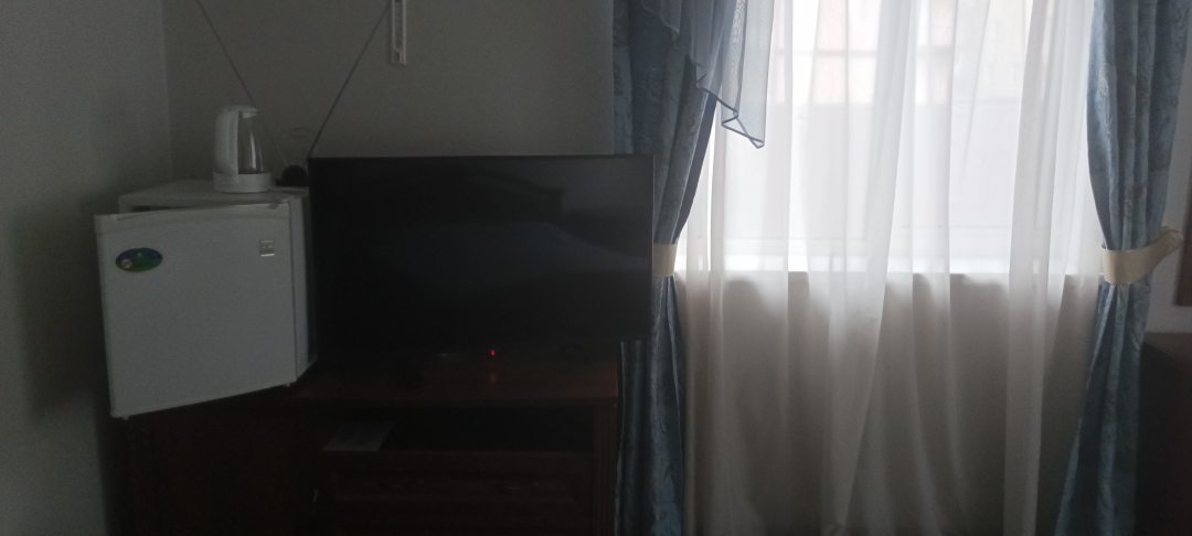 В комнате телевизор, ванная, кровать, холодильник, балкон с видом на горы. Довольно таки чисто, без претензии на lux.