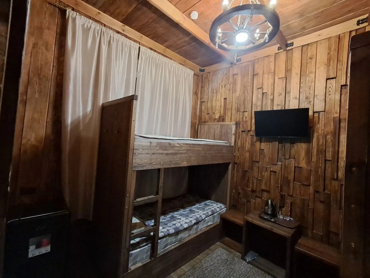 Объект выполнен из срубного дерева, что создает обстановку единения с природой. Предметы мебели также изготовлены из природных материалов, имеется телевизор. Душевая комната совместного пользования и находится на этаже.