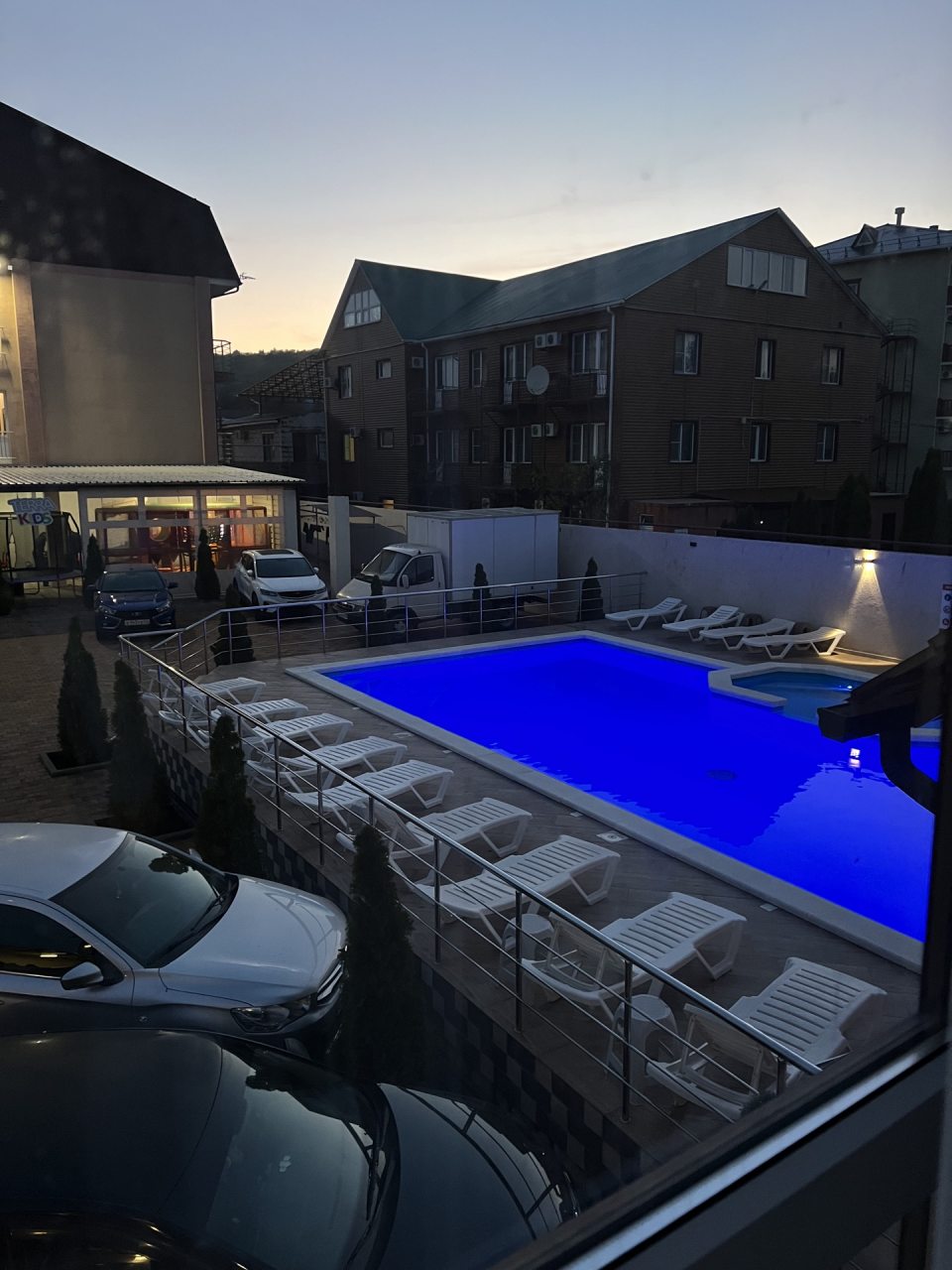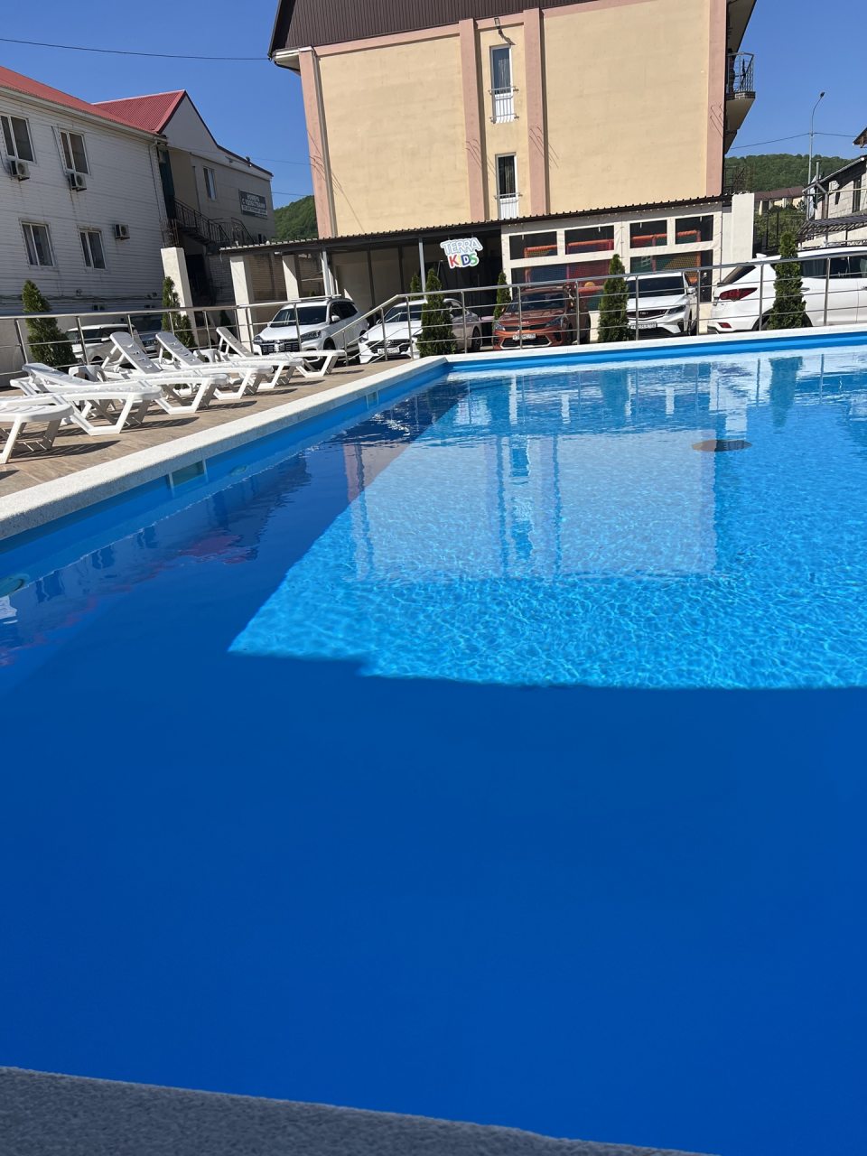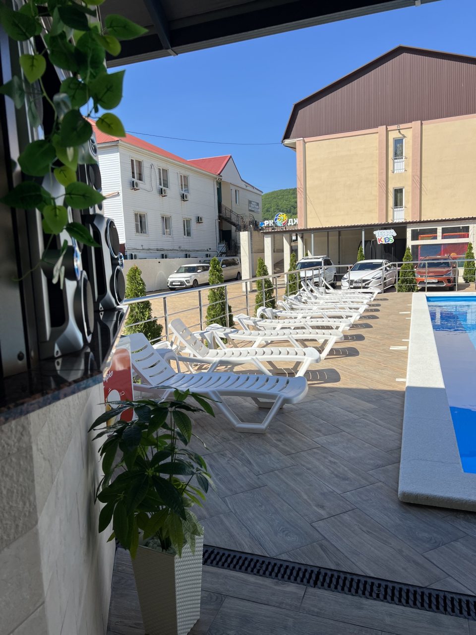 Отличный отель, удобное расположение, напротив аквапарка и до моря не далеко-15 мин. прогулочным шагом. Везде чистота. Прекрасный подогреваемый бассейн с детской зоной. Радует наличие общей кухни на свежем воздухе, под навесом. рядом есть батут и лабиринт для детей, где они находятся под присмотром взрослых. За это прям респект от семей с маленькими детьми!)