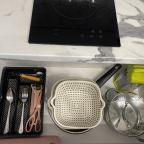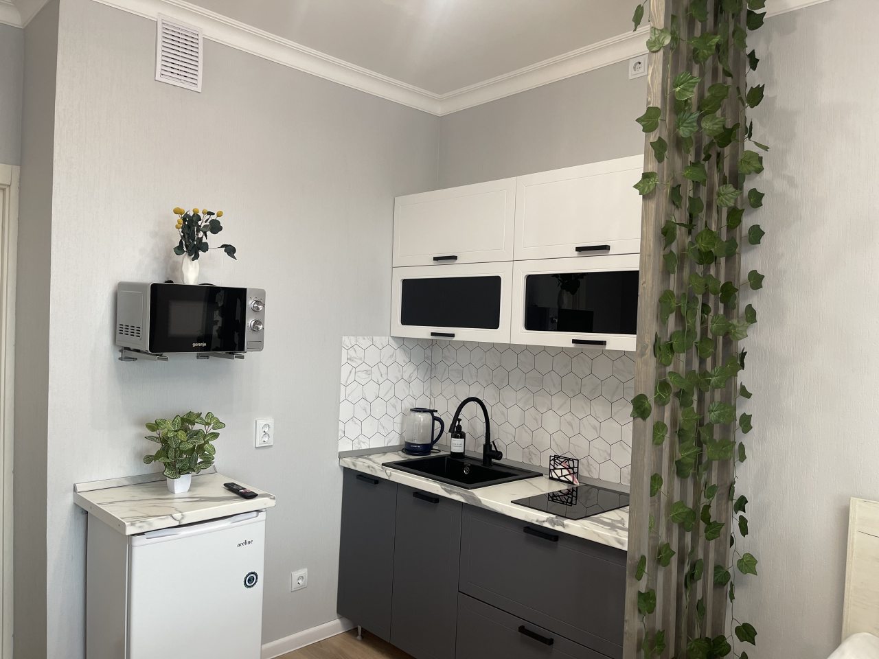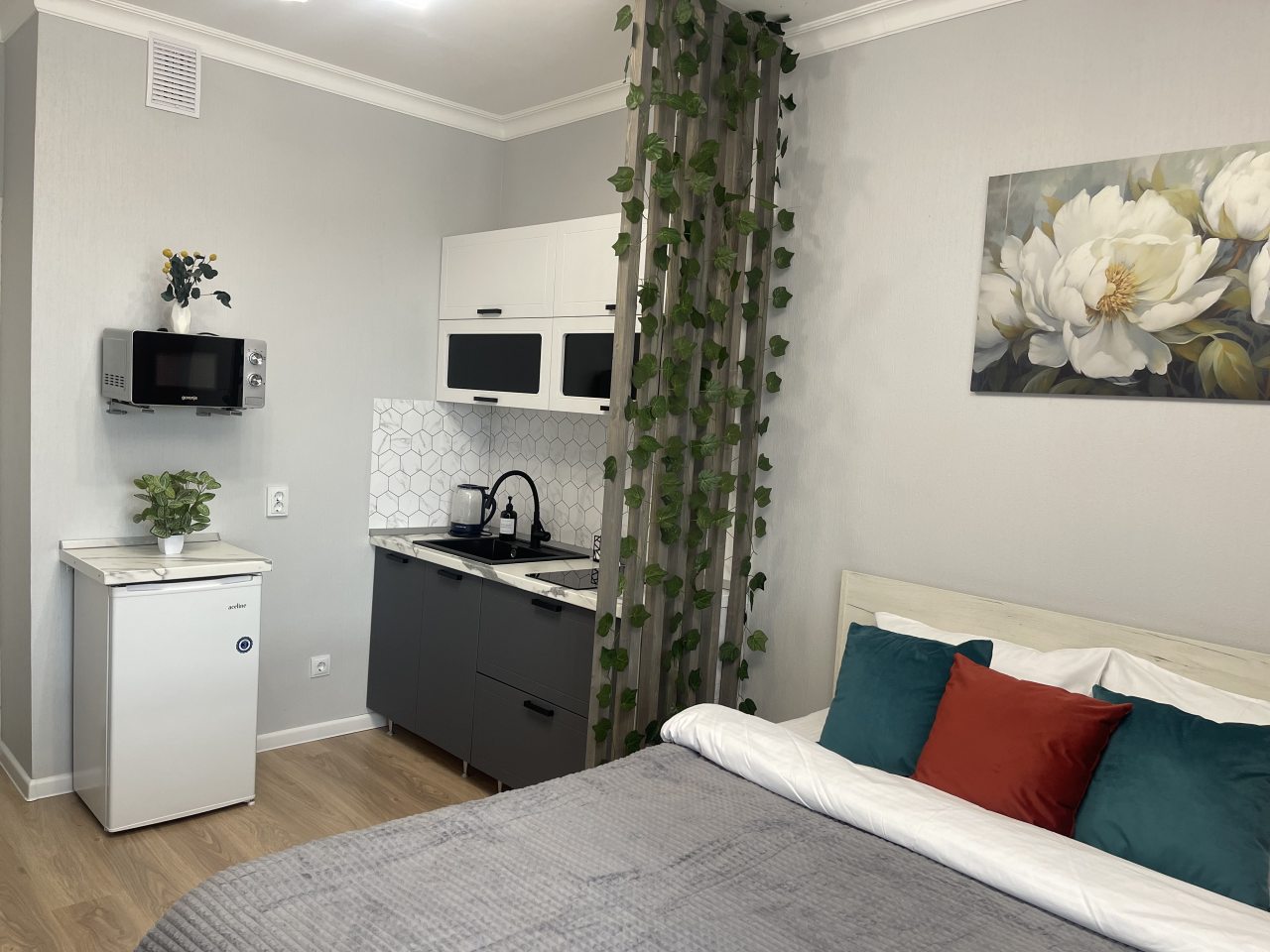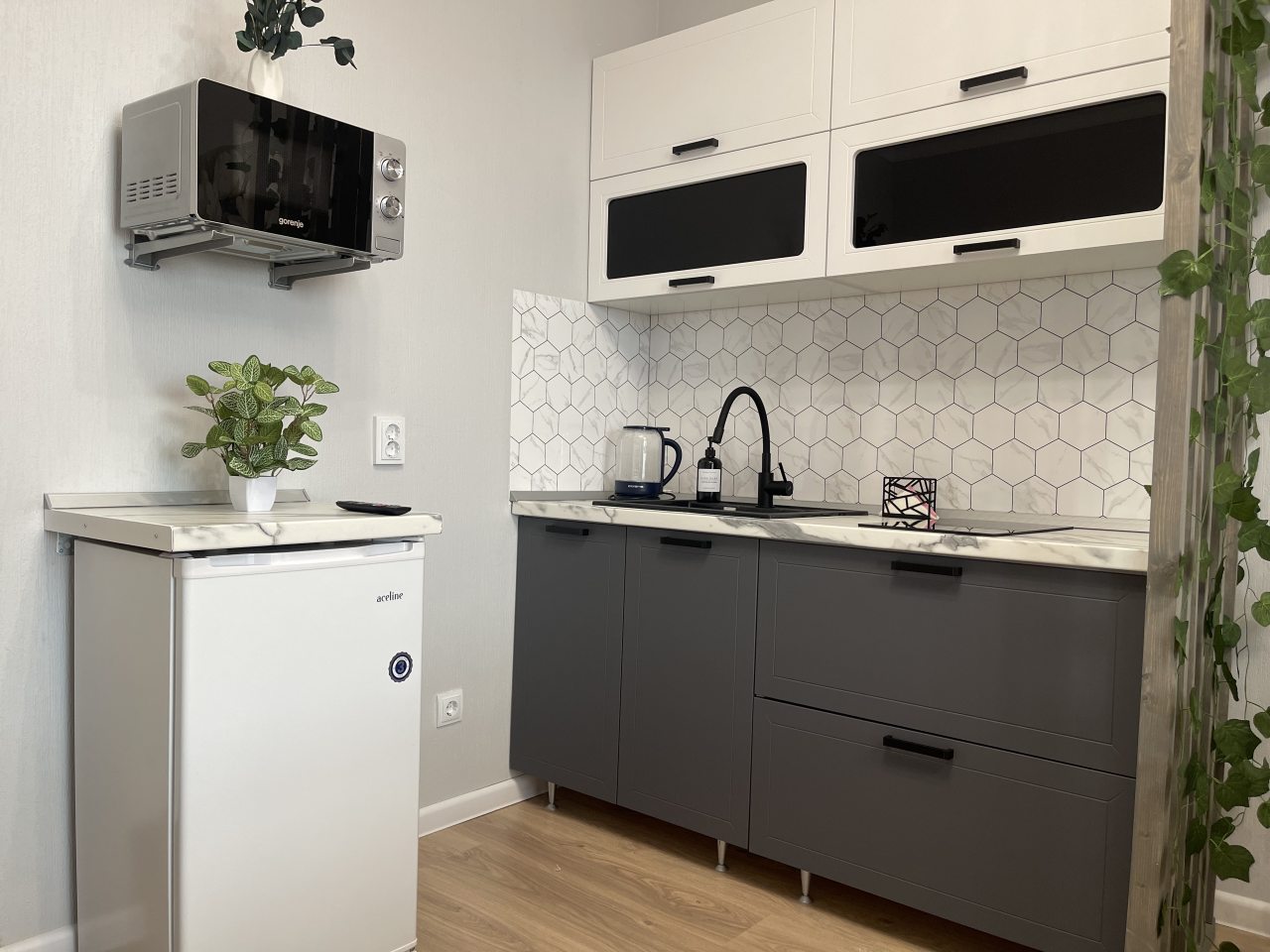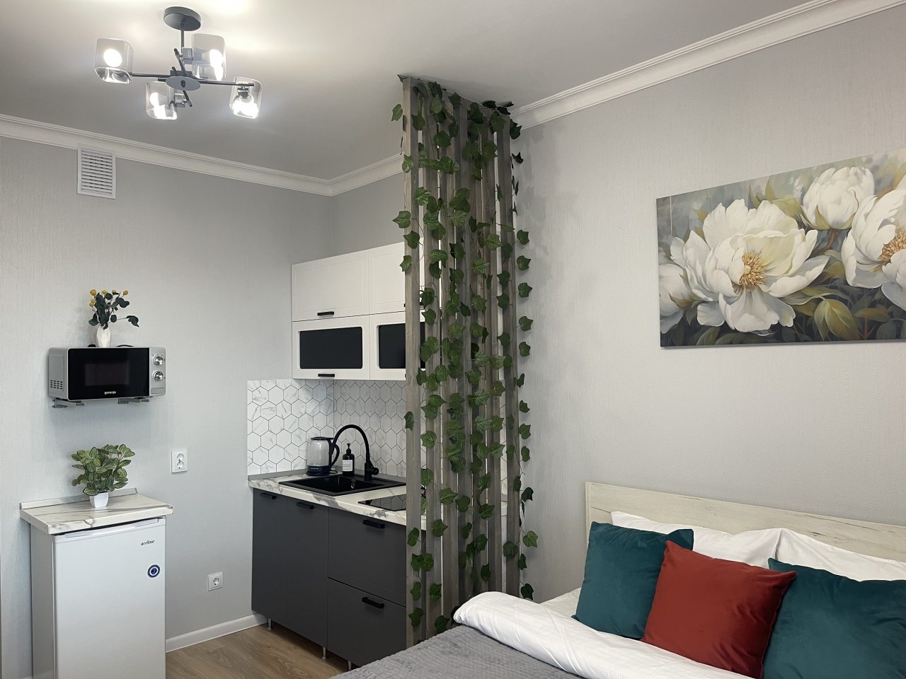 Кухня имеет гарнитур, электрочайник, варочную панель, холодильник, микроволновую печь. В доступности продуктовые магазины и кофейня.