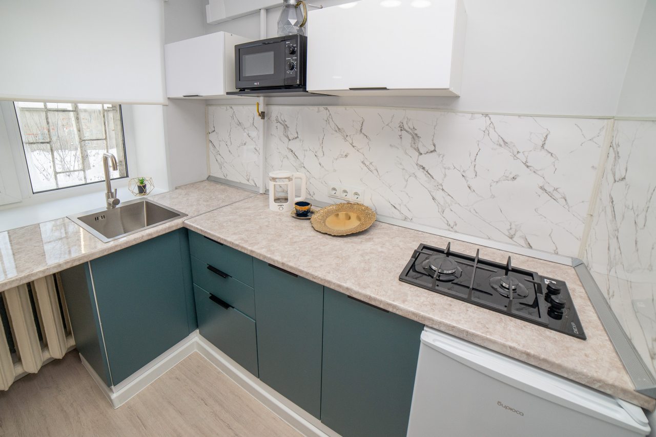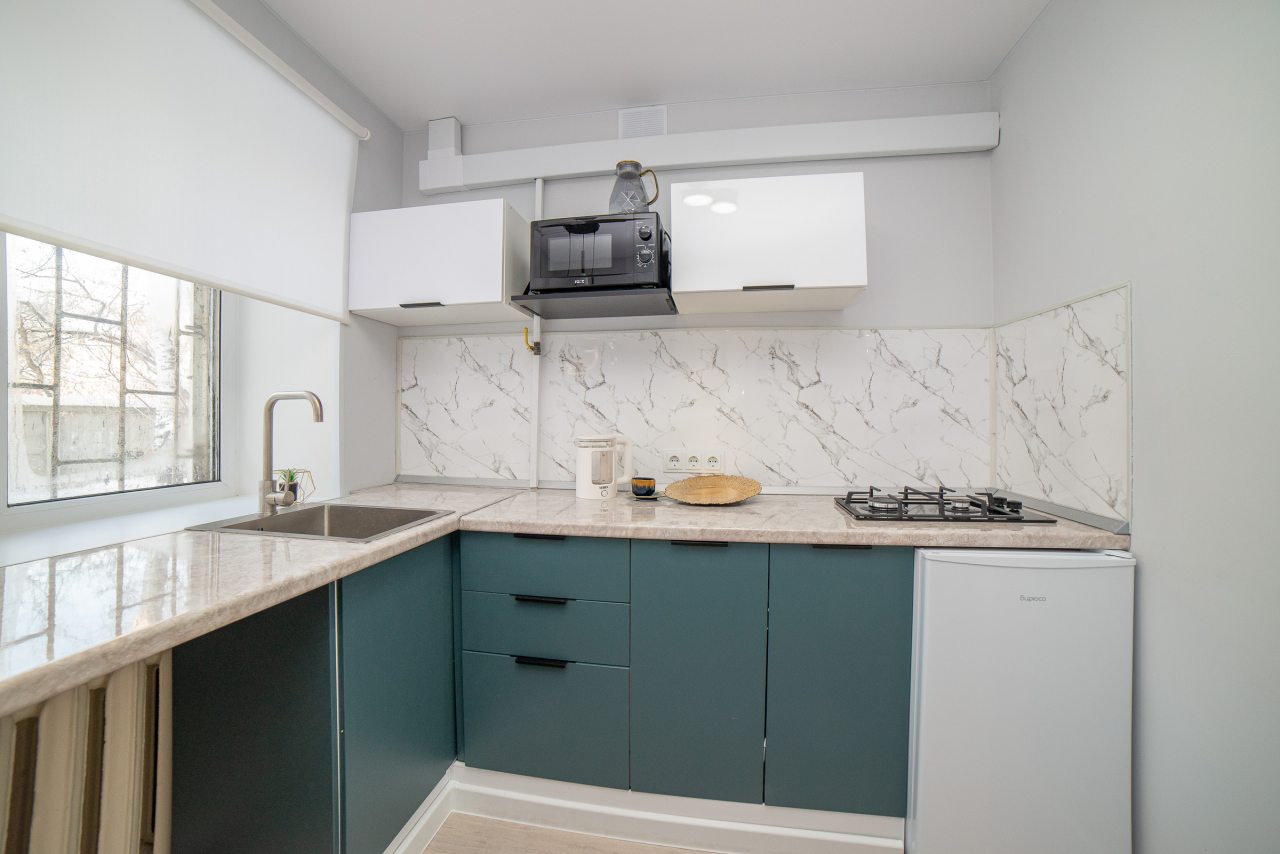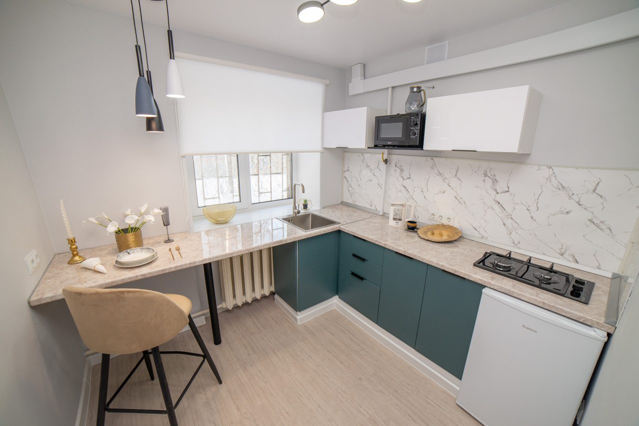 Просторная кухня оборудована стильным гарнитуром, газовой плитой, холодильником, микроволновой печью, электрочайником. Пообедать можно в ближайшем кафе. В доступности большой выбор продовольственных магазинов.